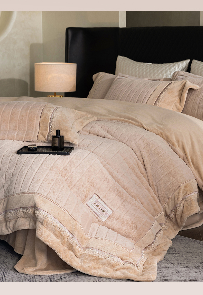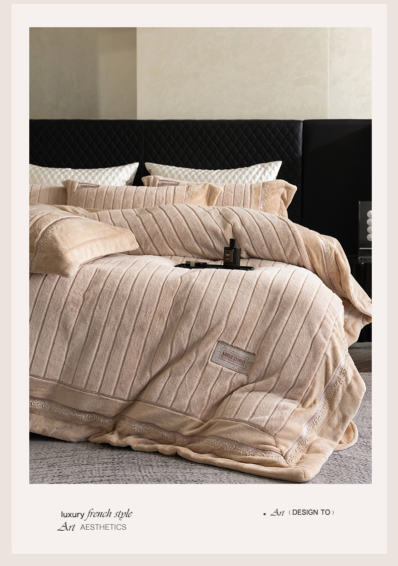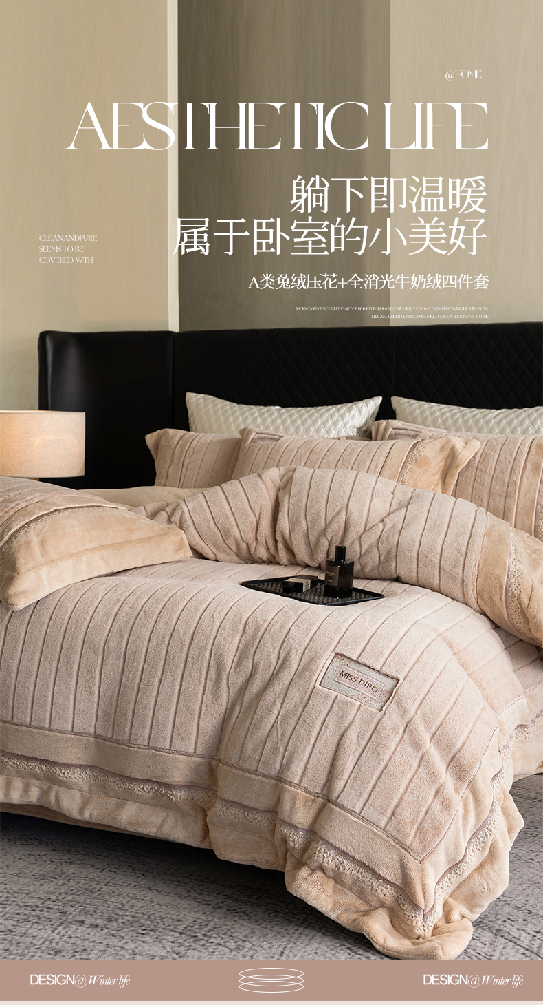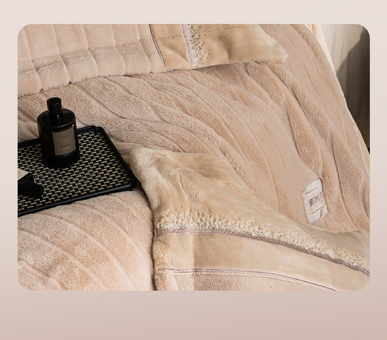 商品名称:鼎飞家纺 2025新款A类兔绒压花+全消光牛奶绒四件套--贝尔雅系列 贝尔雅-奶咖