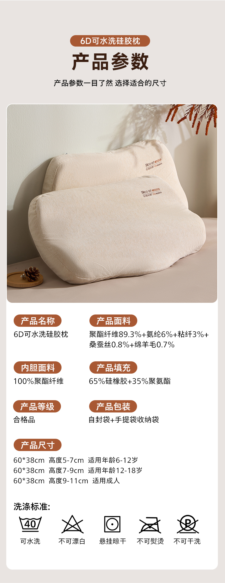 (总)微枕芯 2025新款6D可水洗硅胶枕,儿童枕6-12岁(5-7cm),儿童枕12-18岁(7-9cm),成人枕(9-11cm)
