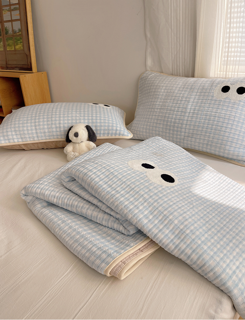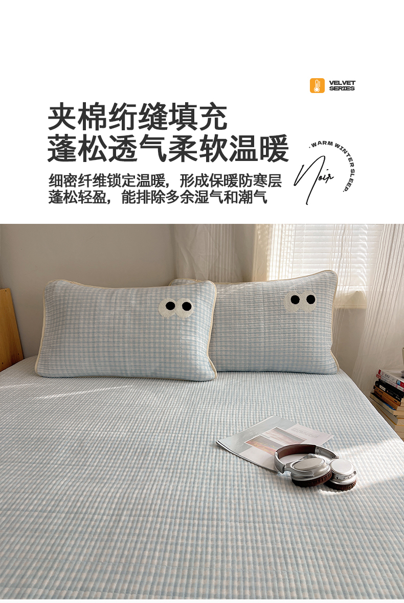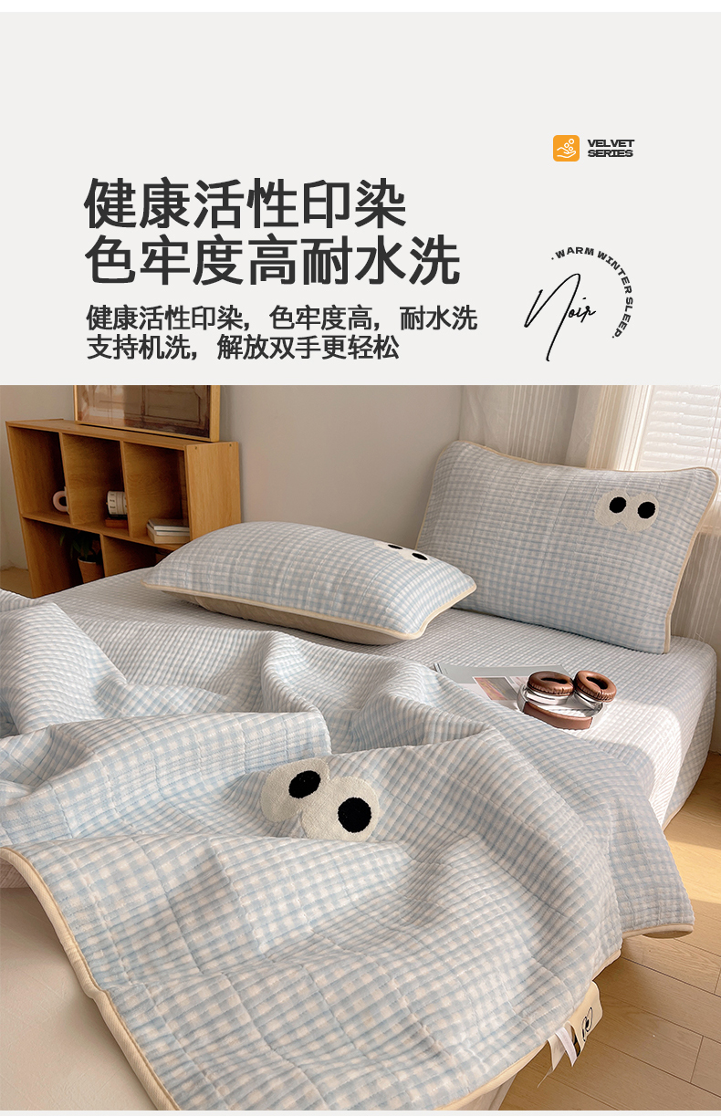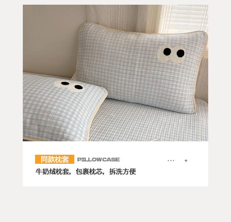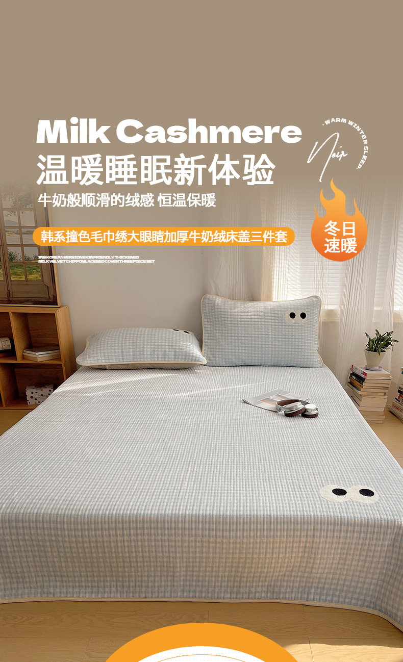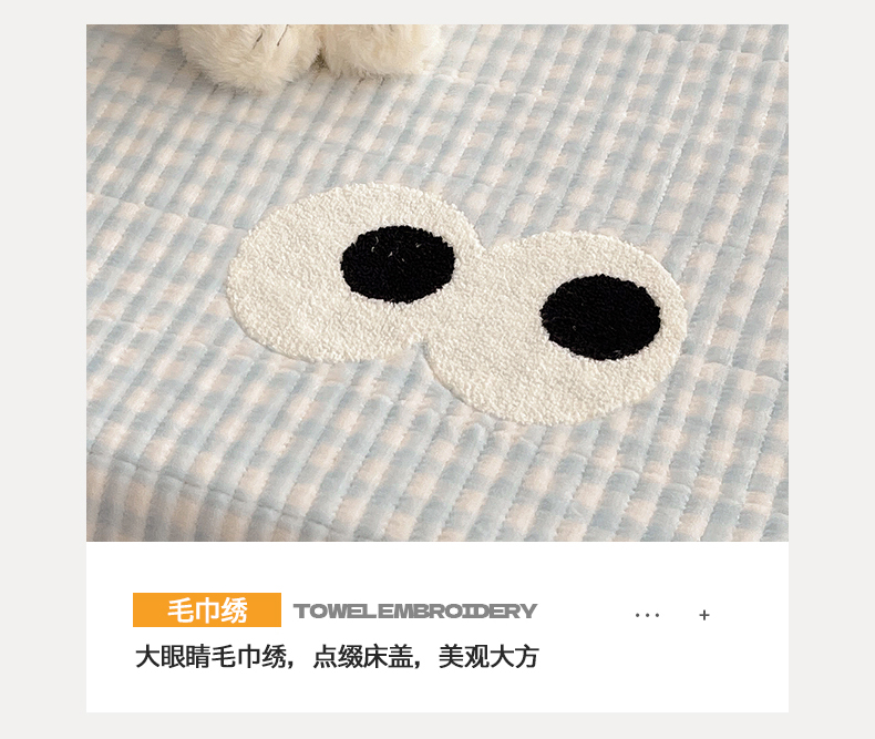 • 91家纺网 家纺一手货源 找家纺 桃子家居 2025新款韩系撞色毛巾绣大眼睛加厚牛奶绒多功能床盖三件套单品 绒床盖-毛巾绣大眼蓝格