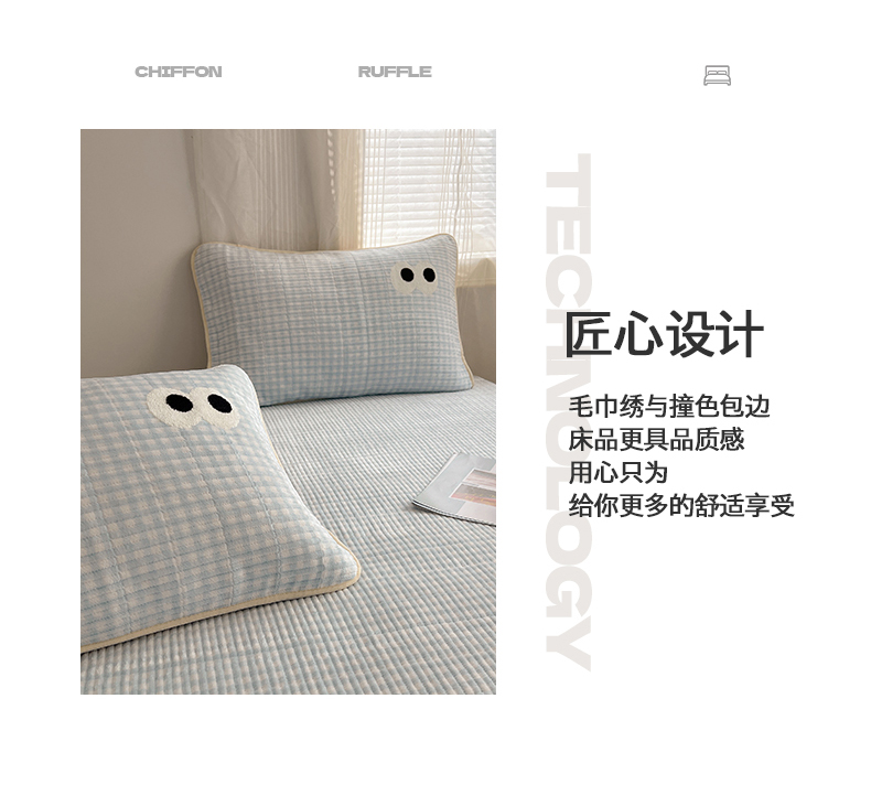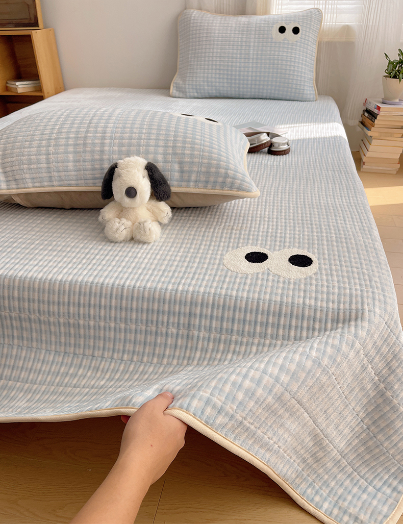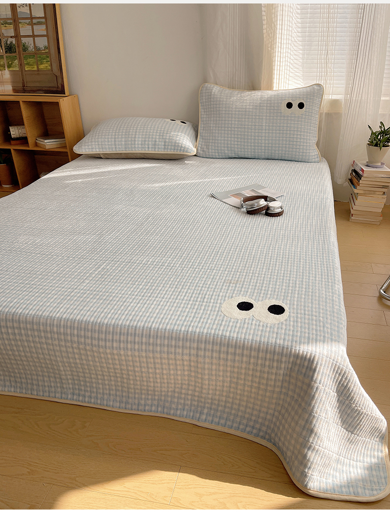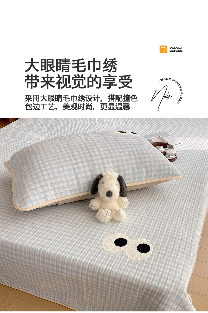 桃子家居 2025新款韩系撞色毛巾绣大眼睛加厚牛奶绒多功能床盖三件套单品 绒床盖-毛巾绣大眼蓝格