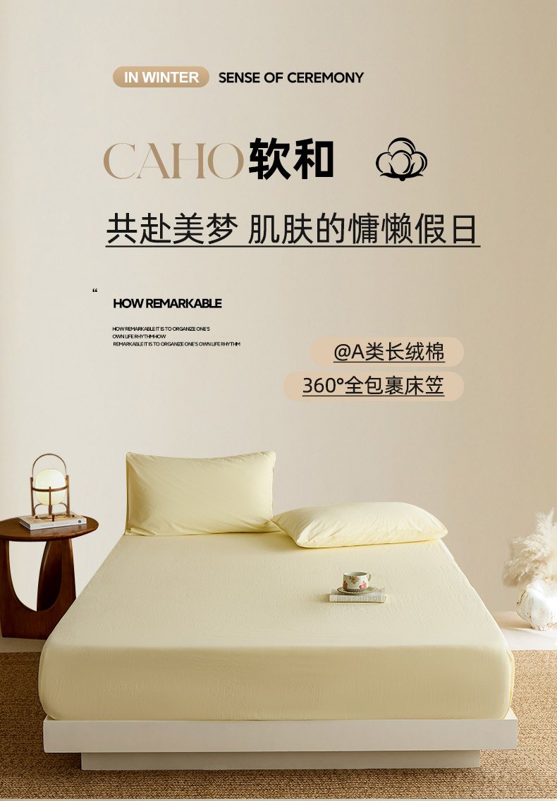 轩和家居 2025新款全棉高支旧感砂洗长绒棉单床笠 淡黄色