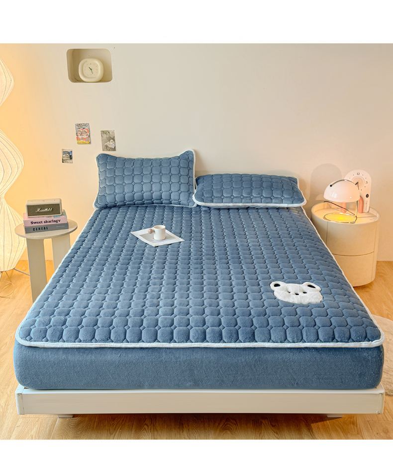 予梦家纺 2025秋冬新款牛奶绒加厚刺绣夹棉单床笠床垫子保护套秋冬保暖床罩子三件套 丽桑卓-小白熊蓝