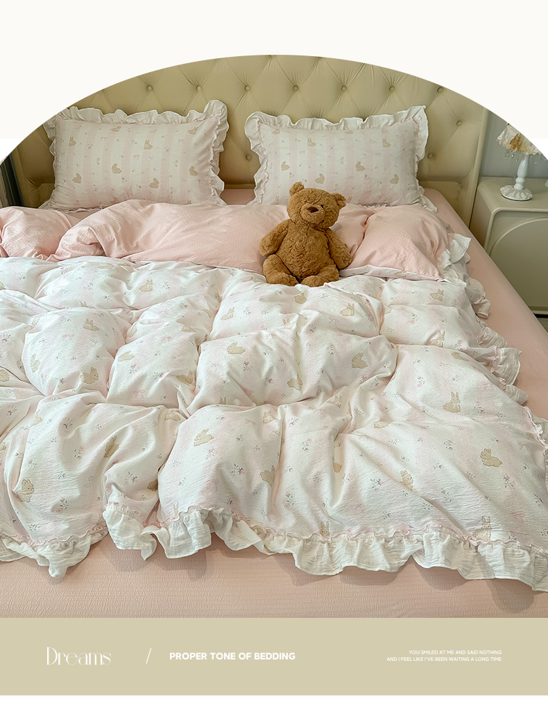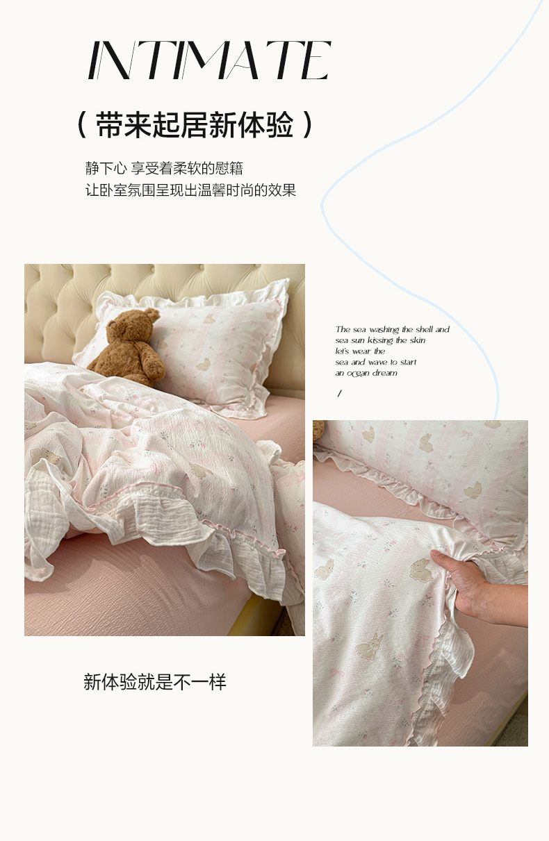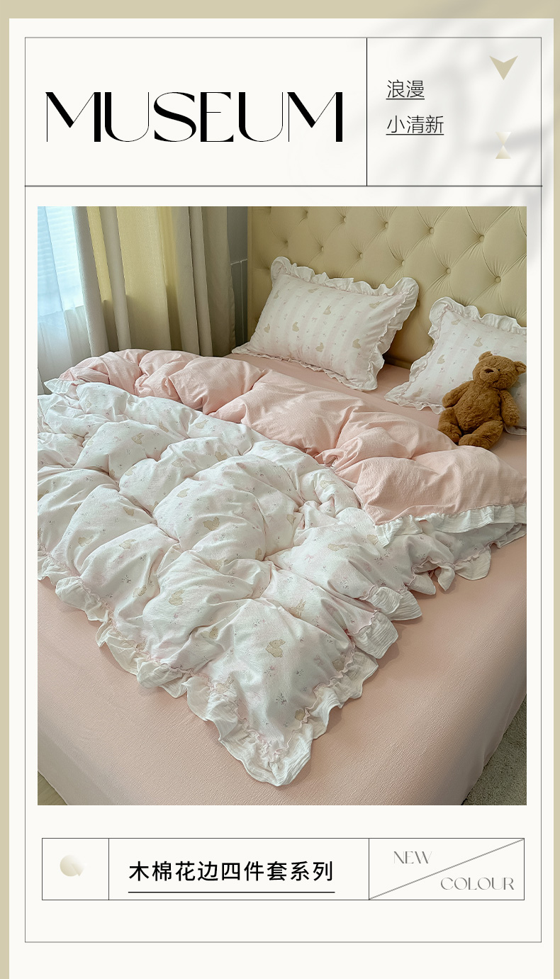 当前位置: 91家纺网 > 商品网购 > 床品套件 > 四件套 > 其它四件套 > 繁花家居 2025新款高弹线云感木棉多层纱花边超软四件套-风格二 小花兔兔