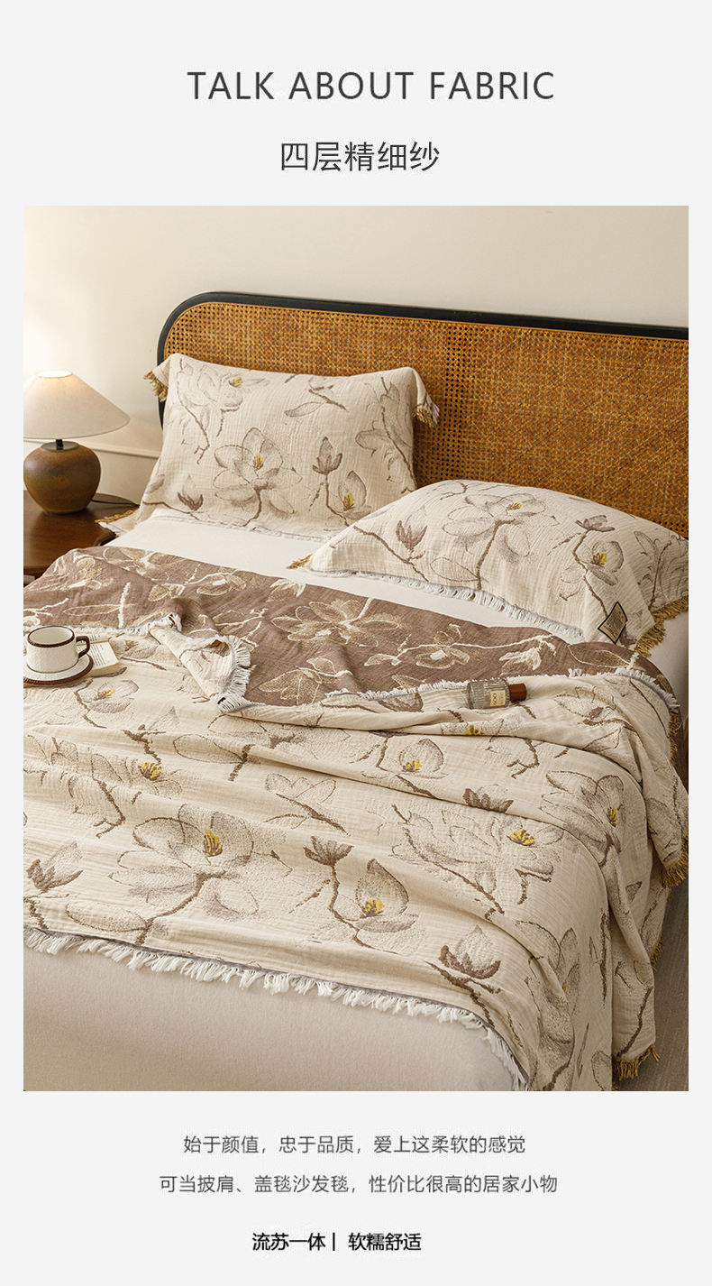 朴尔家纺-毛巾被 2026新款全棉60s精细纱流苏花边四层纱布毛巾被 芝芝梅