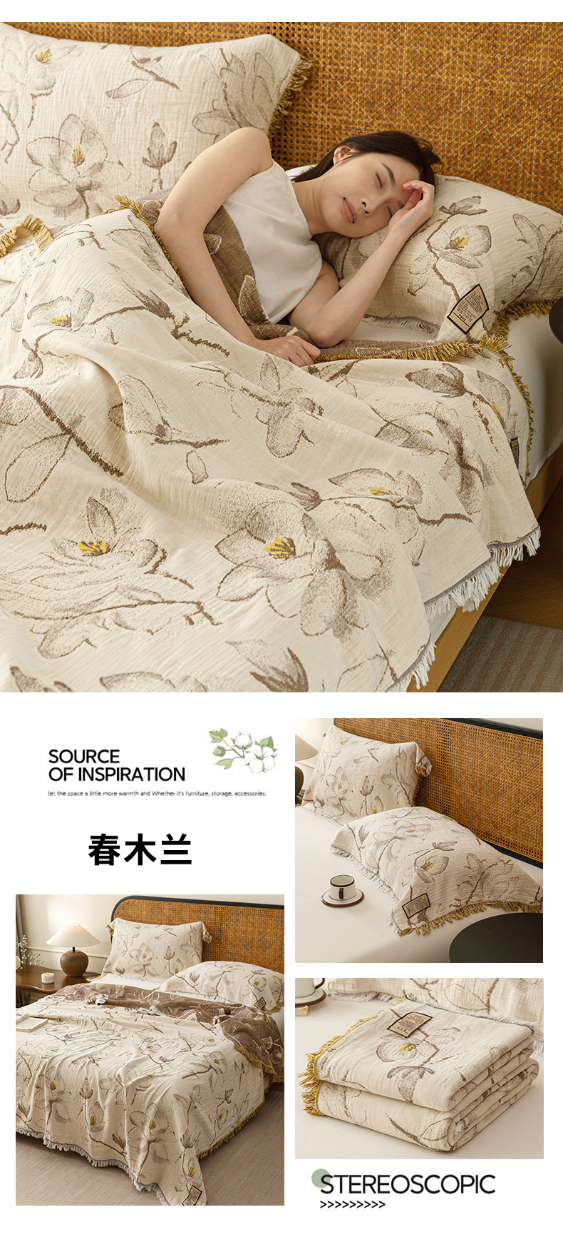 (总)朴尔家纺-毛巾被 2026新款全棉60s精细纱流苏花边四层纱布毛巾被,春木兰,花饰,兰草情,蓝色随想,暖阳,樱花恋,芝芝梅,竹意,组合图