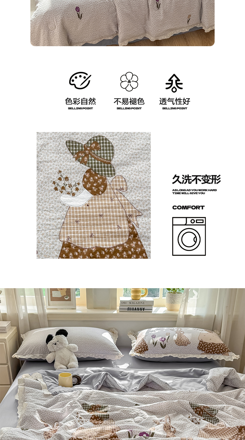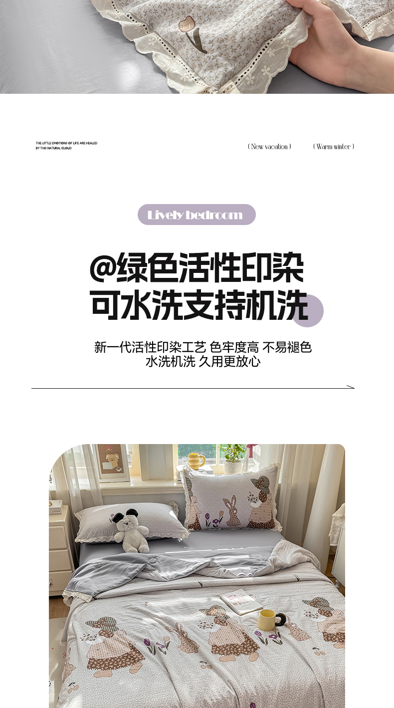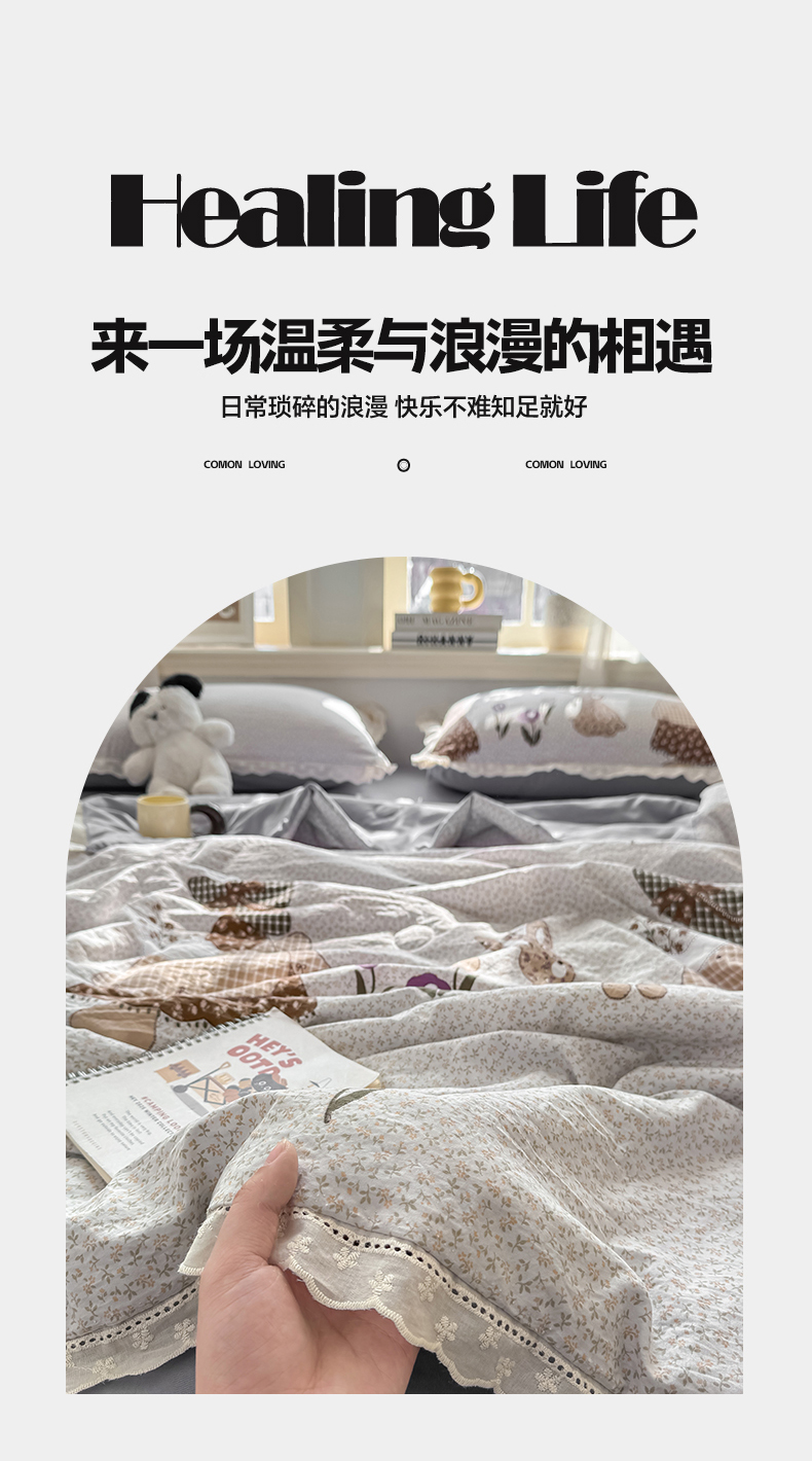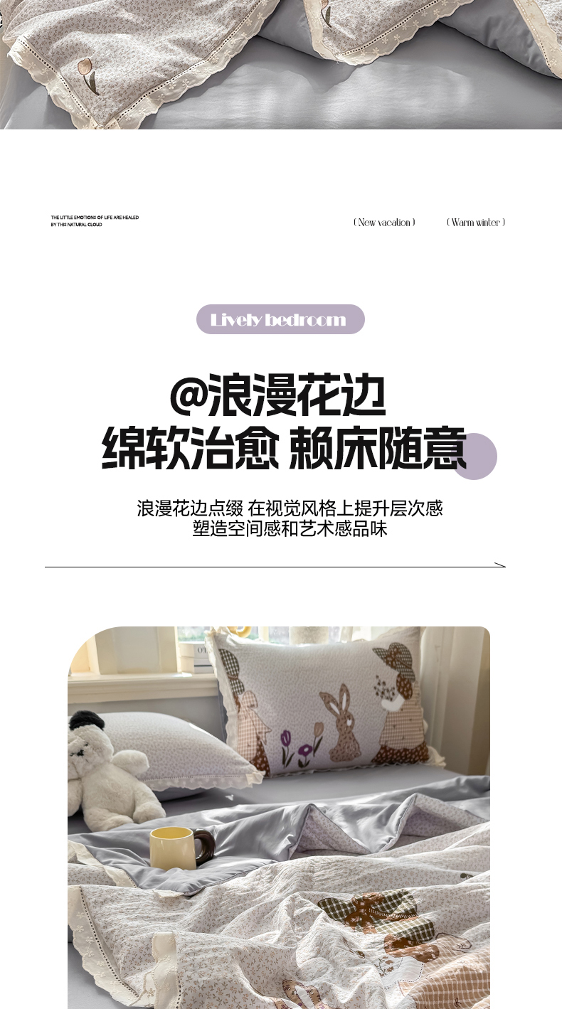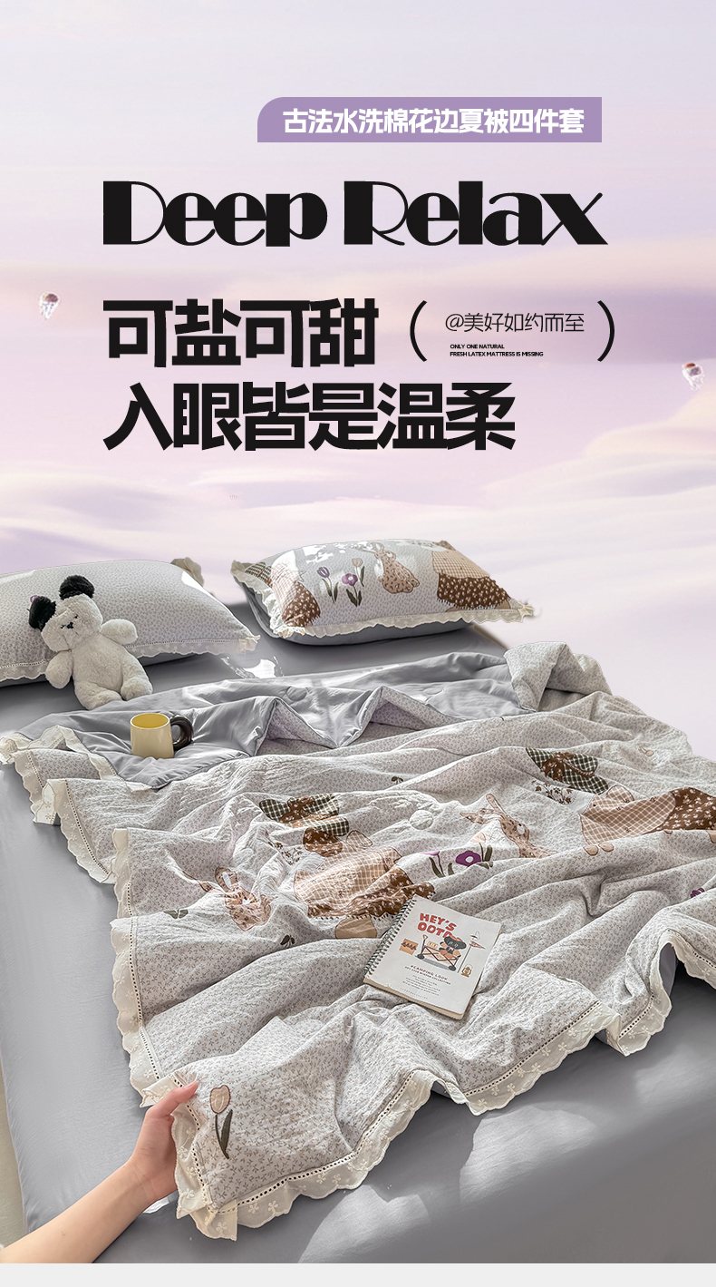 (总)憨豆家纺 2026春夏新款古法仿棉夏被四件套镂空花边大板印花夏凉被空调被(含抗菌纤维),采菇兔-粉,一束繁花,安娜花园,采菇兔-灰,花之邂逅,梦马生花,情同手足,小熊烂漫