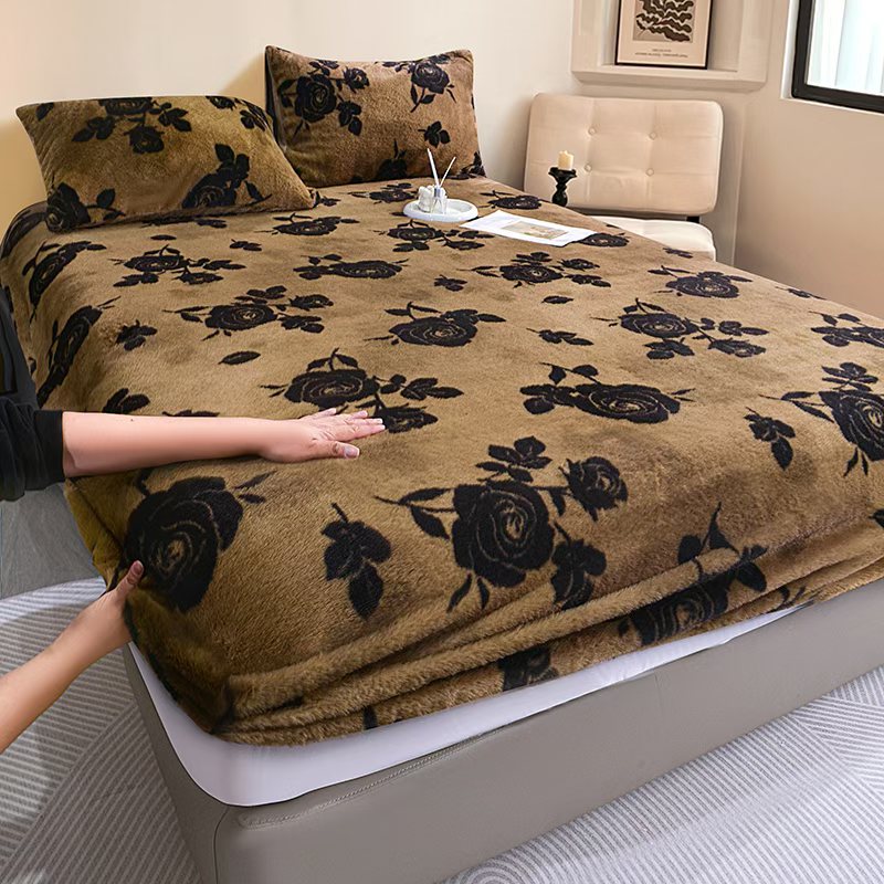 (总)梦纤绒 2026新款兔毛单品床笠单件床笠三件套,豹纹咖,黑玫瑰棕,咖啡花朵