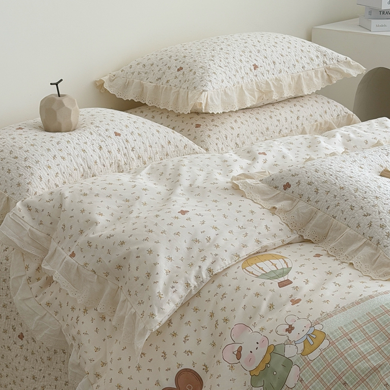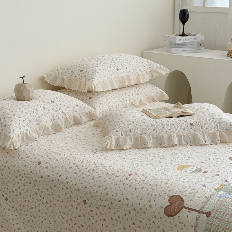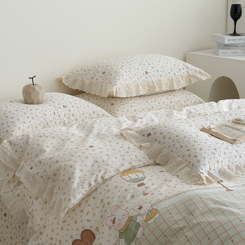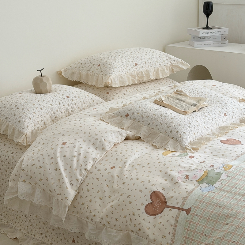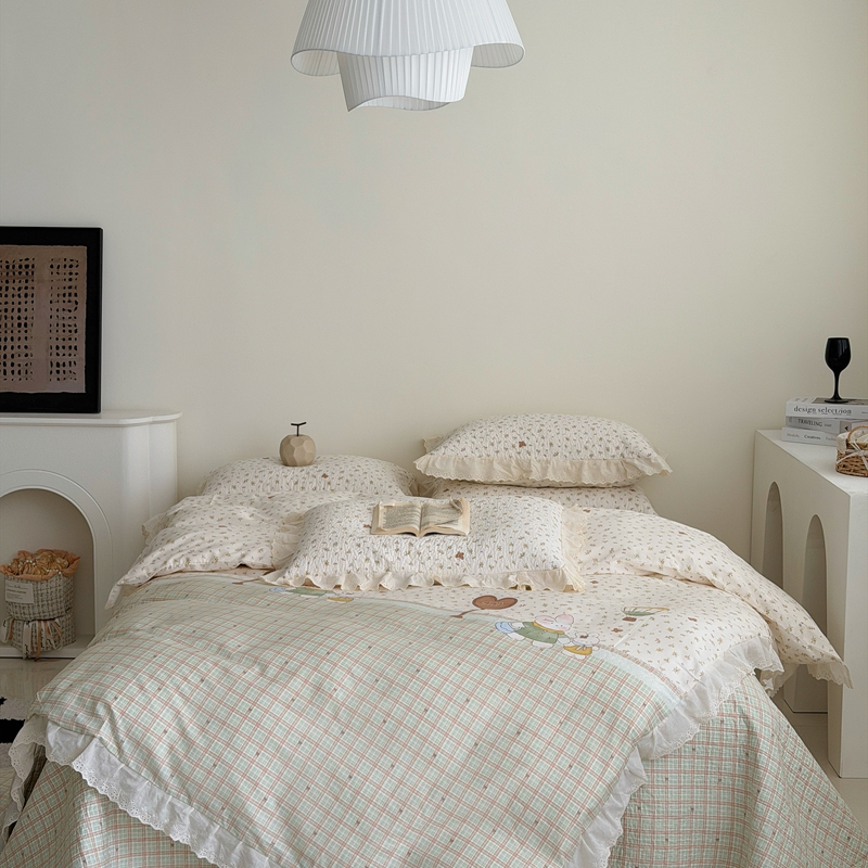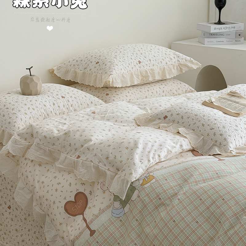 佰织鑫家居 2026新款全棉法式砂洗棉花床盖款被套四件套 森系小兔