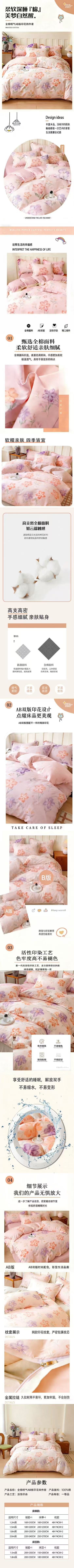 商品名称:U品汇 2026春夏新品全棉纯棉长绒棉印花四件套学生三件套100%棉小清新13070 粉色桃花