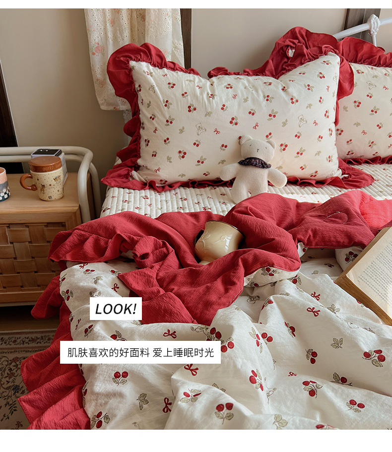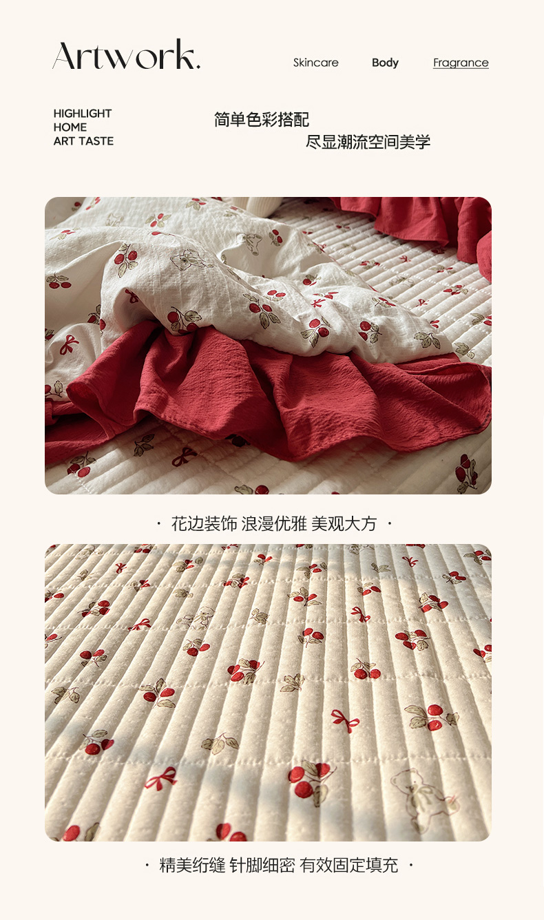 (总)繁花家居 2026新款木棉泡芙感超糯叽叽花边床盖夏被四件套,咖赫本,草莓很甜,蝴蝶梦境,花熊小记,简雅红纹,林间红果,墨喵粉花,桃粉甜心,兔趣花结,殷桃结语