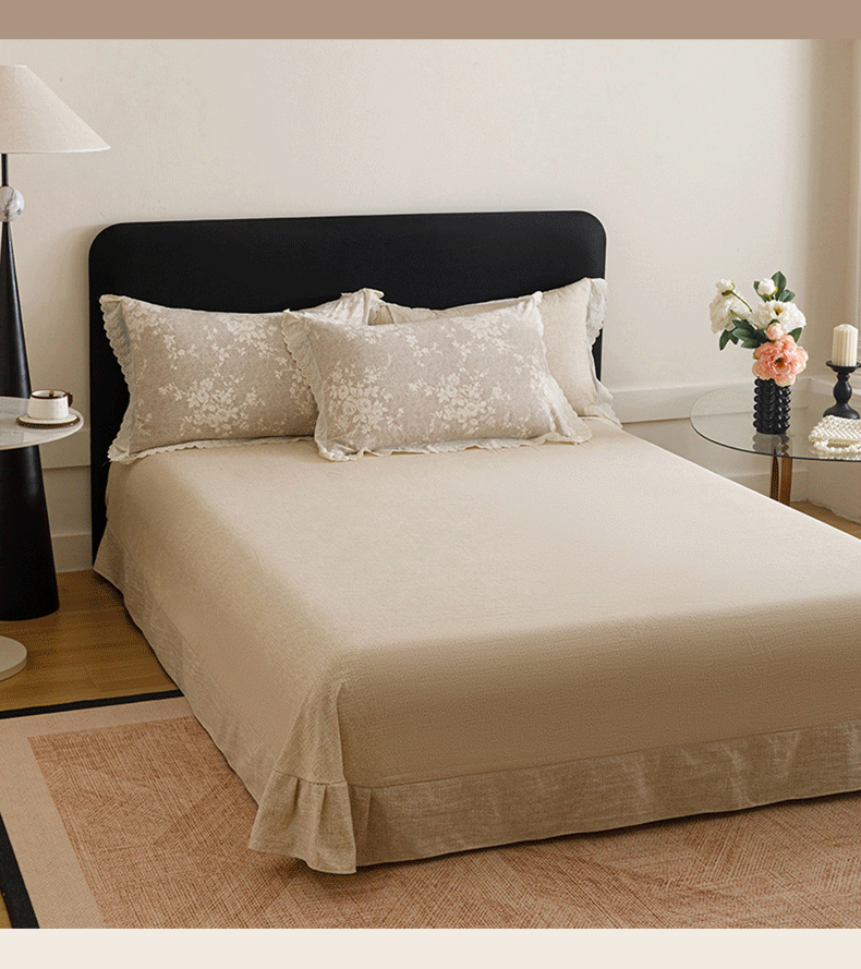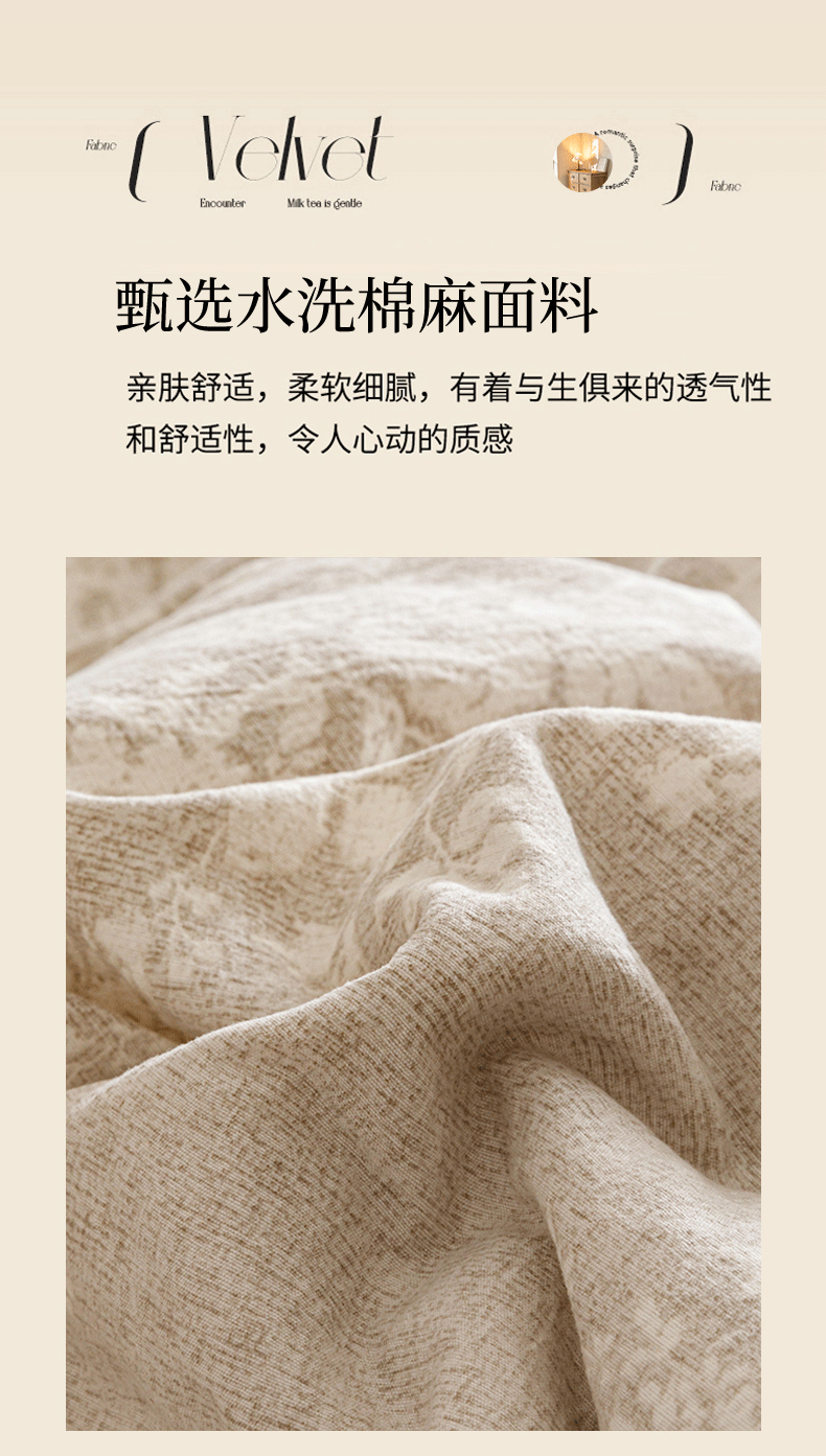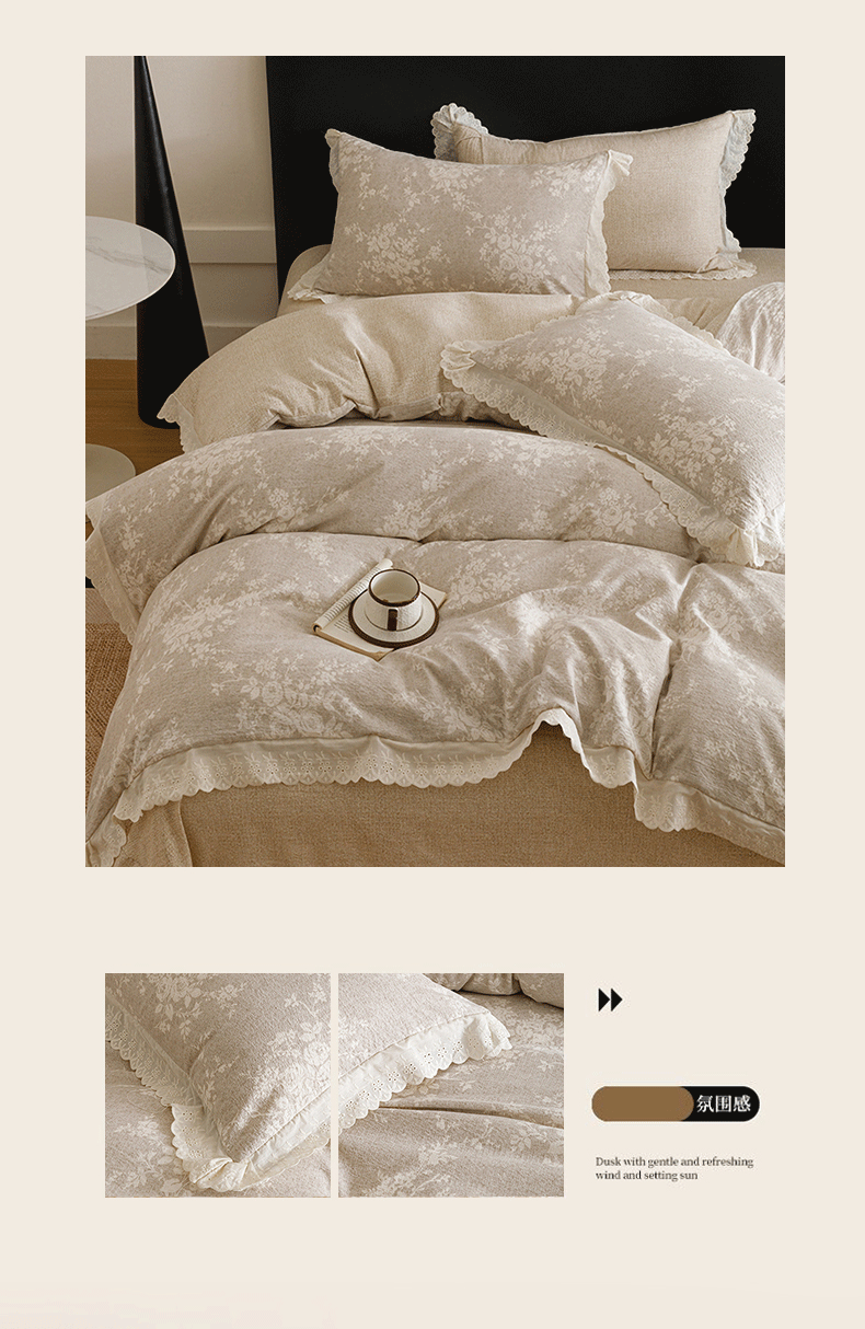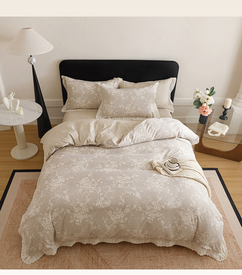 商品名称:悦然毛巾被 2026春夏新款加厚原麻水洗复古风四件套亚麻提花花边四件套 相思叶