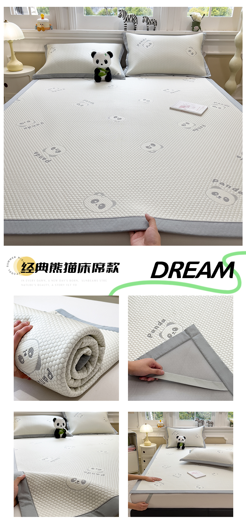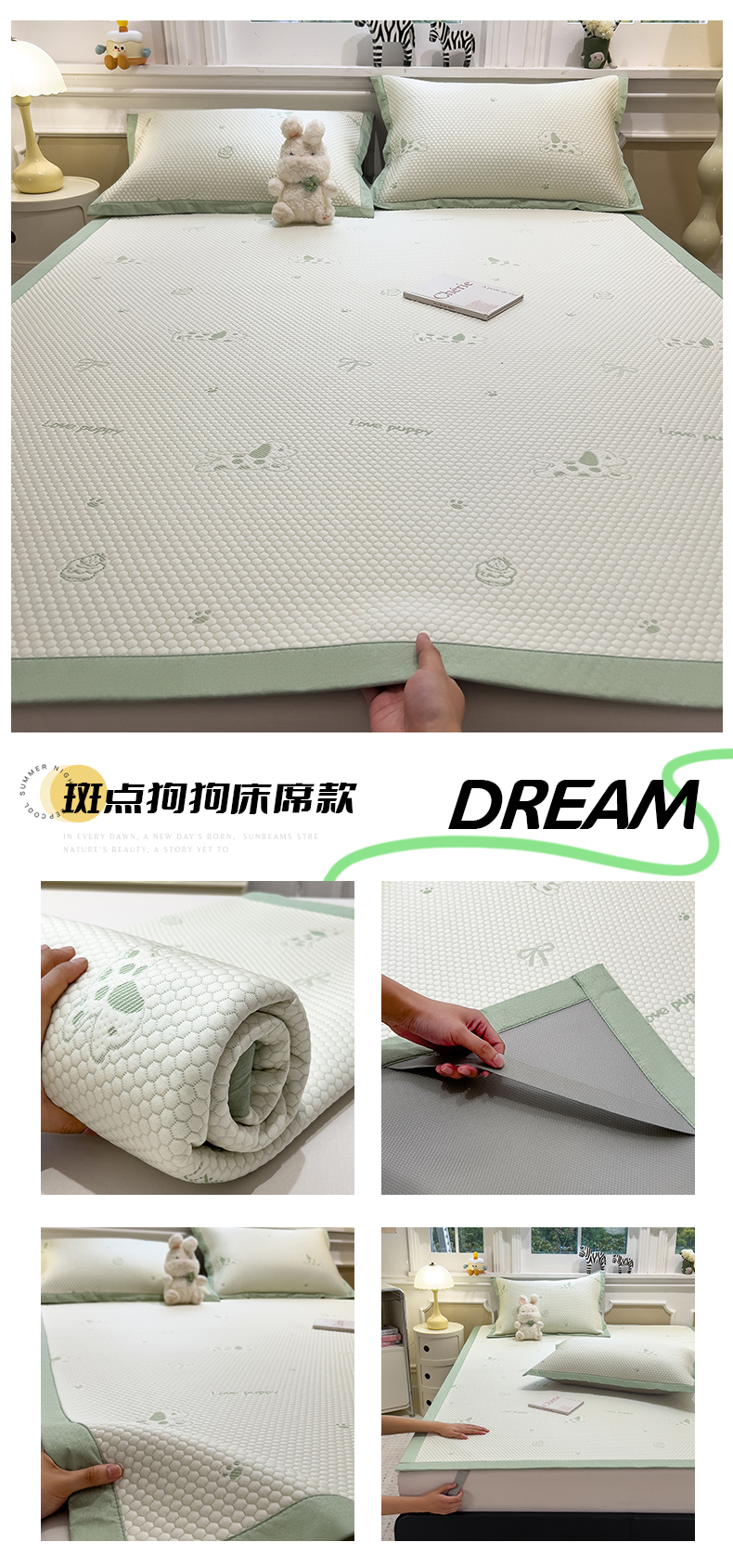(总)倾慕家纺 2026新款PE时尚风豆豆凉席卡通系列--床席款,爱心熊兔床席款,芭蕉叶床席款,斑点狗狗床席款,经典熊猫床席款,南瓜桔床席款,南瓜蓝床席款,时尚小猫床席款,小狗先生床席款