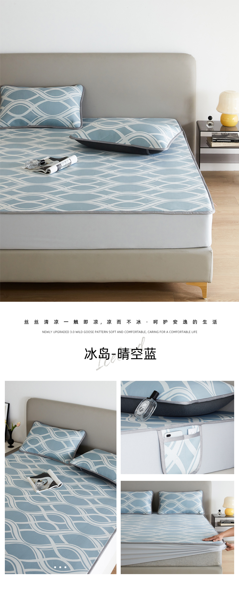 (总)千朵森 2026新款A类抗菌冰岛冰感丝床笠款凉席三件套 风格二,冰岛-暮夜蓝,冰岛-浅茶杏,冰岛-晴空蓝,冰岛-山茶灰,冰岛-山梗灰