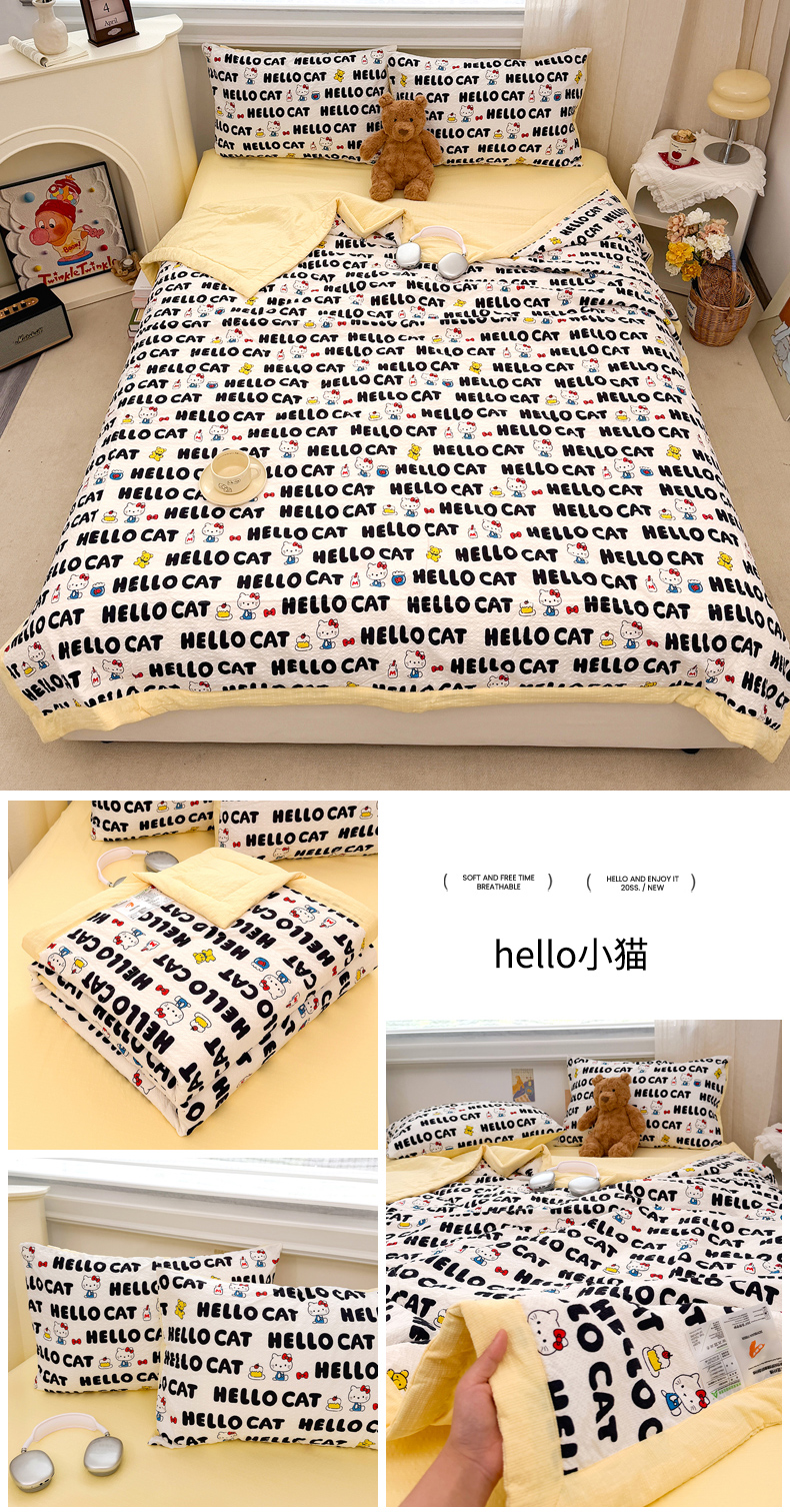 (总)娜朵家纺 2026新款A类泡芙双层纱大豆夏被夏凉被空调被四件套,蓝色豹纹,绵绵狗,小马哒哒,星际小喵,极简几何,黑脸小猫,田园逸趣,线条小狗,饼干小狗,木马摇摇,hello小猫,星梦园