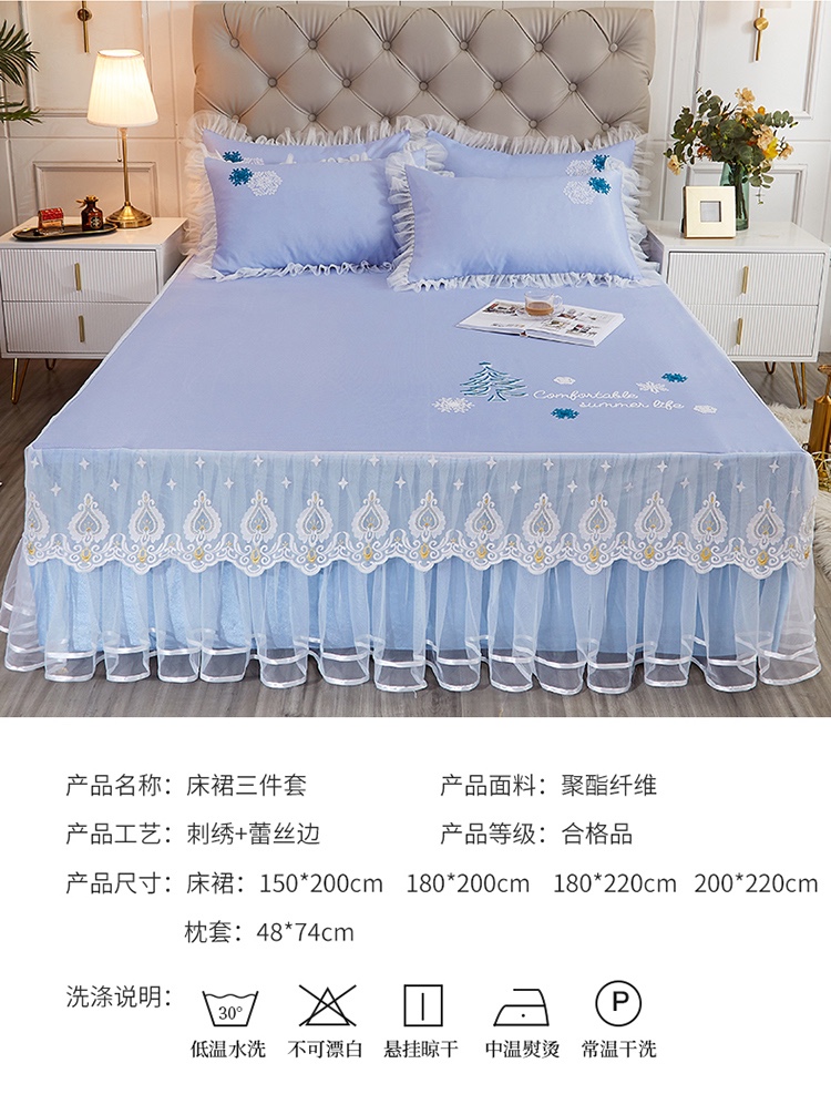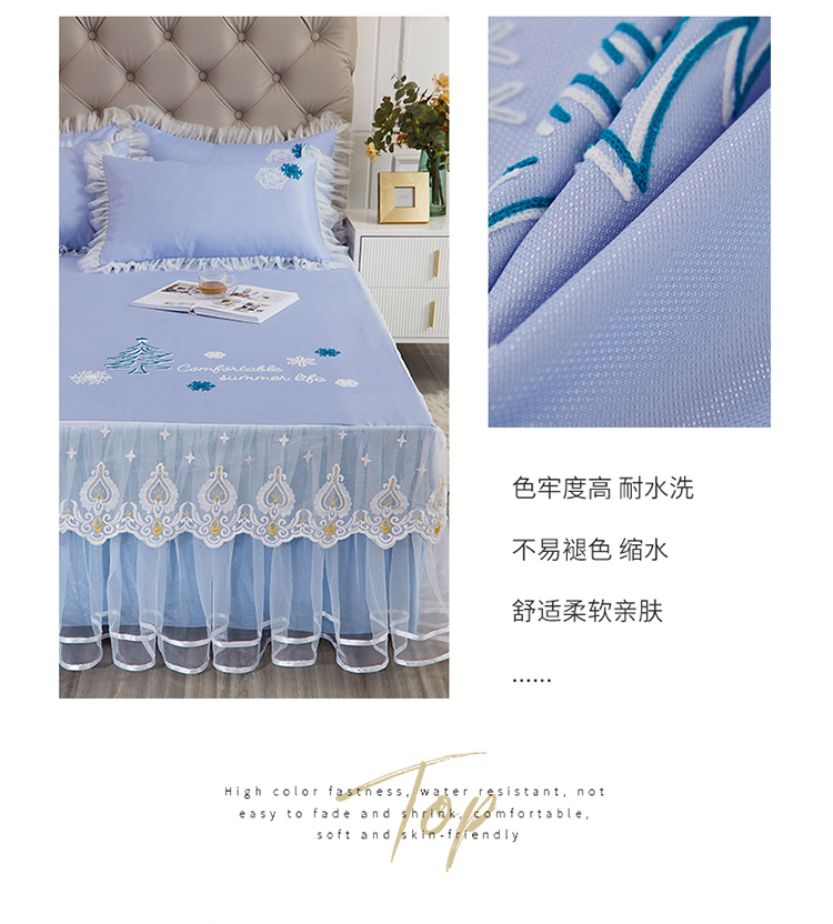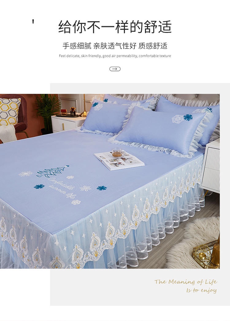 商品名称:2023素色绣花床裙款冰丝席三件套 冰雪世界-雪青