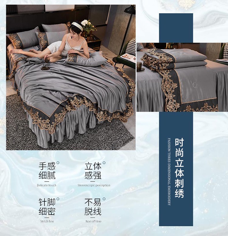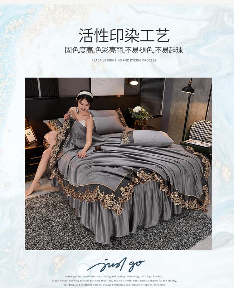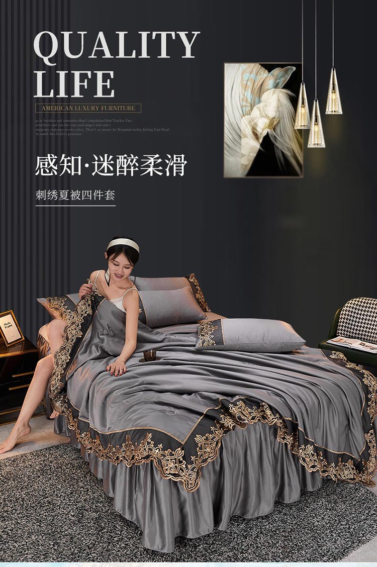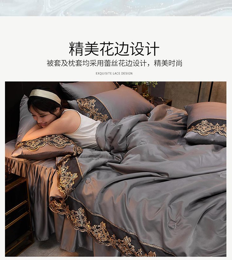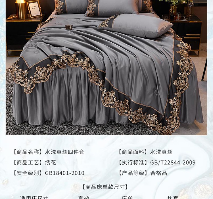 当前位置: 91家纺网 > 商品网购 > 床品套件 > 四件套 > 铠畅 丽莎新款水洗真丝夏被空调被四件套春夏蕾丝刺绣床裙款床单款天丝夏凉被套件 银灰