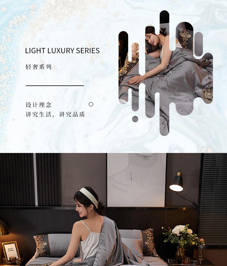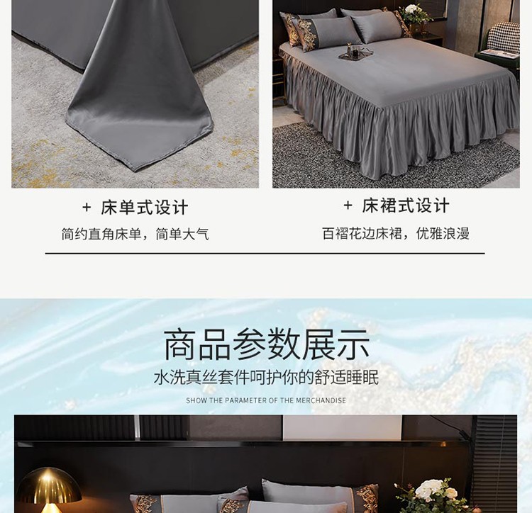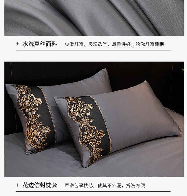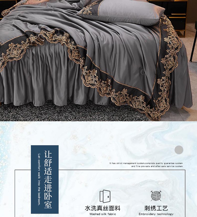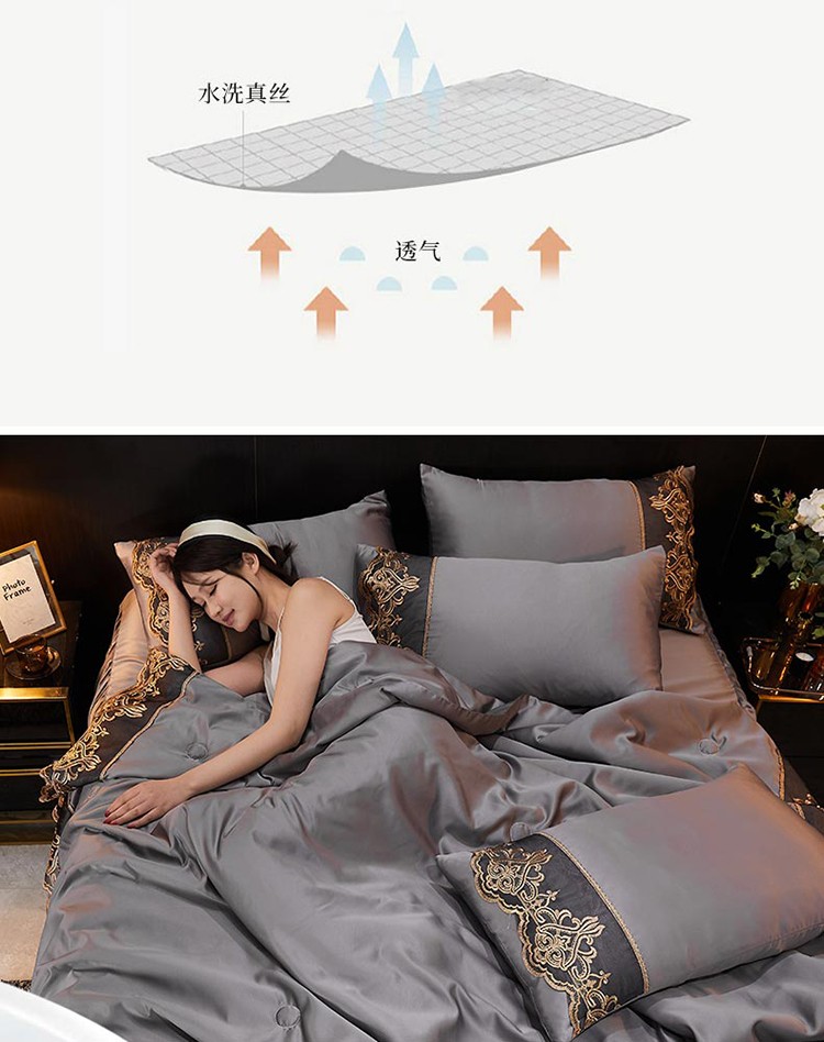 当前位置: 91家纺网 > 商品网购 > 床品套件 > 四件套 > 铠畅 丽莎新款水洗真丝夏被空调被四件套春夏蕾丝刺绣床裙款床单款天丝夏凉被套件 银灰