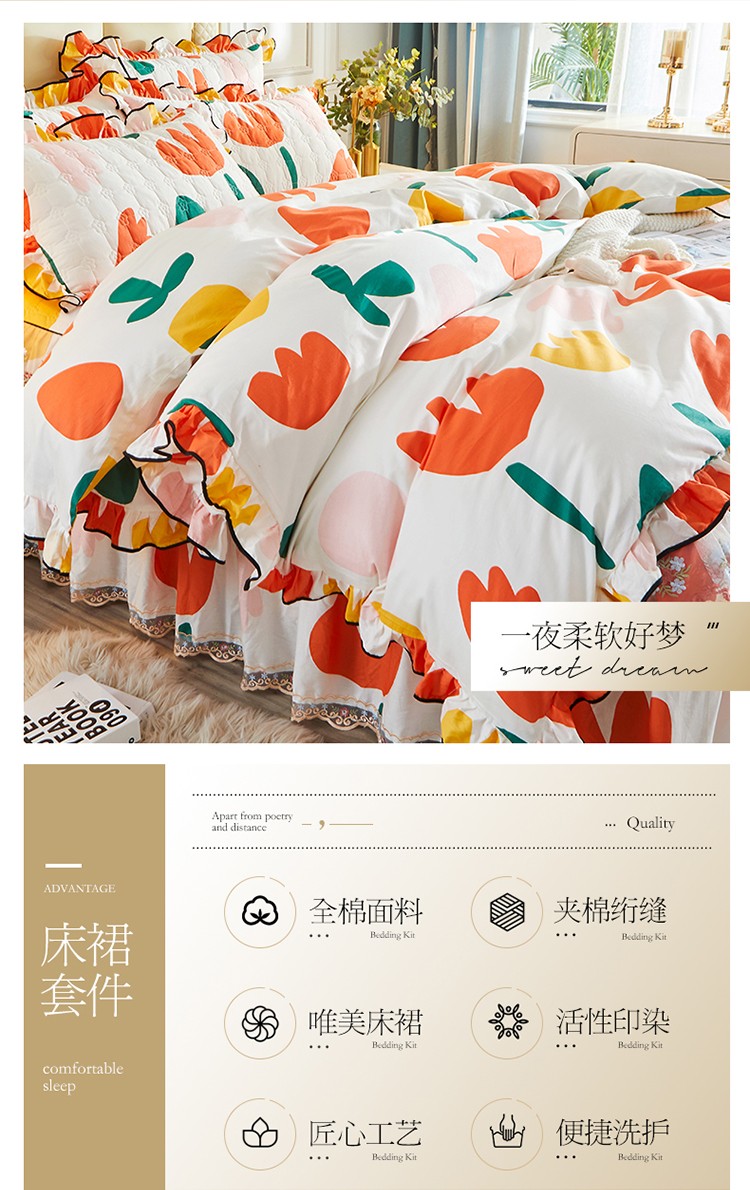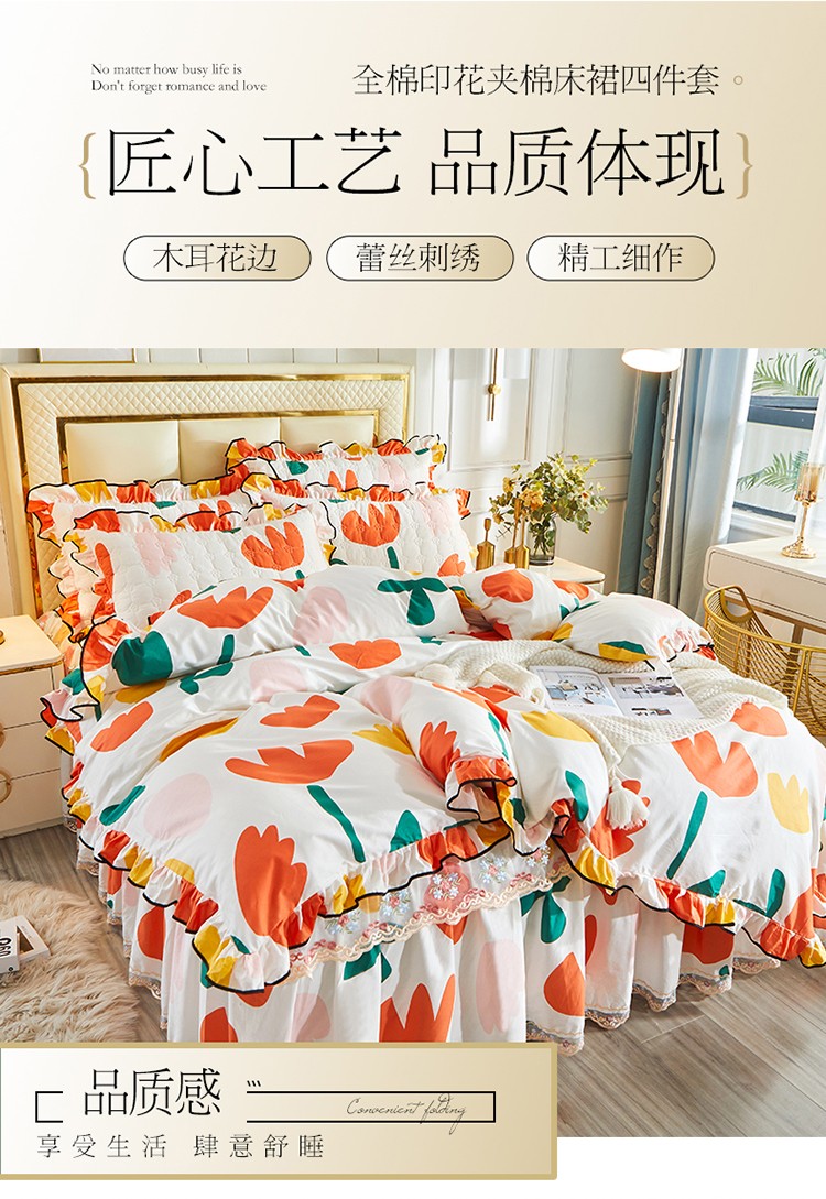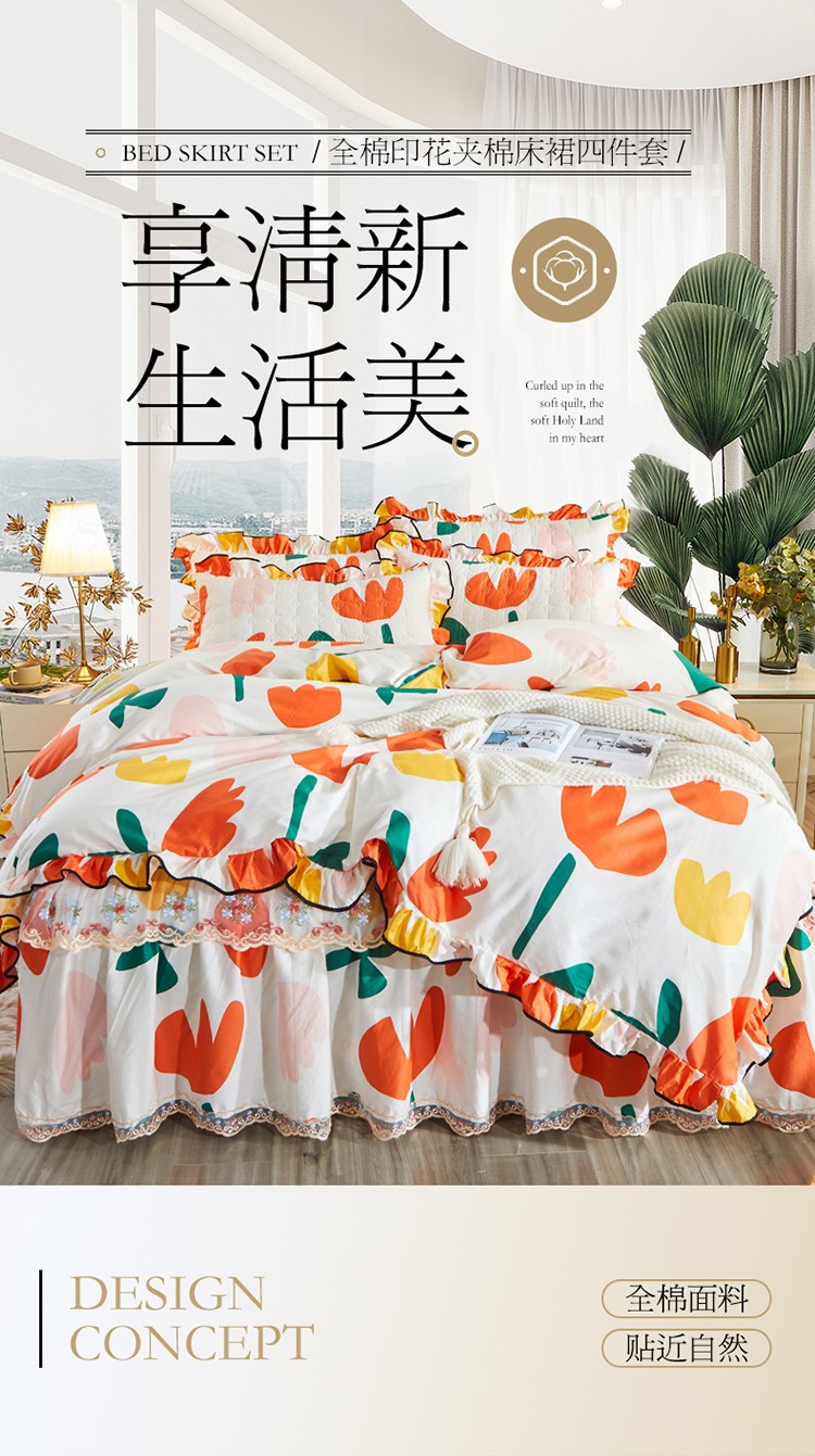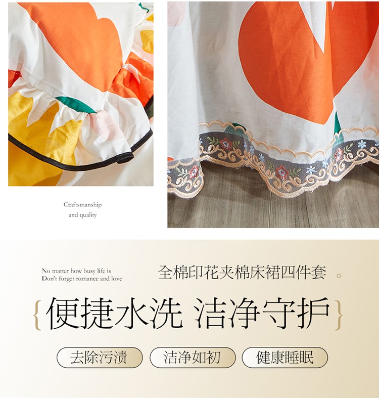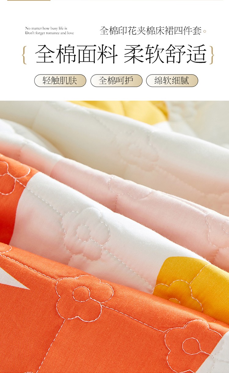 当前位置: 91家纺网 > 商品网购 > 床品套件 > 四件套 > 全棉普通四件套 > 宜凡 2021新款全棉印花夹棉床裙-床裙四件套 阳光花语