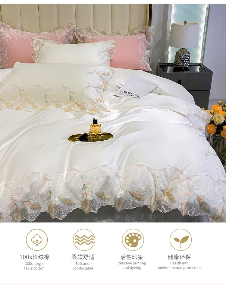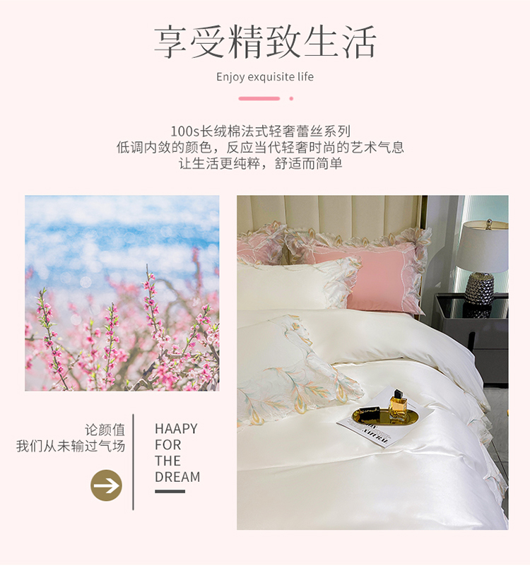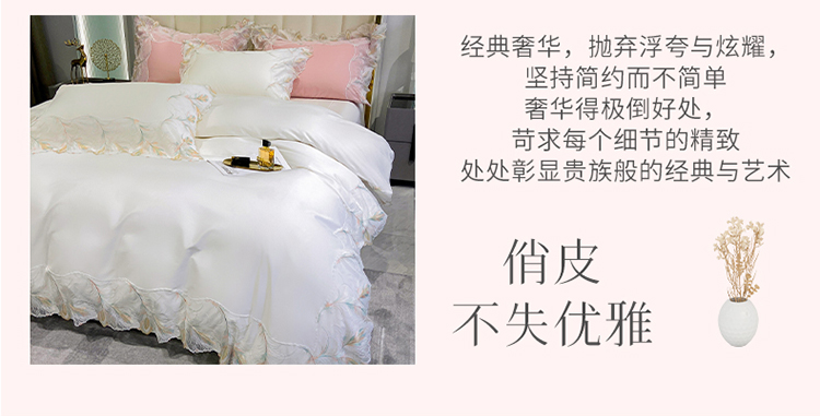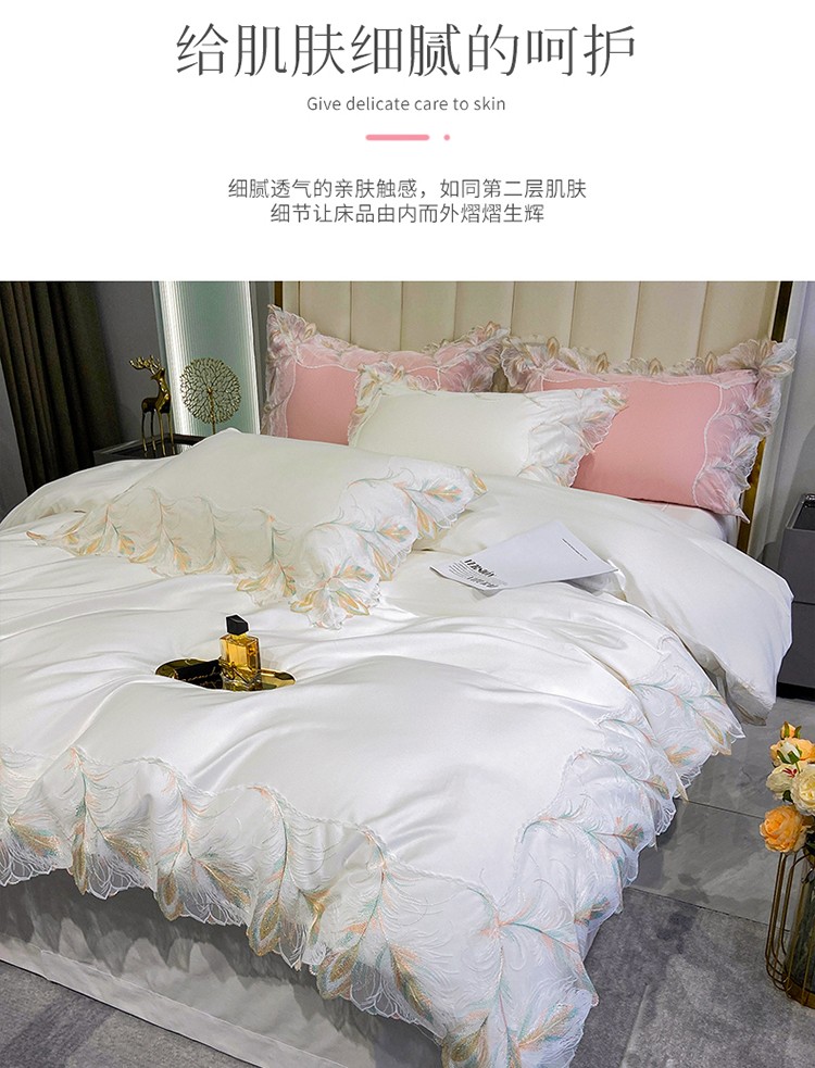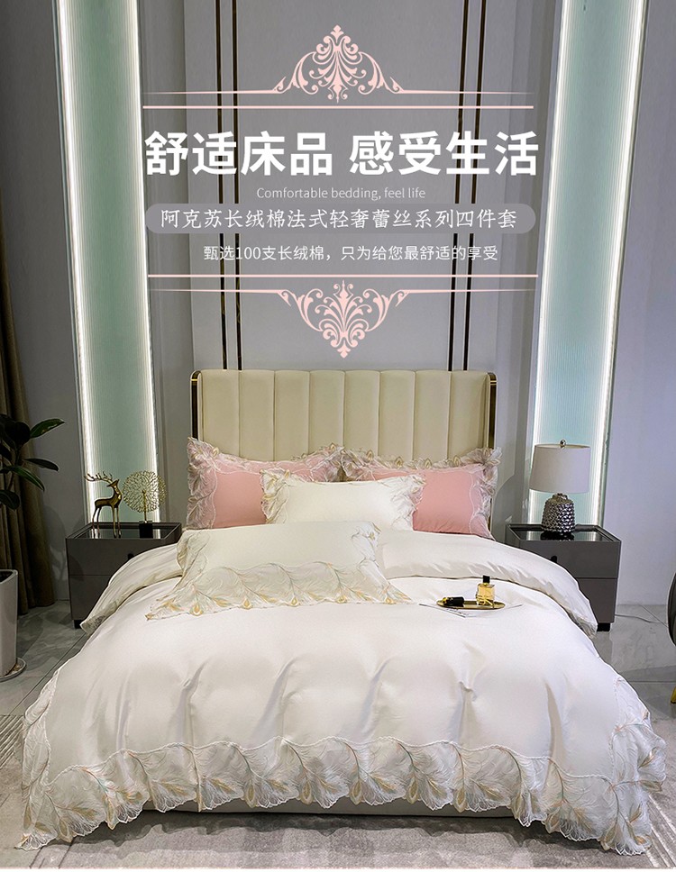 魅都凤枝羽100阿克苏长绒棉法式轻奢蕾丝系列四件套 椰奶白