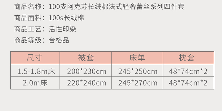 商品名称:魅都凤枝羽100阿克苏长绒棉法式轻奢蕾丝系列四件套 椰奶白