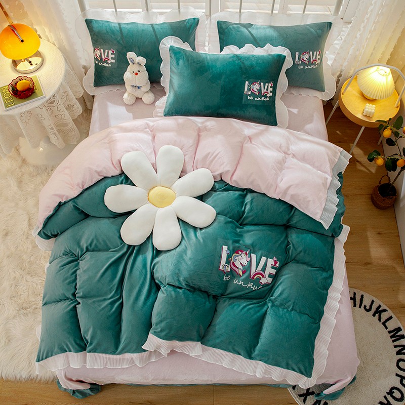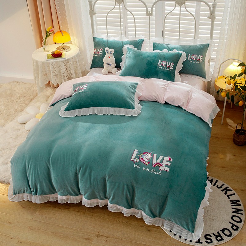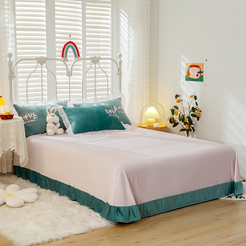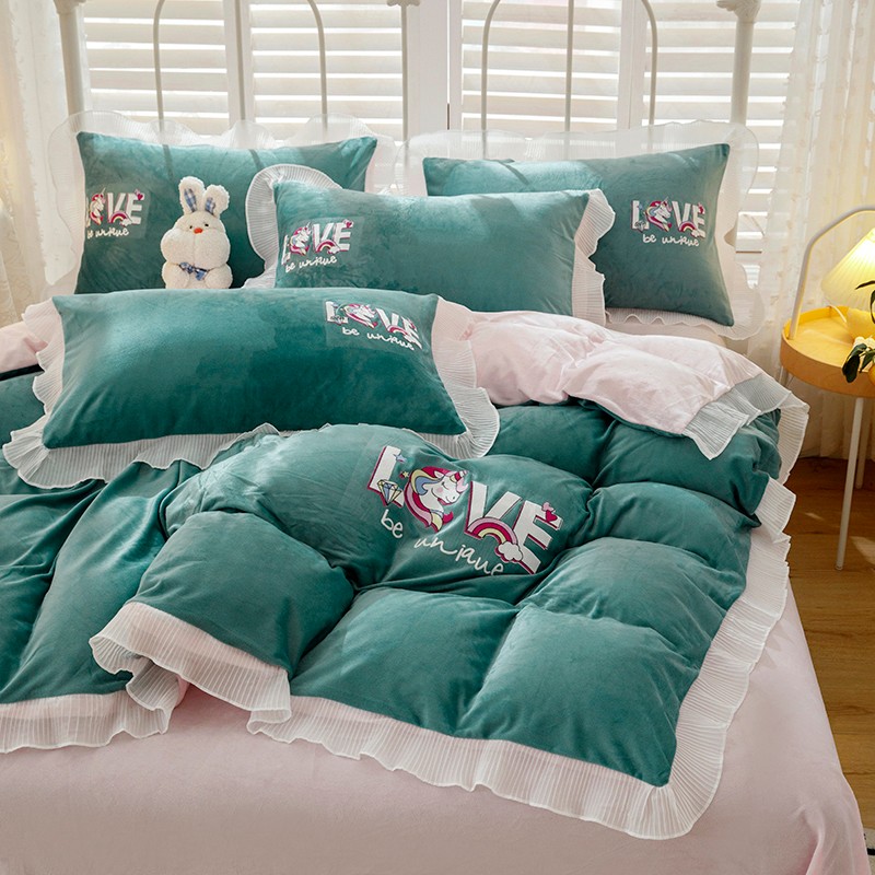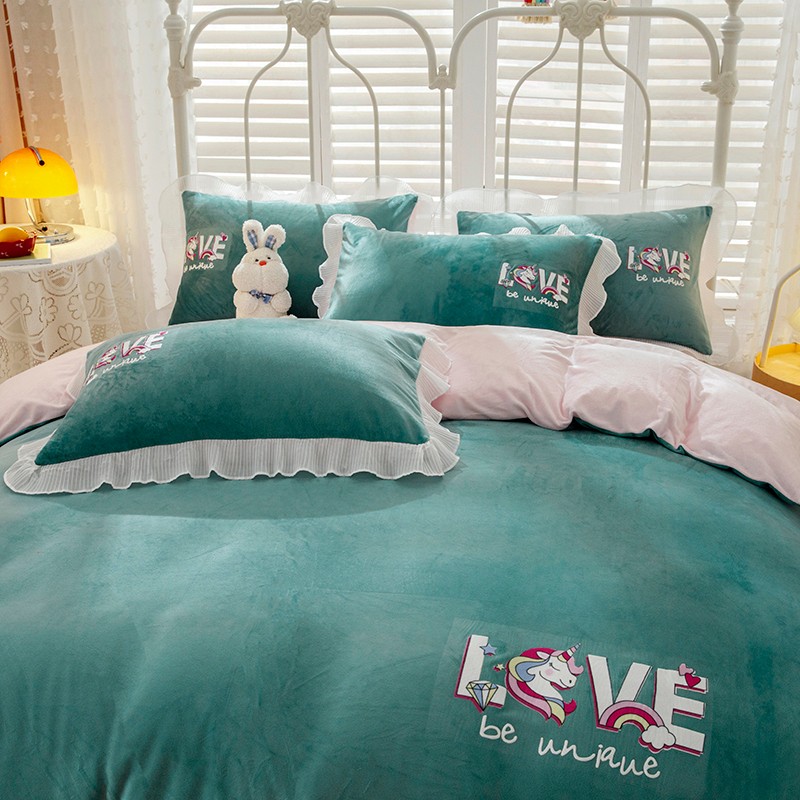 纽缦 新款韩版水晶绒床单四件套法莱水晶牛奶 独角兽浅绿粉