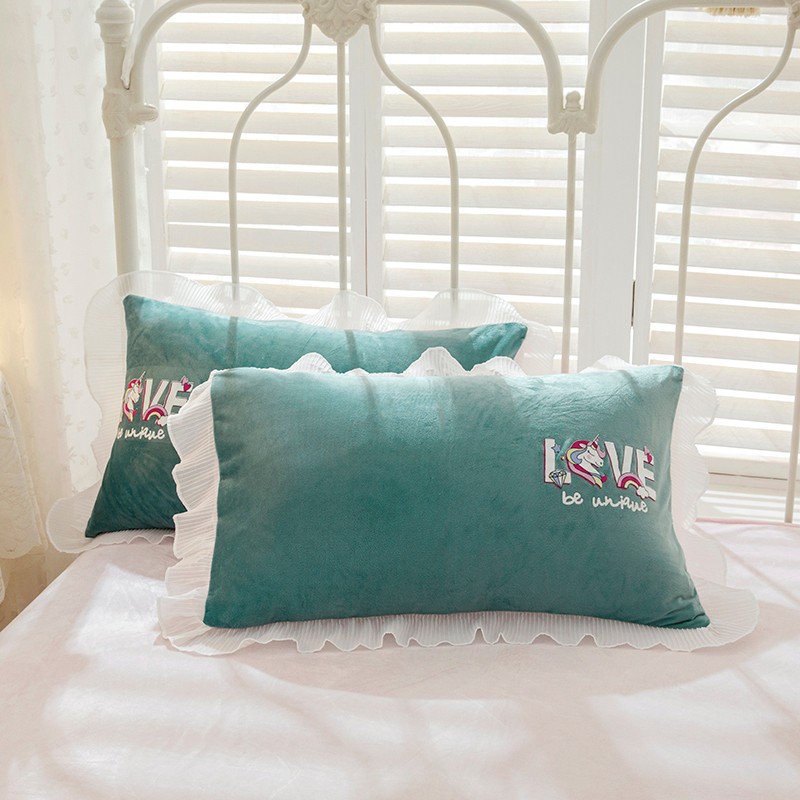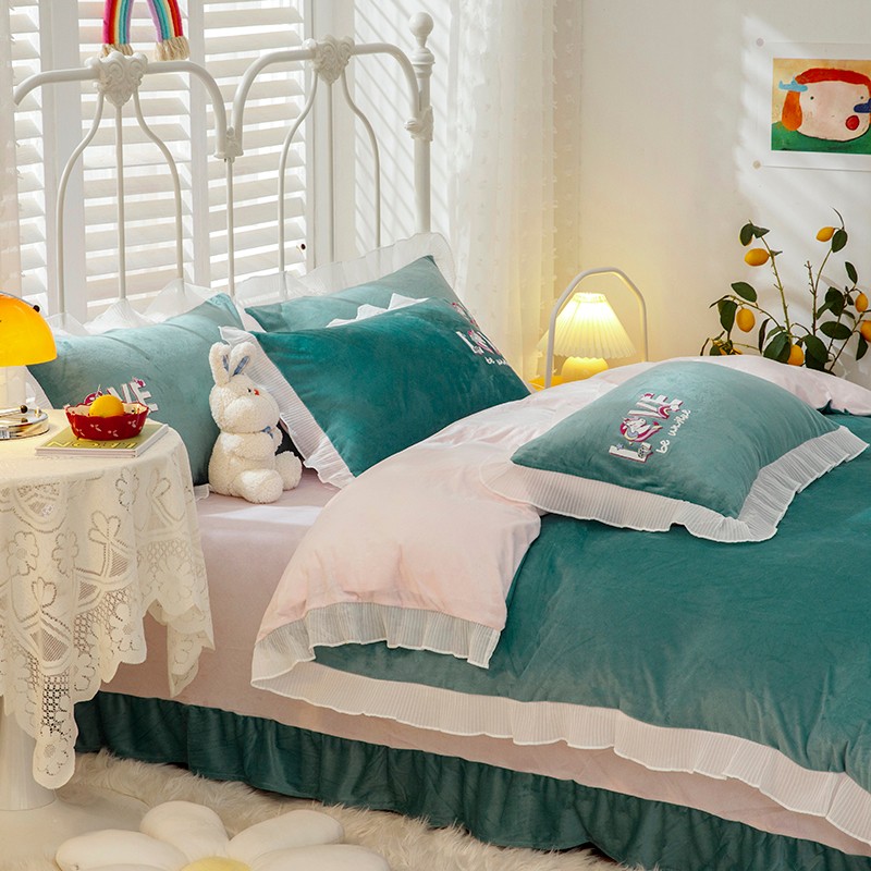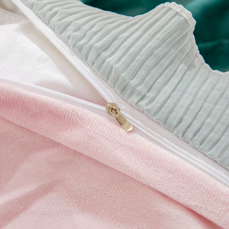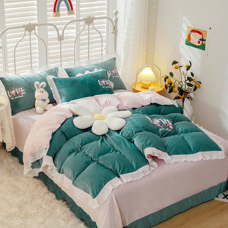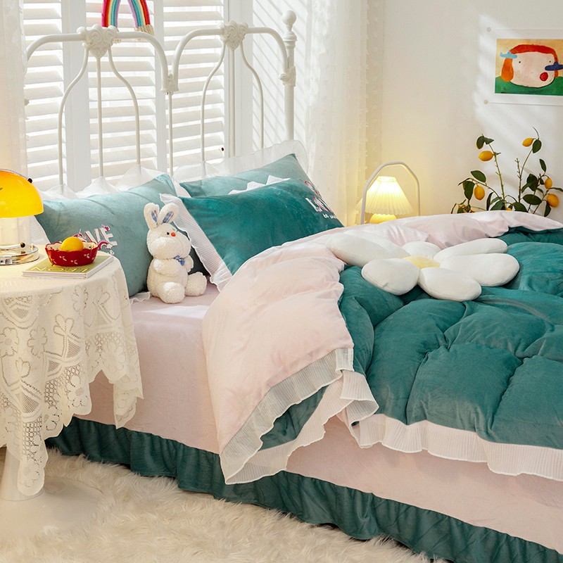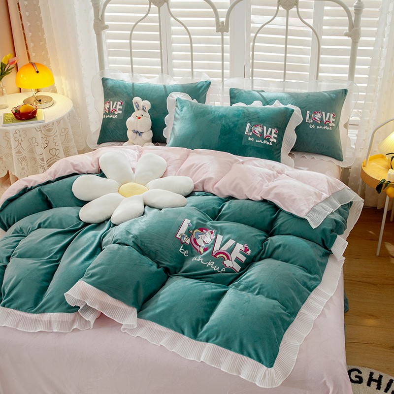纽缦 新款韩版水晶绒床单四件套法莱水晶牛奶 独角兽浅绿粉