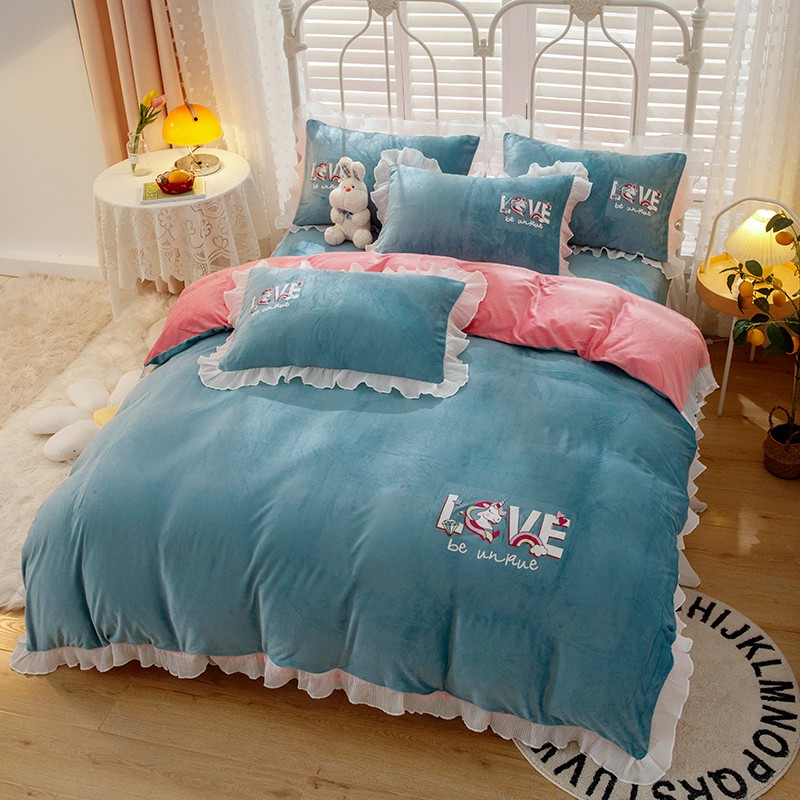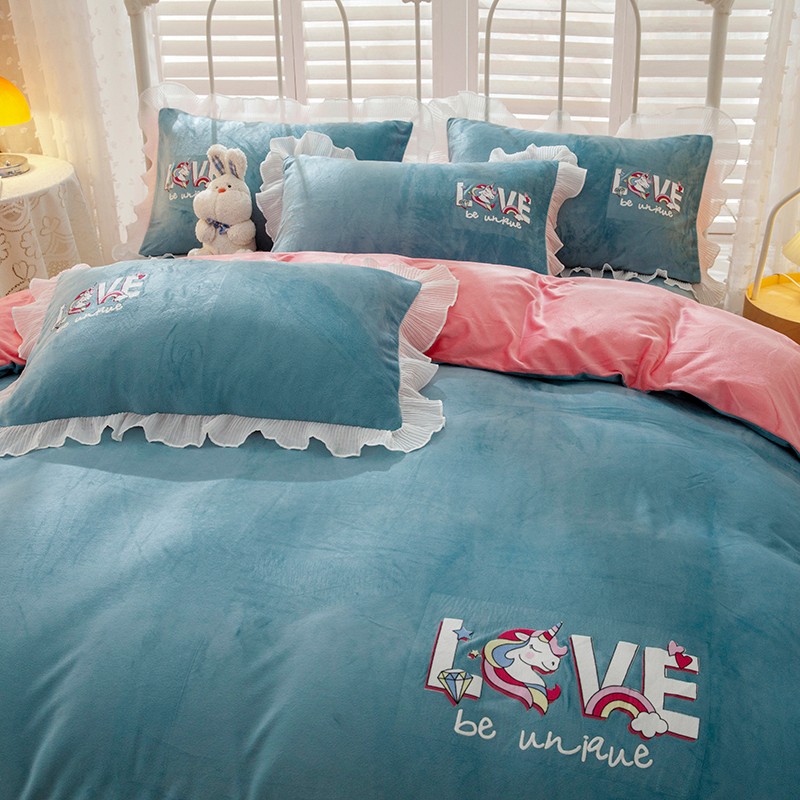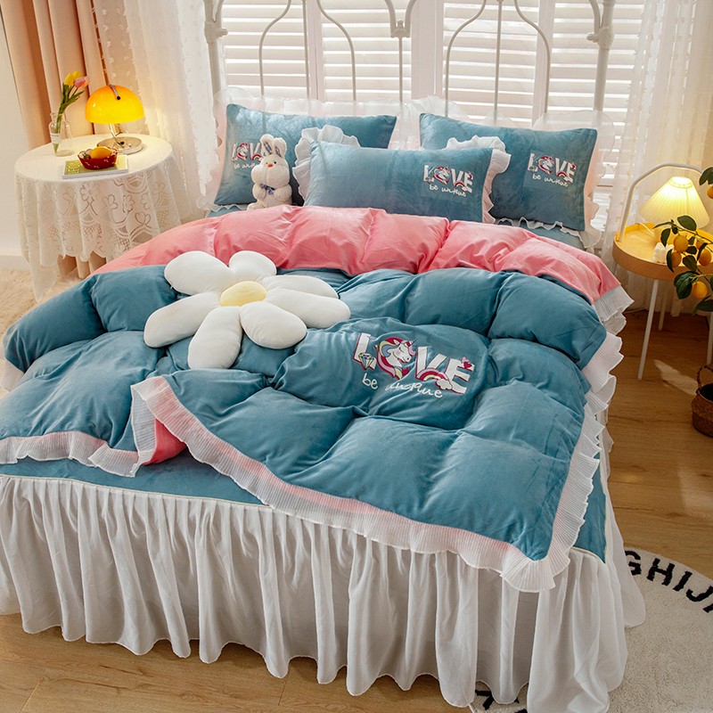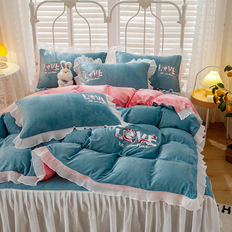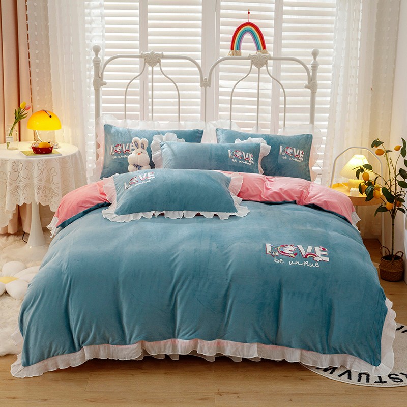 纽缦 2021新款韩版水晶绒床裙四件套 独角兽-蓝灰粉
