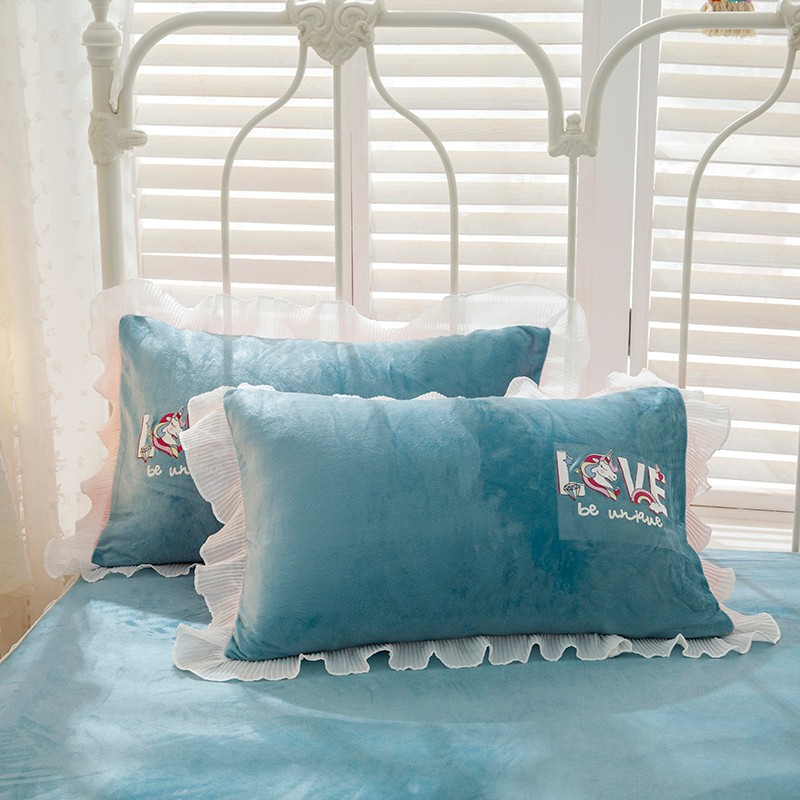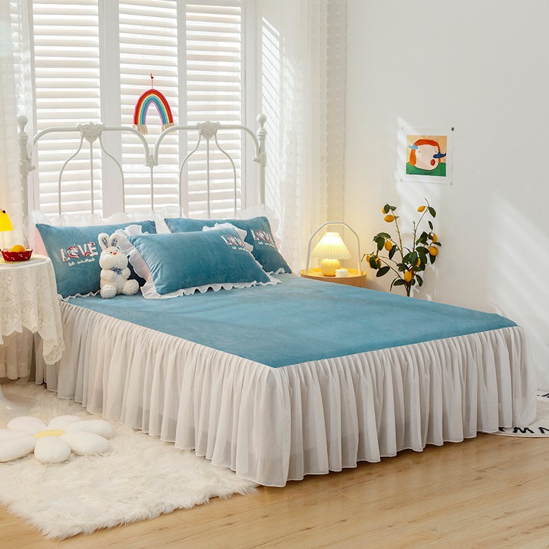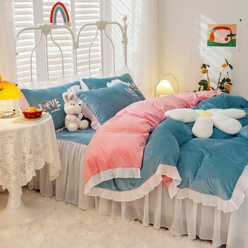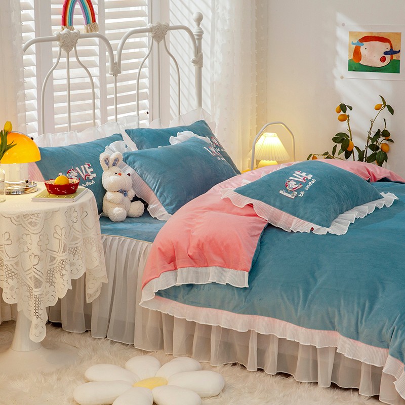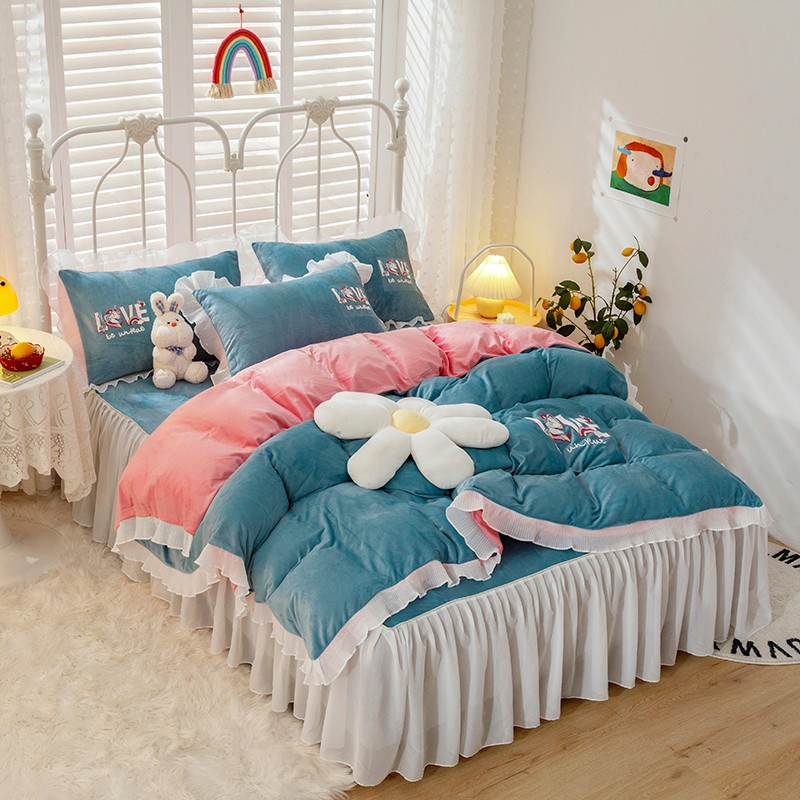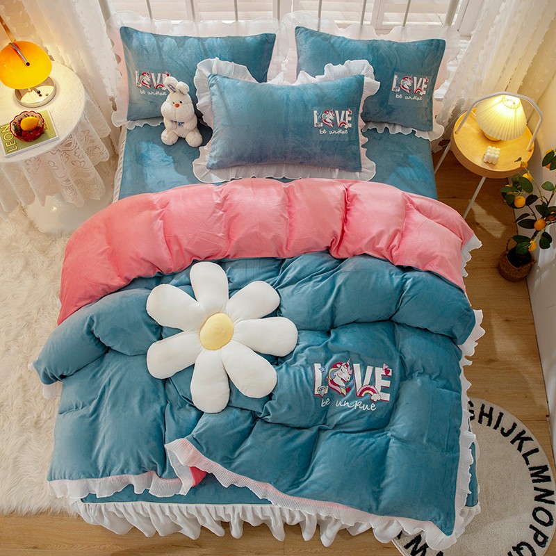 纽缦 2021新款韩版水晶绒床裙四件套 独角兽-蓝灰粉