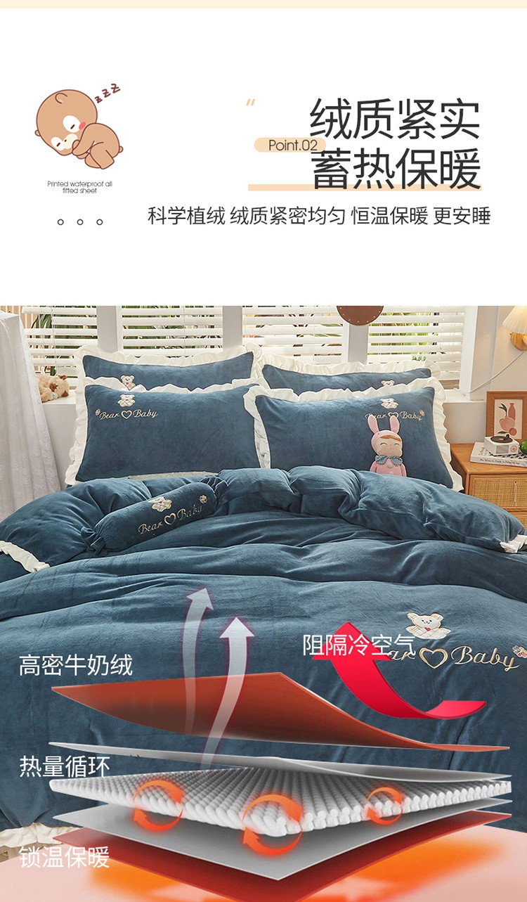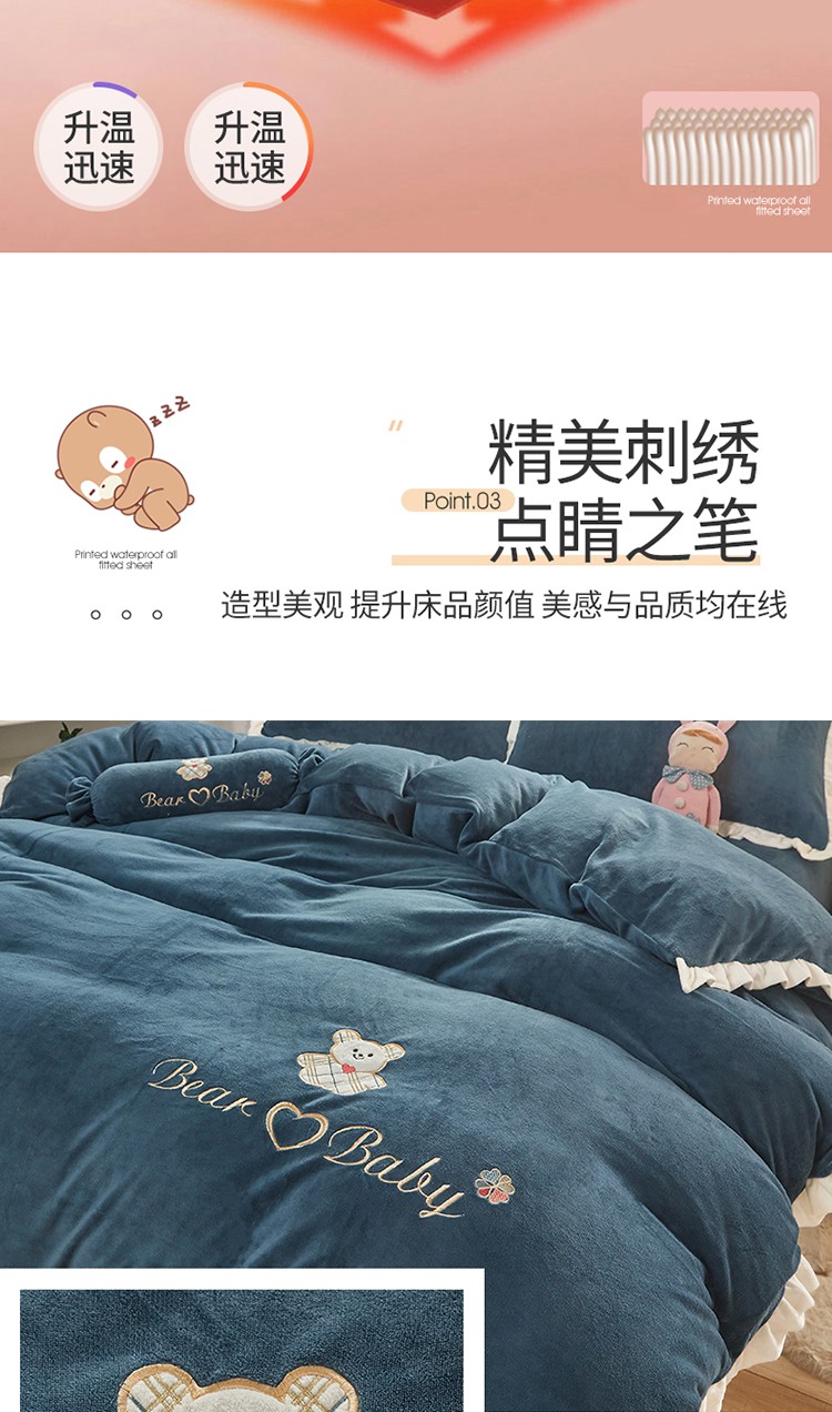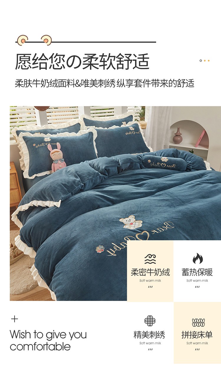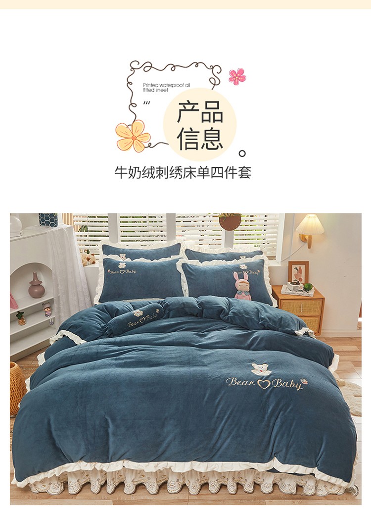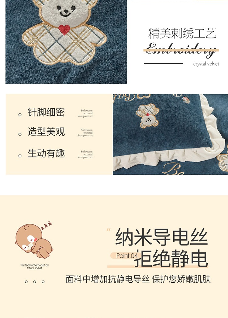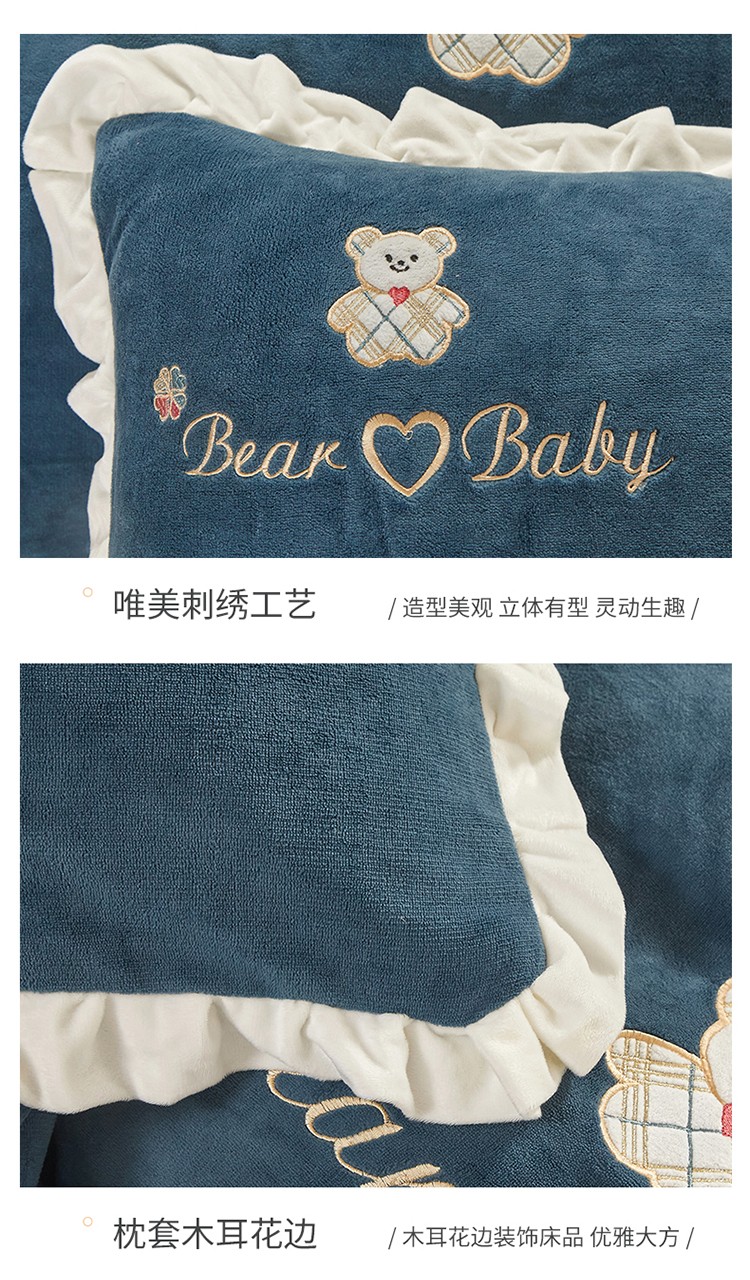 商品名称:宜凡家纺 2021新款牛奶绒绣花熊床单四件套 可爱熊-藏蓝
