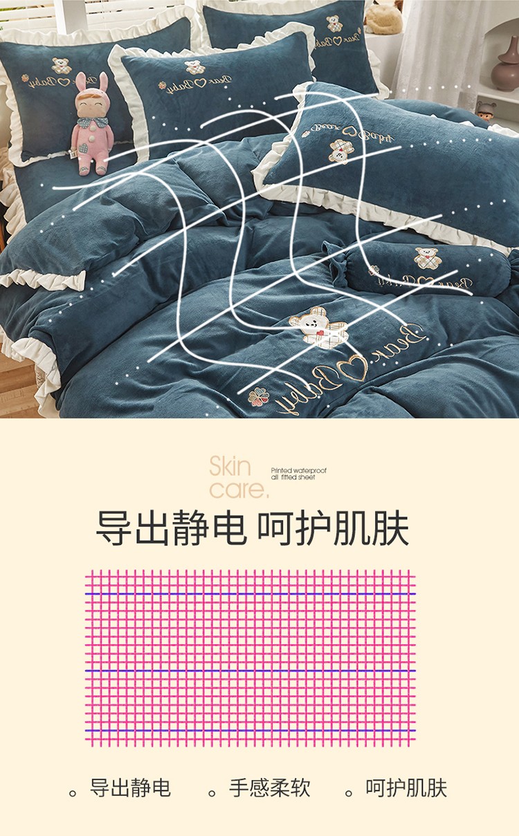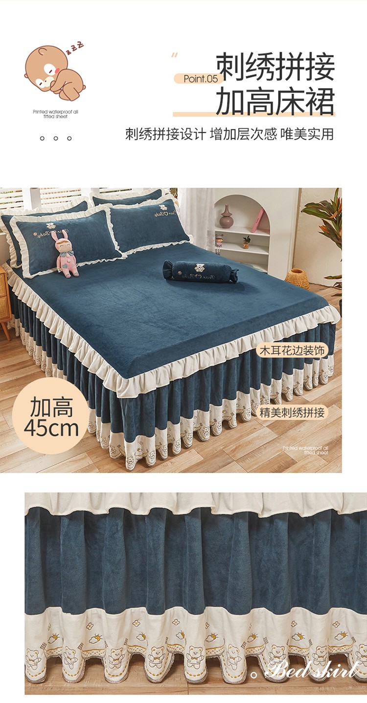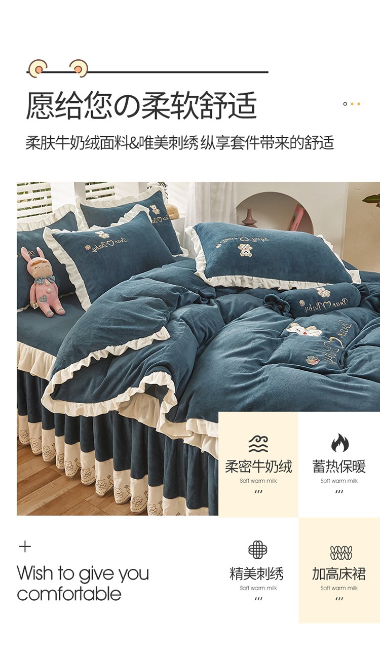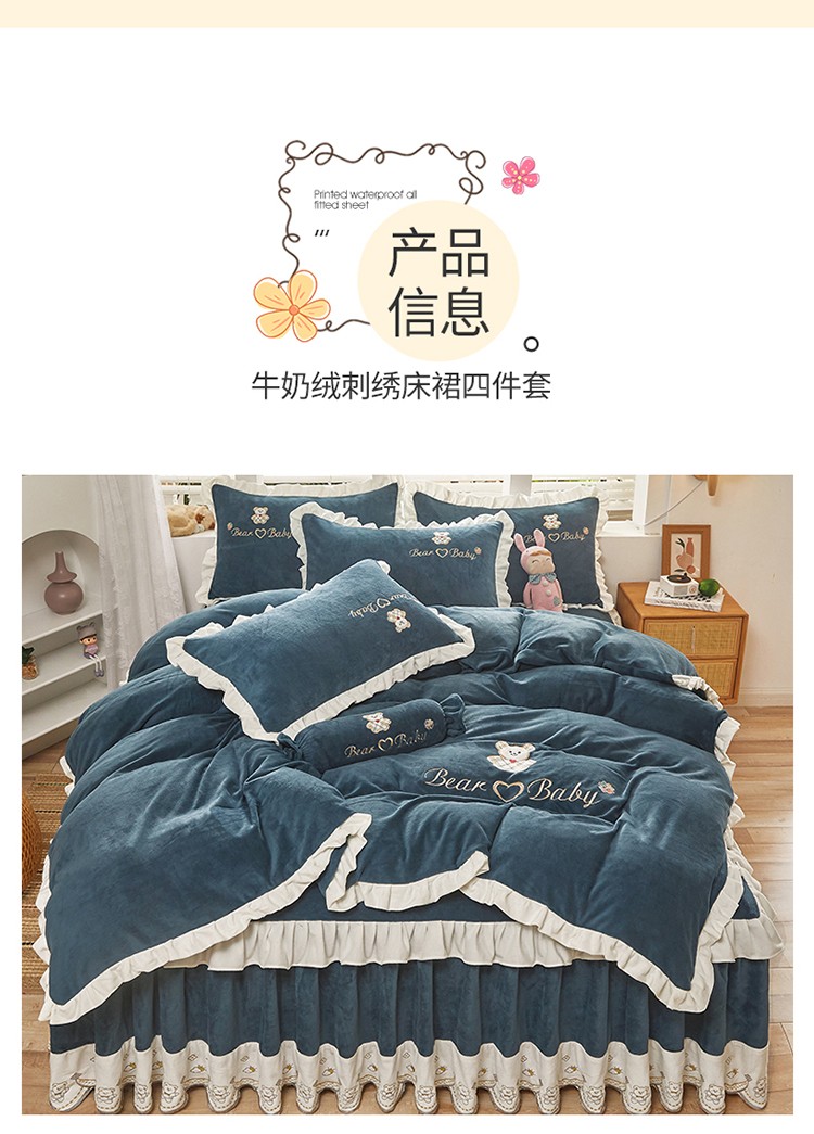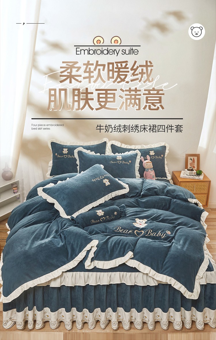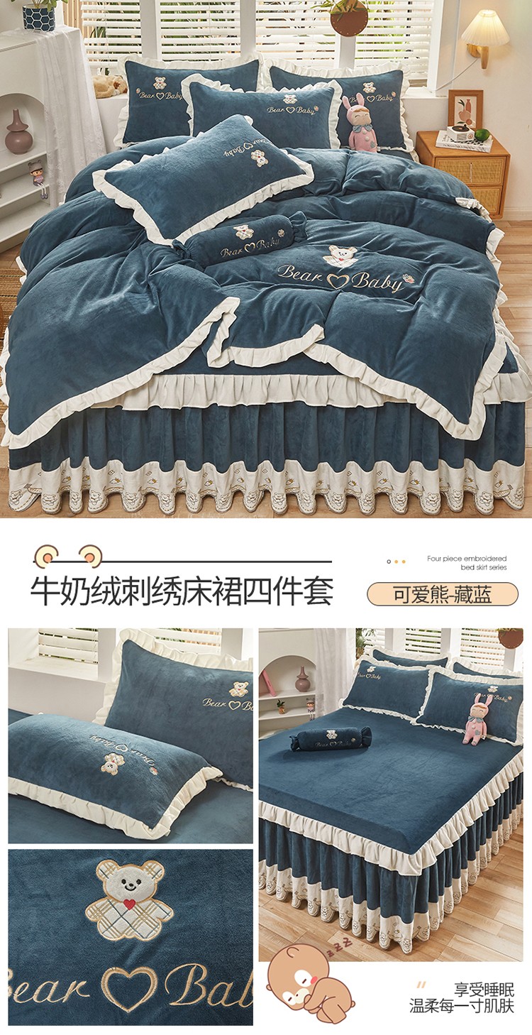 商品名称:宜凡家纺 2021新款牛奶绒绣花熊床裙四件套 可爱熊-藏蓝