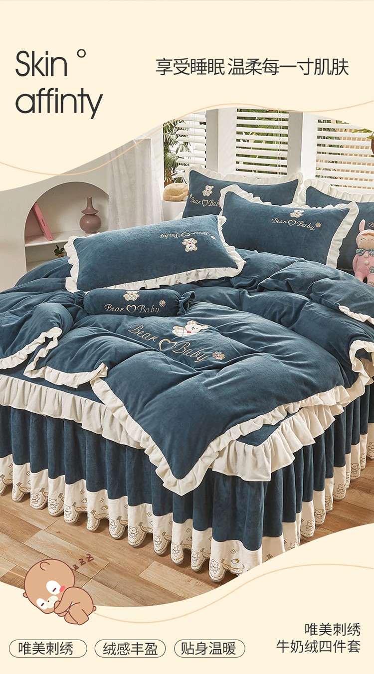 宜凡家纺 2021新款牛奶绒绣花熊床裙四件套 可爱熊-藏蓝