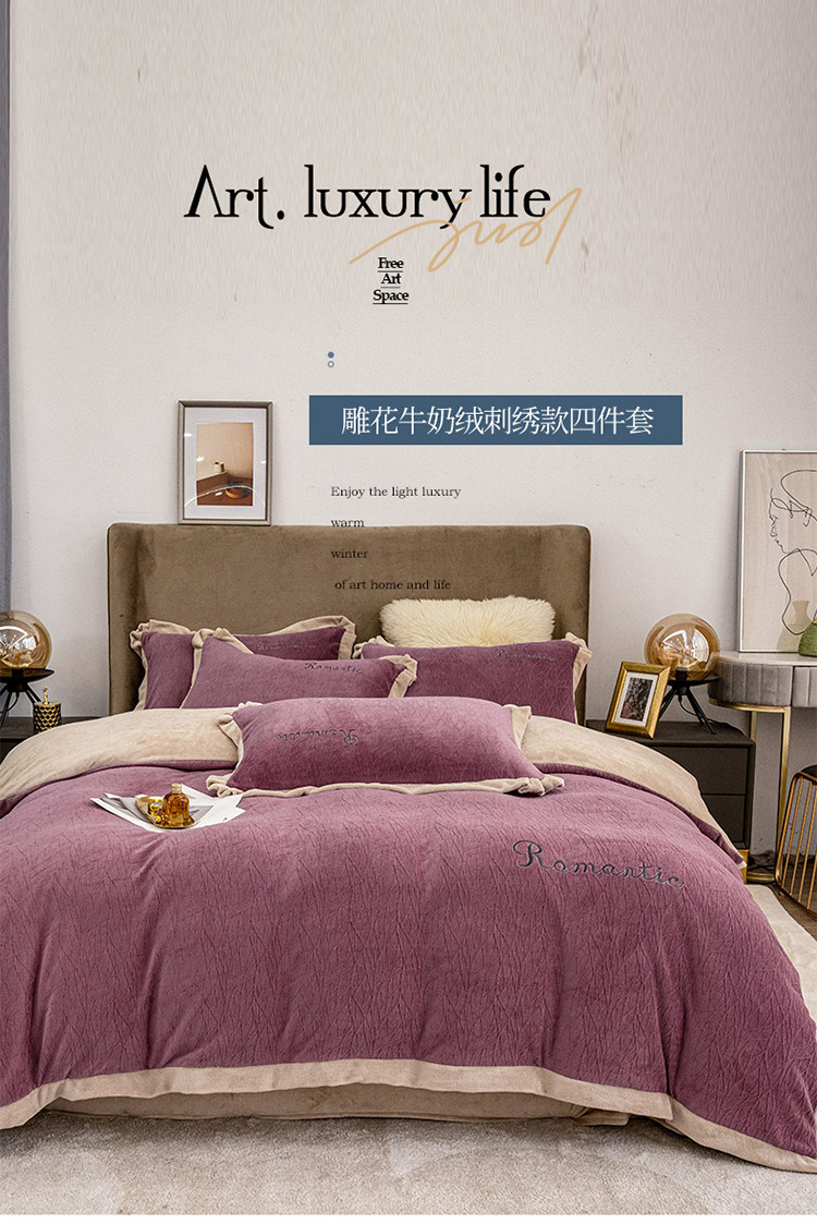 (总)骏腾2022新款酒店风雕花牛奶绒刺绣款四件套-浪漫满屋,宾利蓝,豆沙,风铃紫,卡其,浅灰,樱花粉