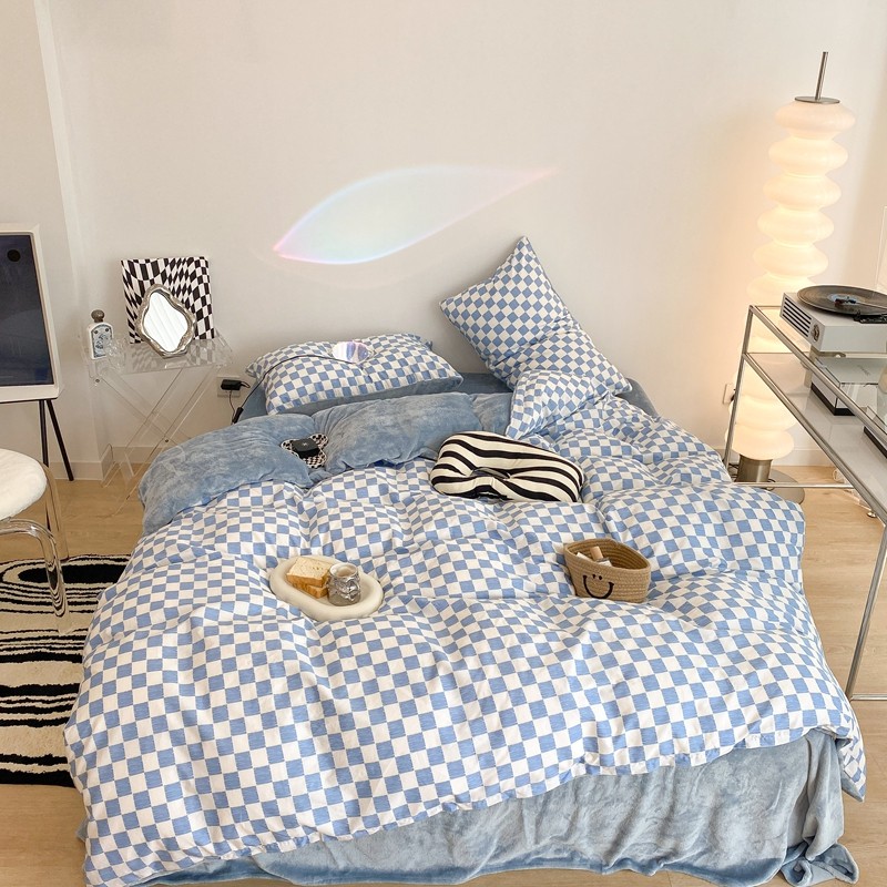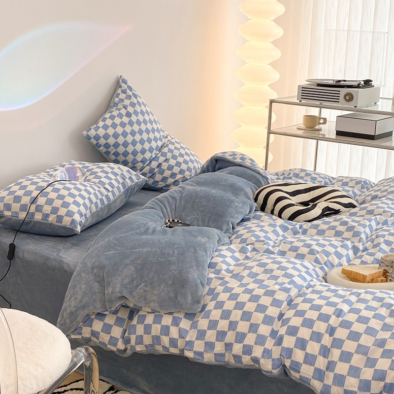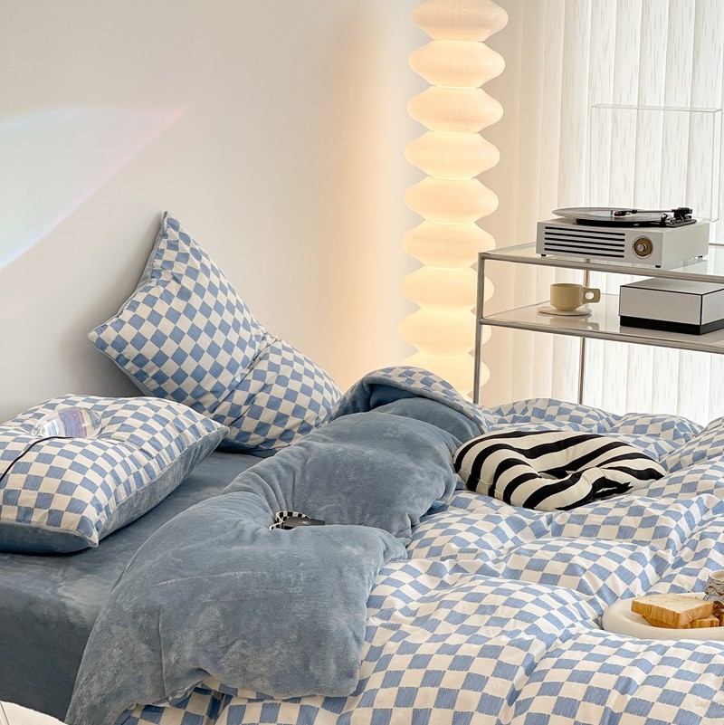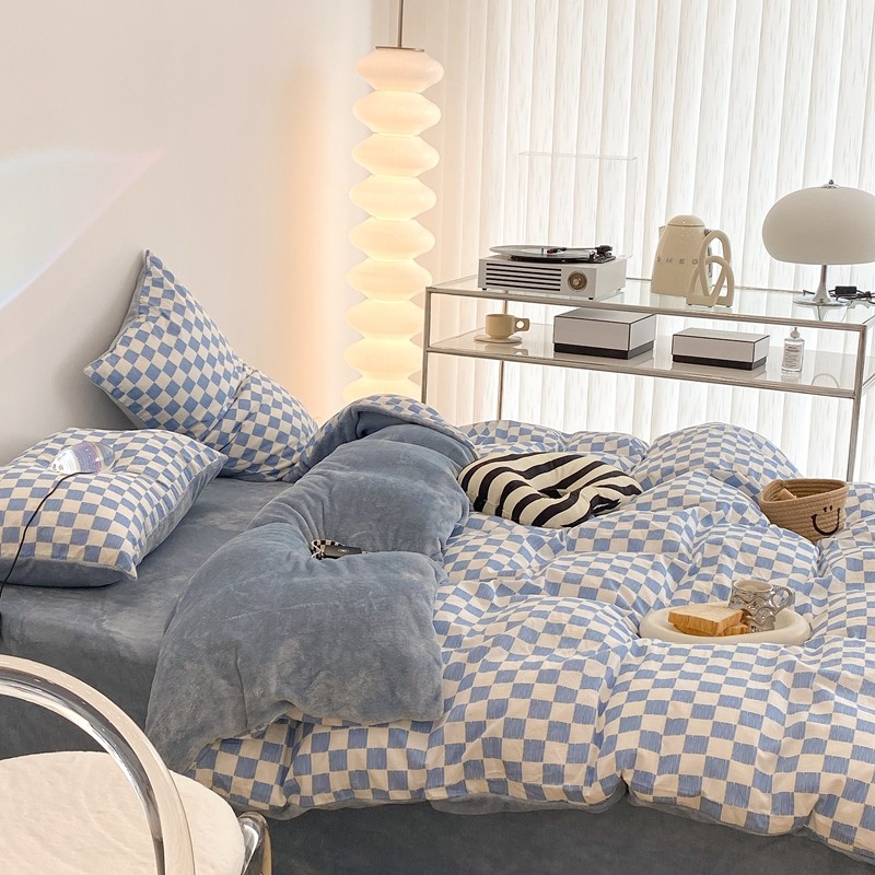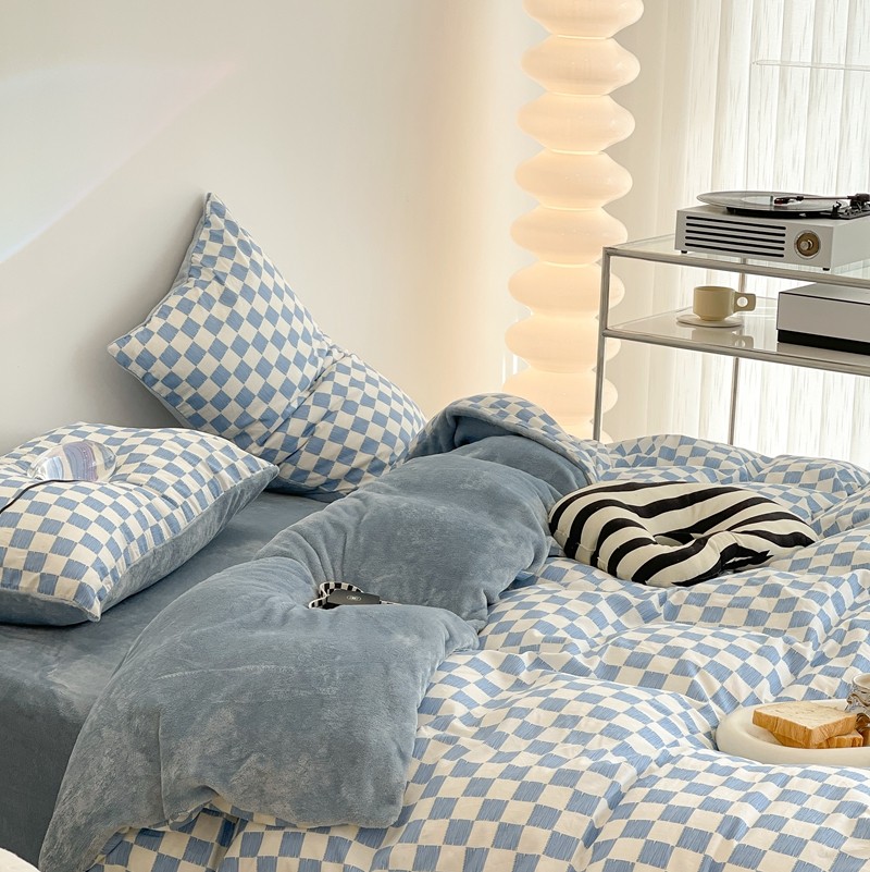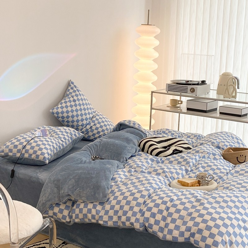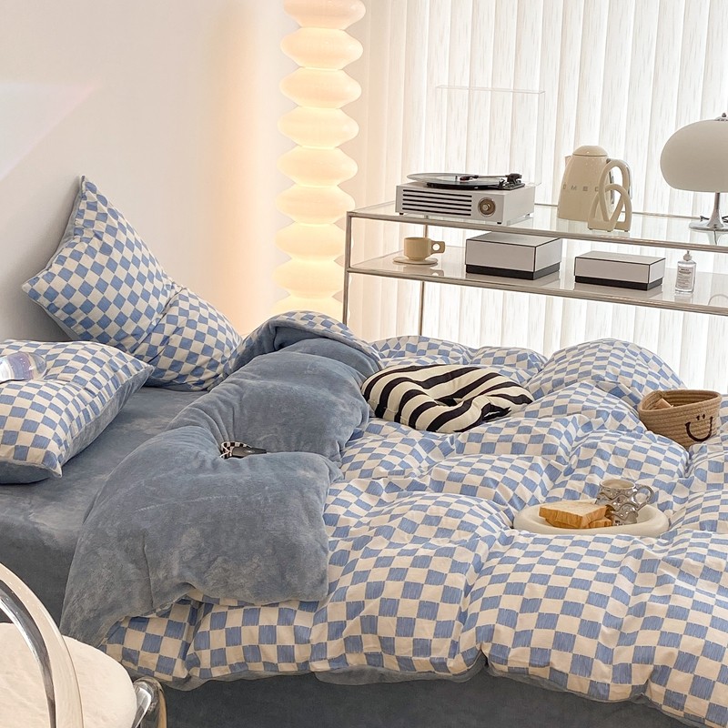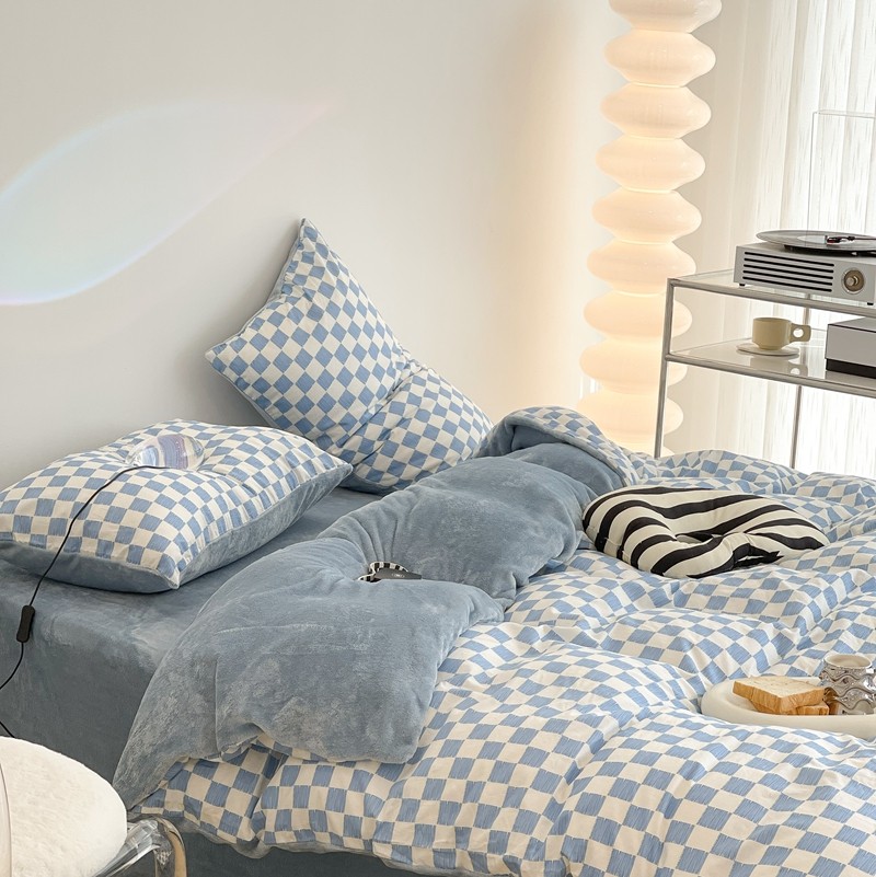 昔可家纺 2021新款棉加牛奶绒四件套 蓝色棋盘格