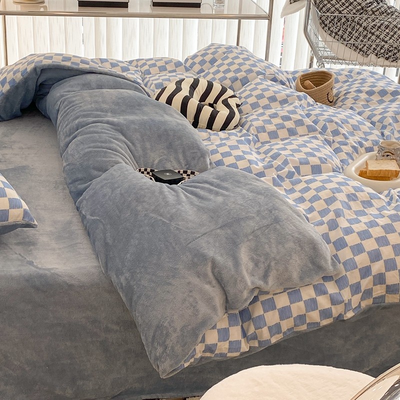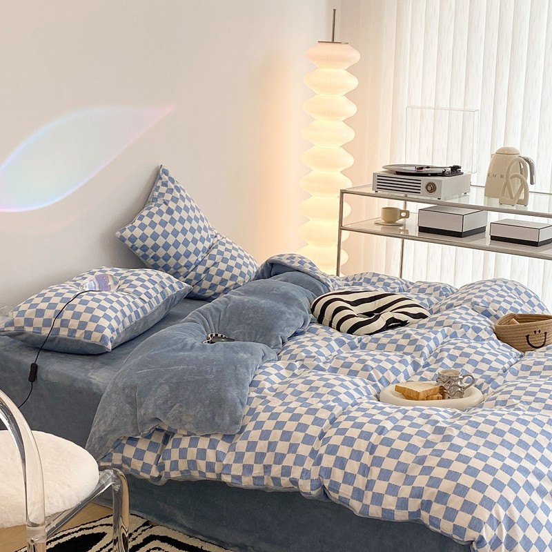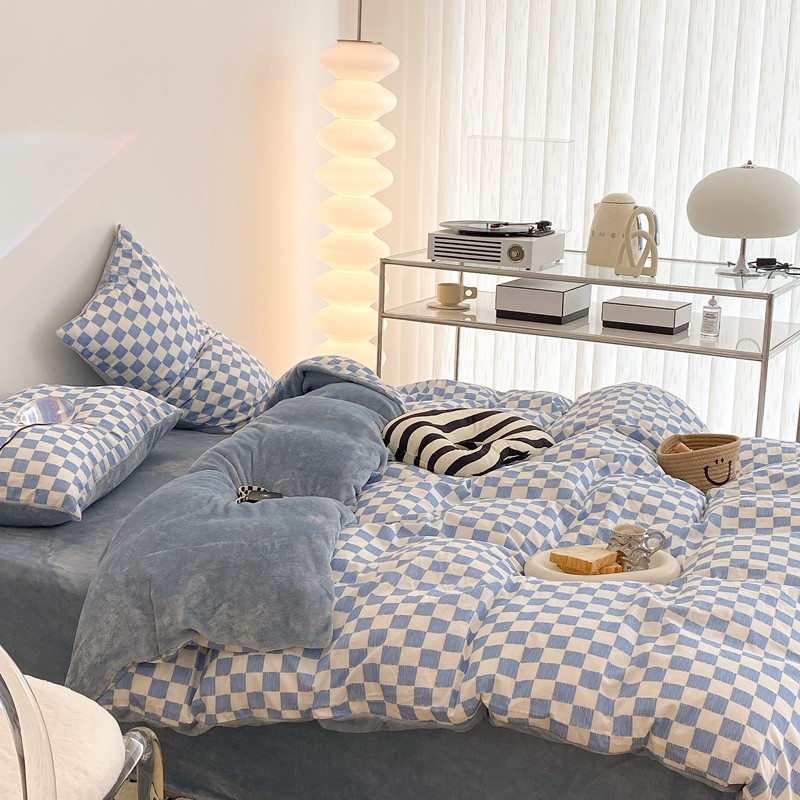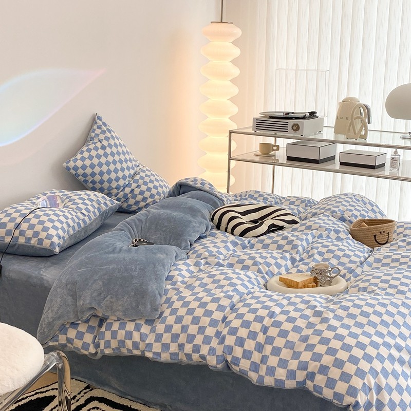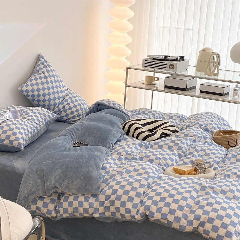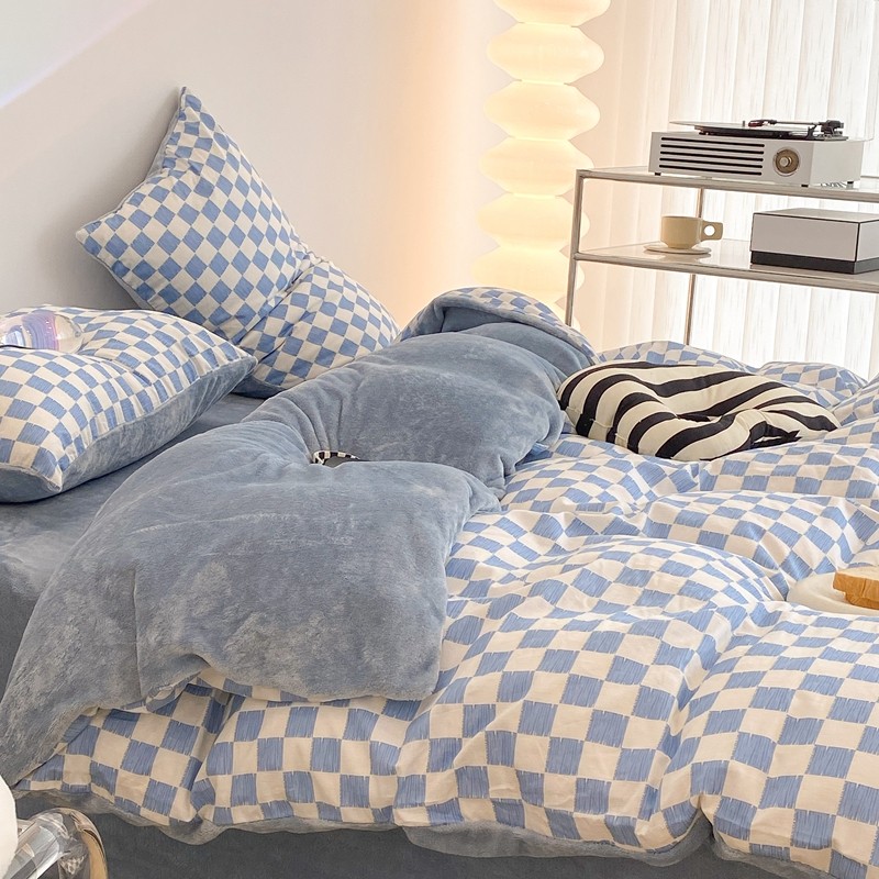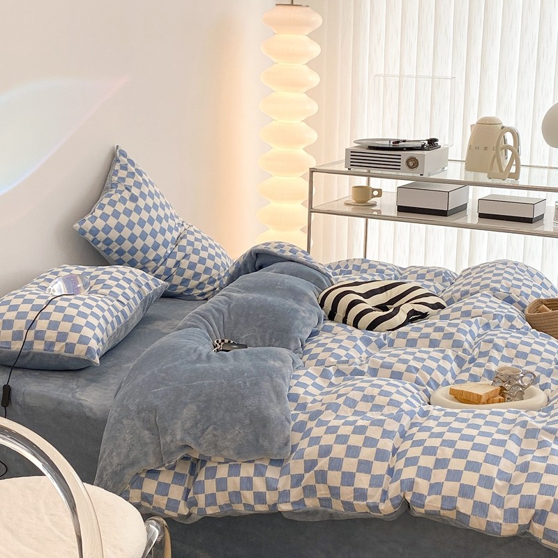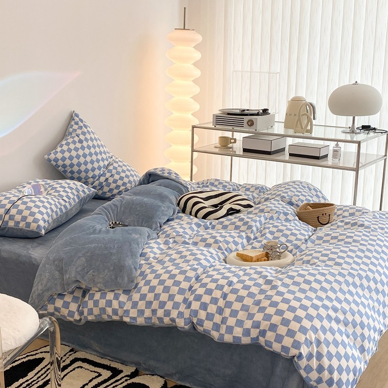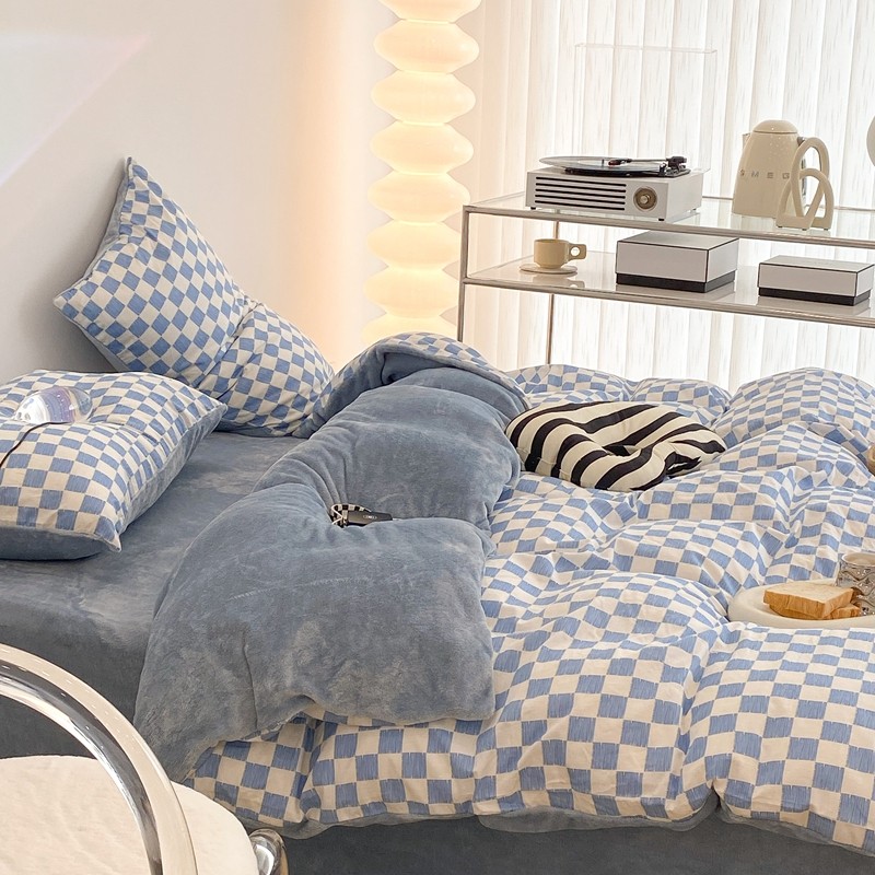 昔可家纺 2021新款棉加牛奶绒四件套 蓝色棋盘格