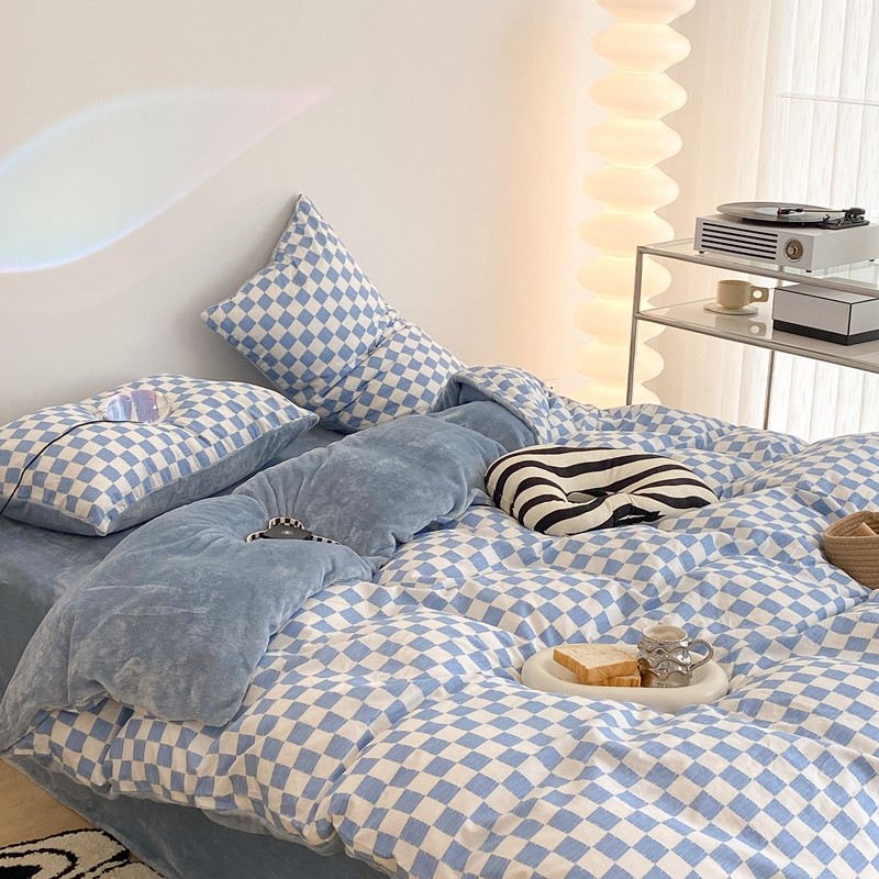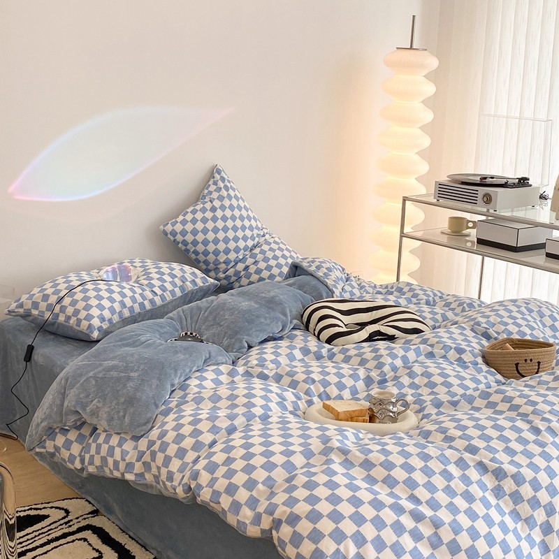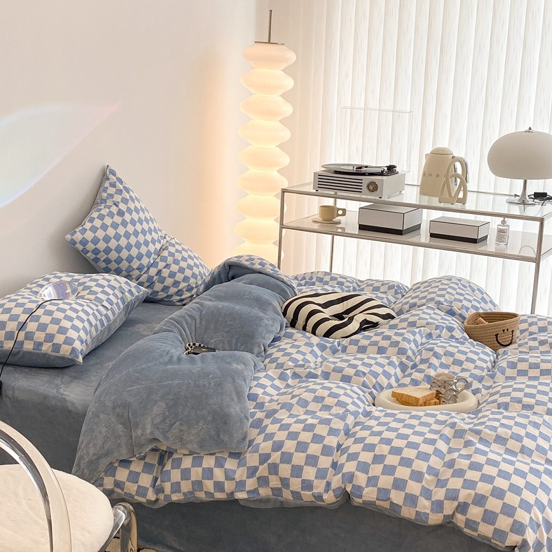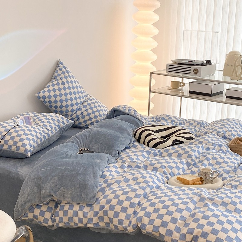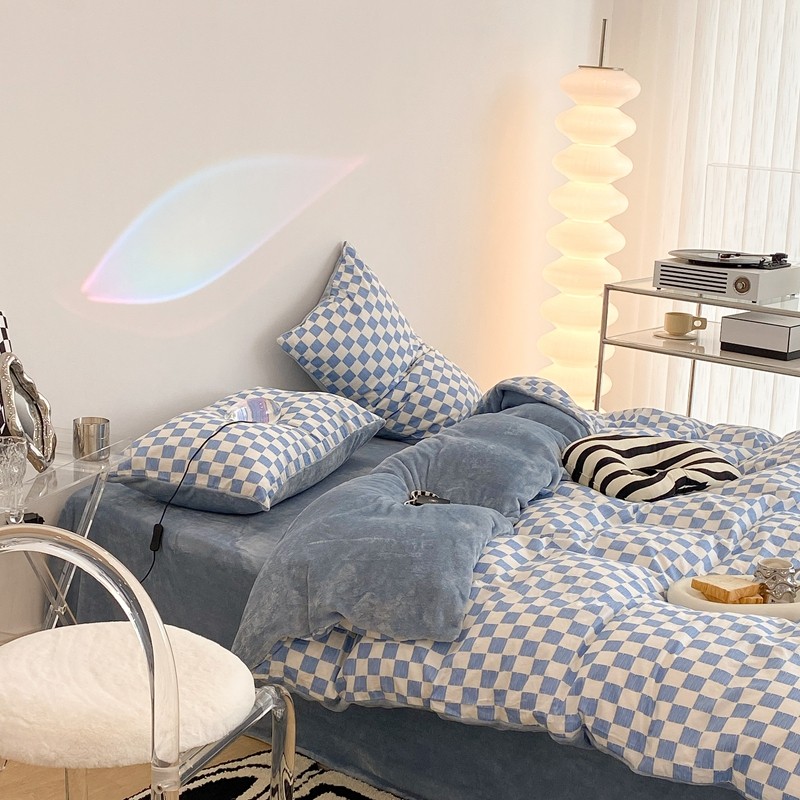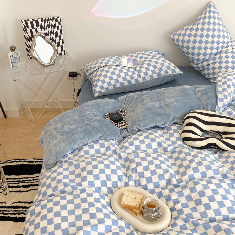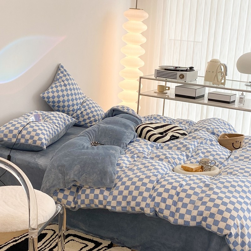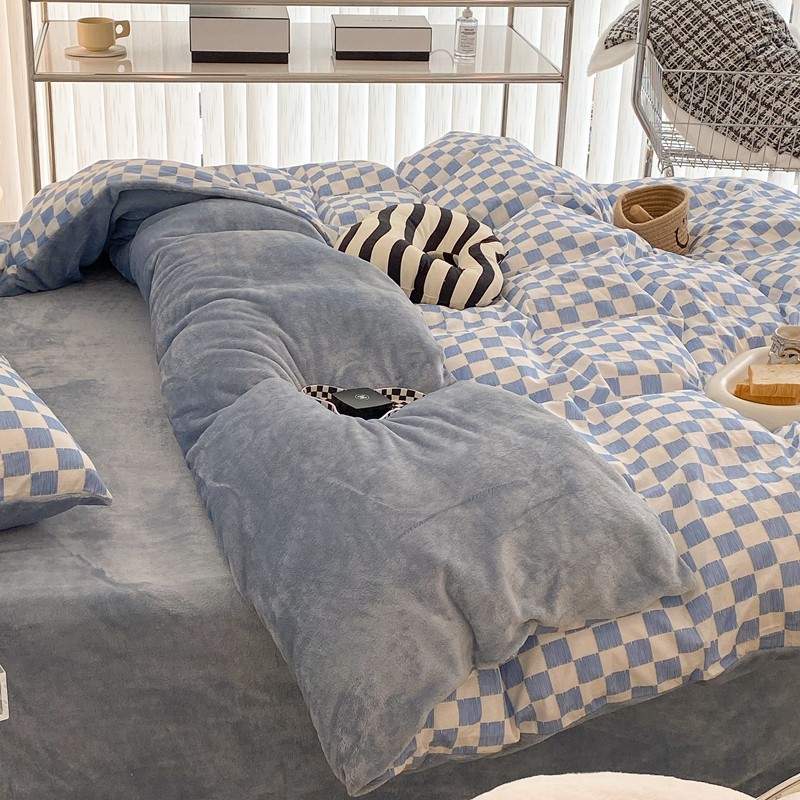 昔可家纺 2021新款棉加牛奶绒四件套 蓝色棋盘格