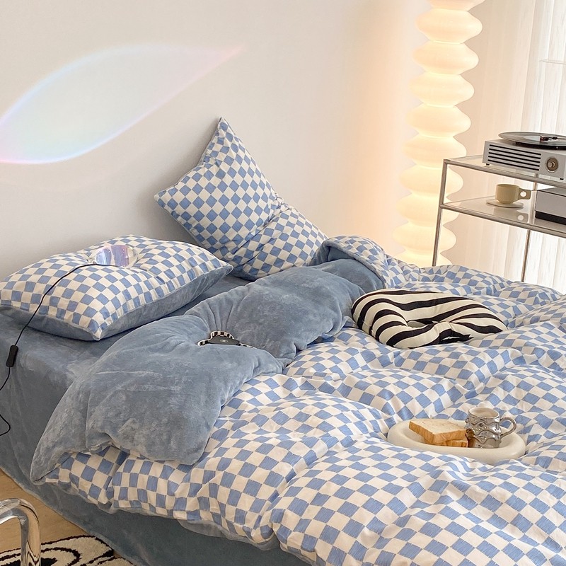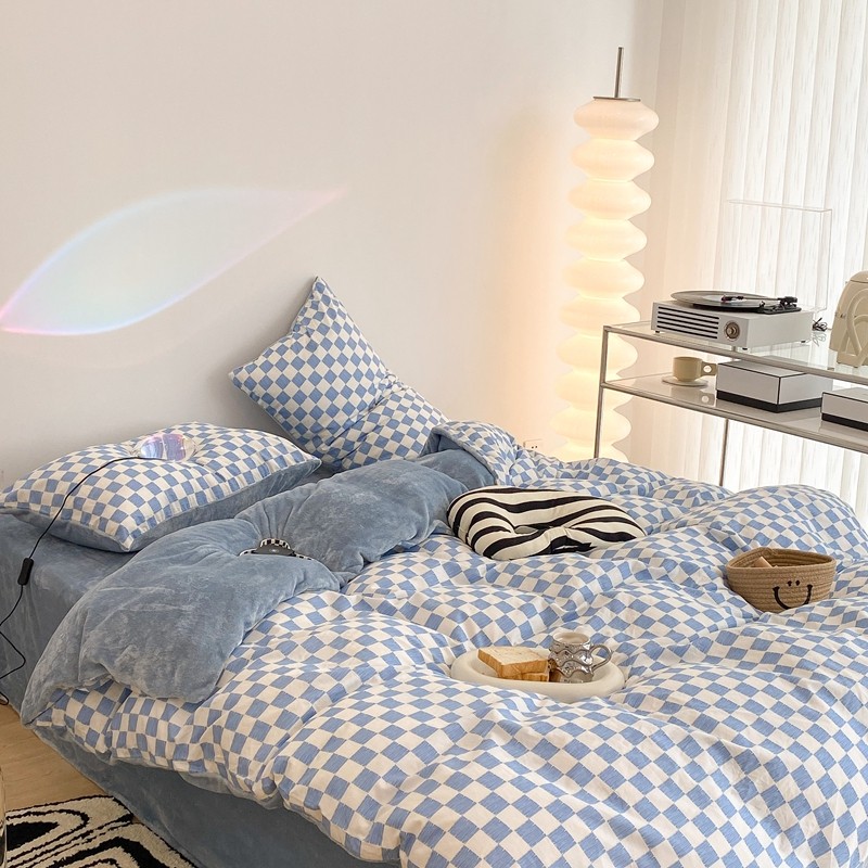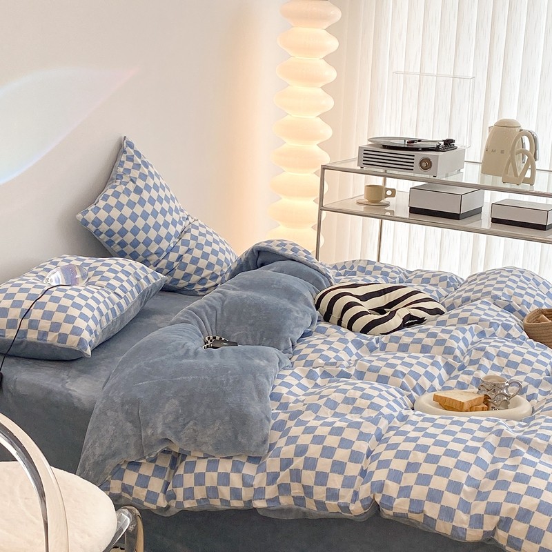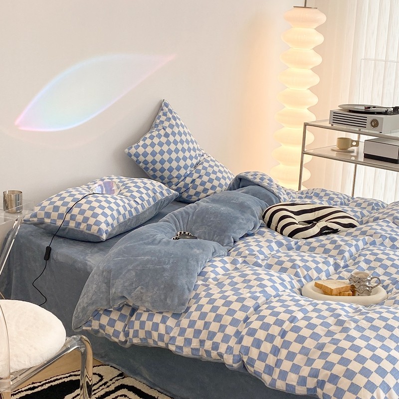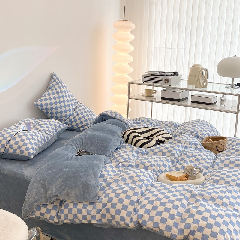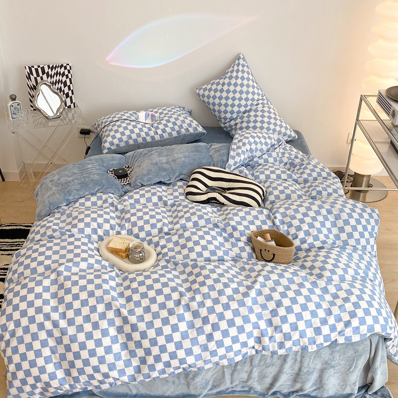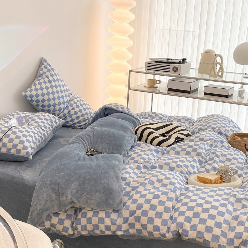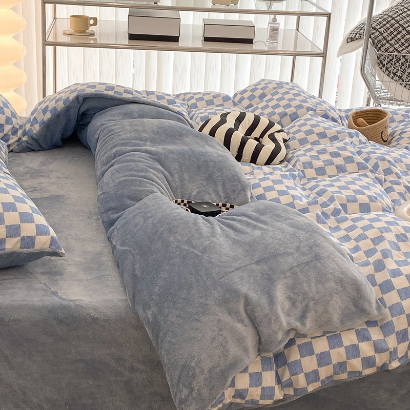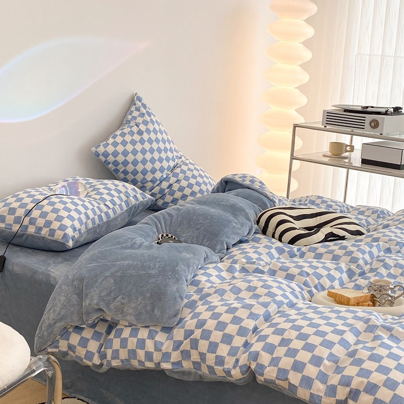 昔可家纺 2021新款棉加牛奶绒四件套 蓝色棋盘格
