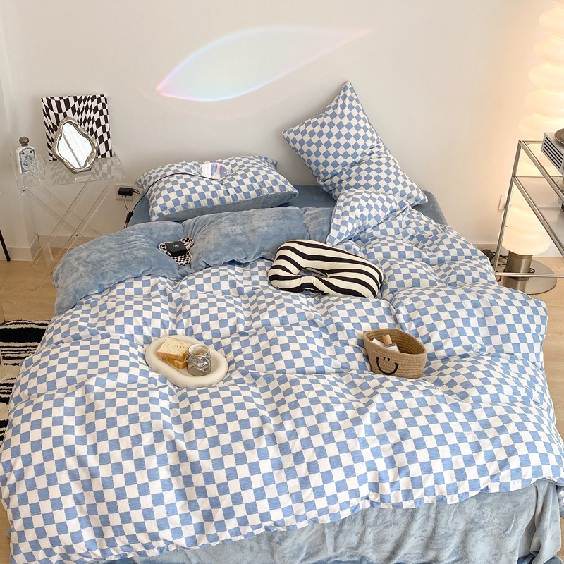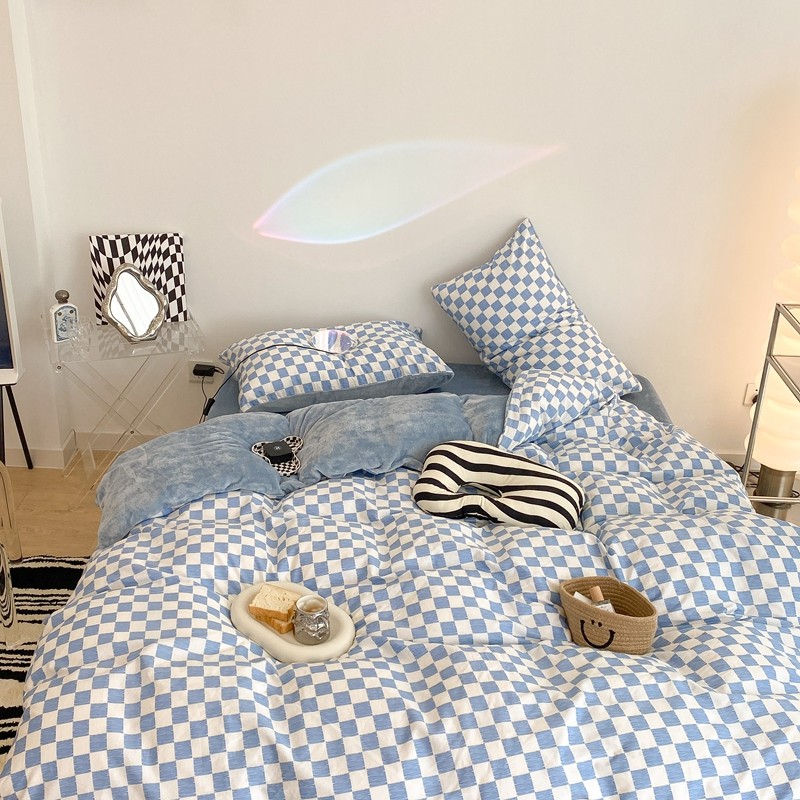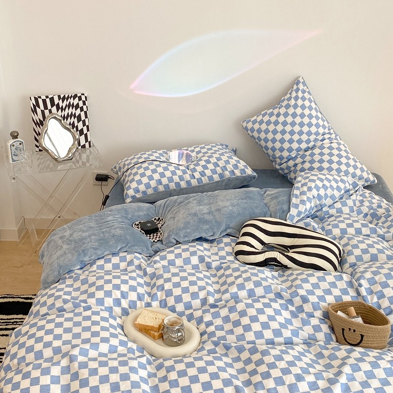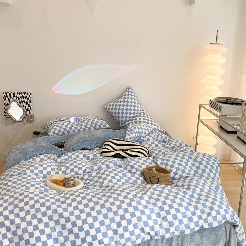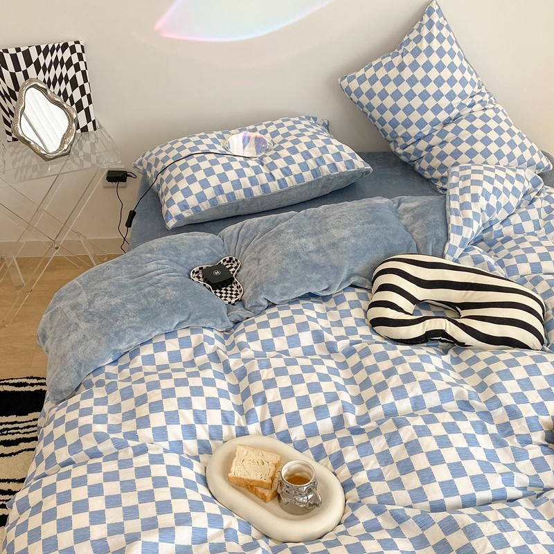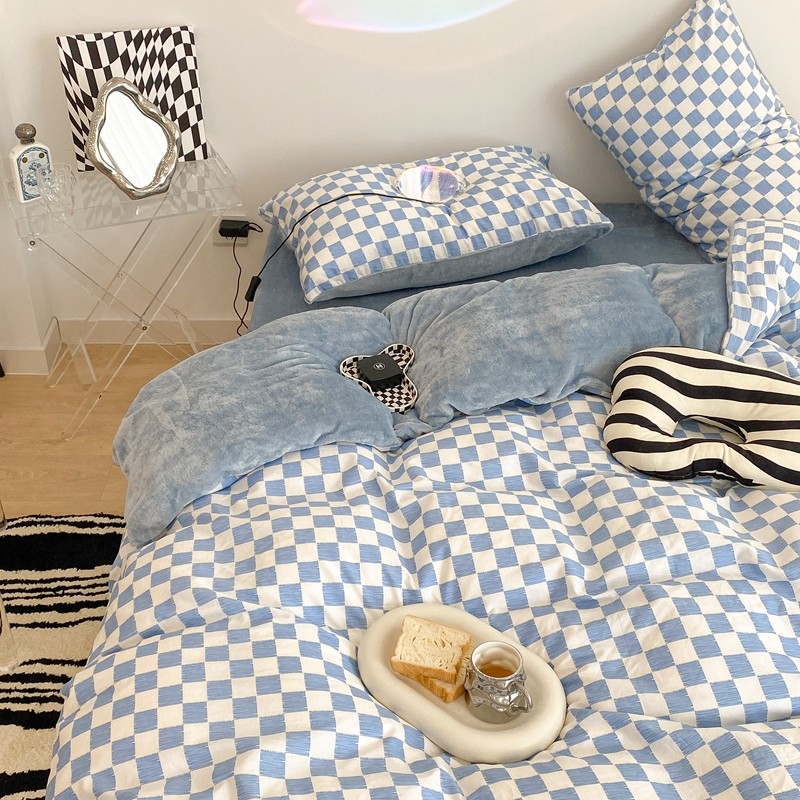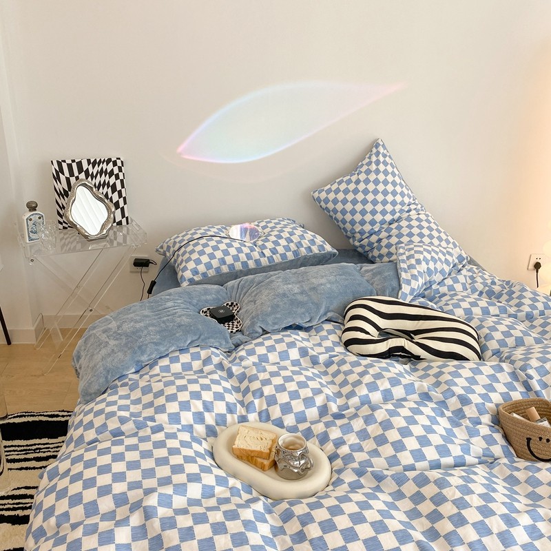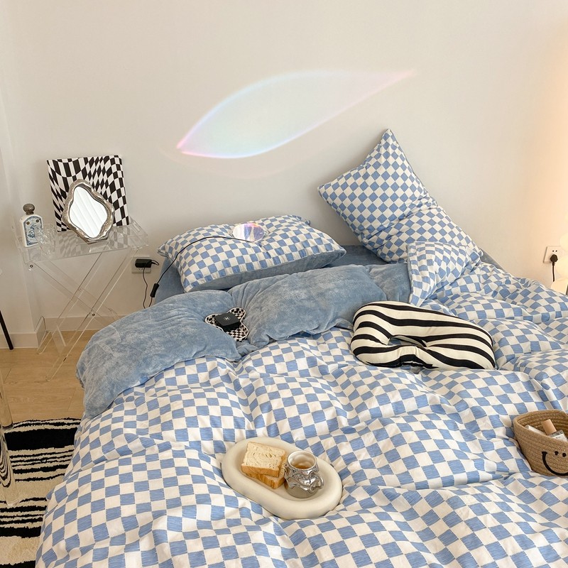 昔可家纺 2021新款棉加牛奶绒四件套 蓝色棋盘格