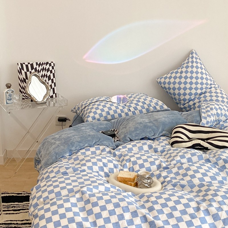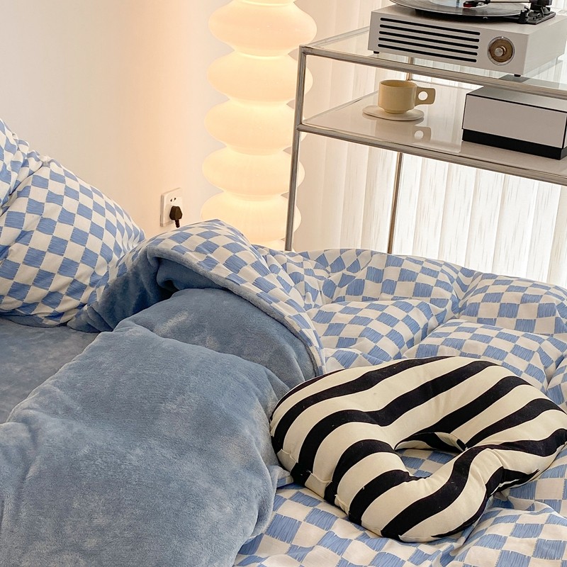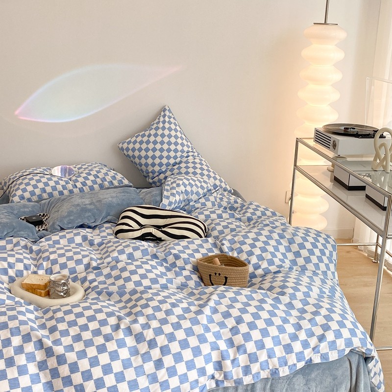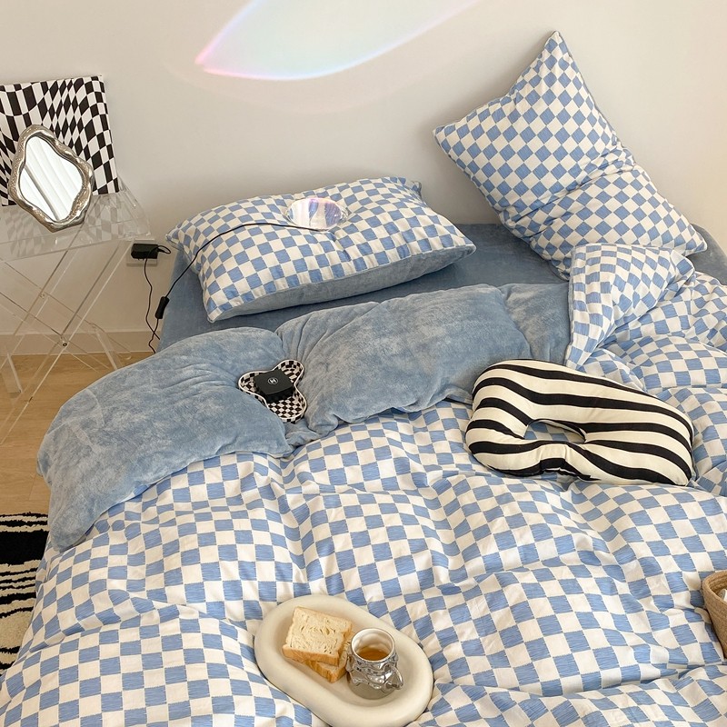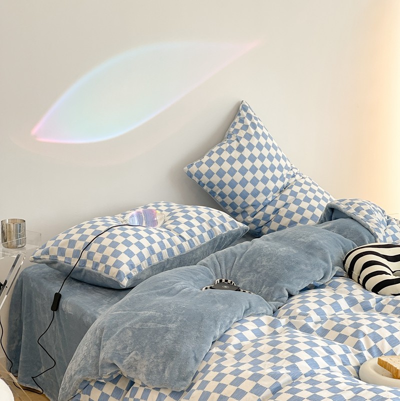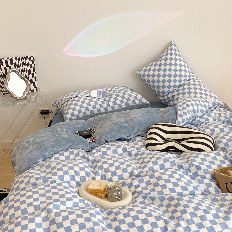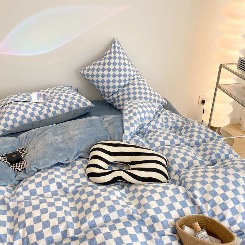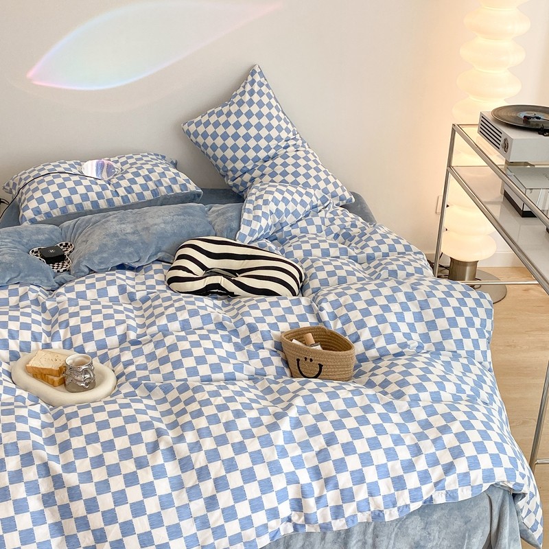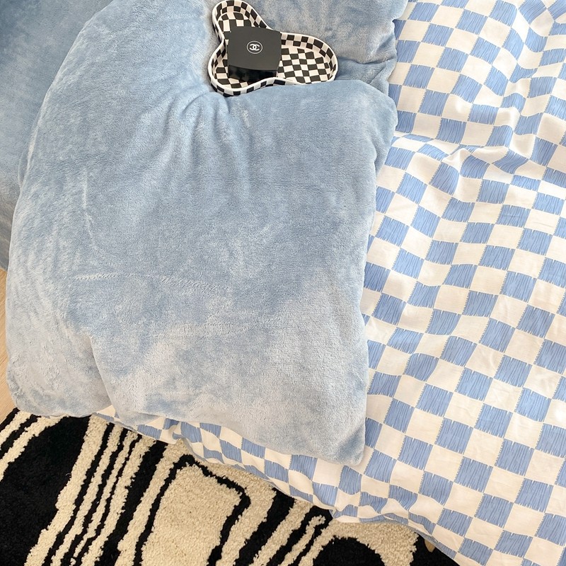 昔可家纺 2021新款棉加牛奶绒四件套 蓝色棋盘格