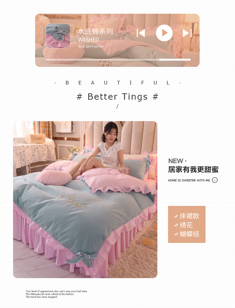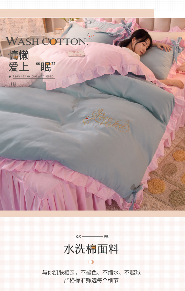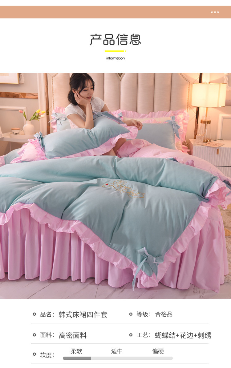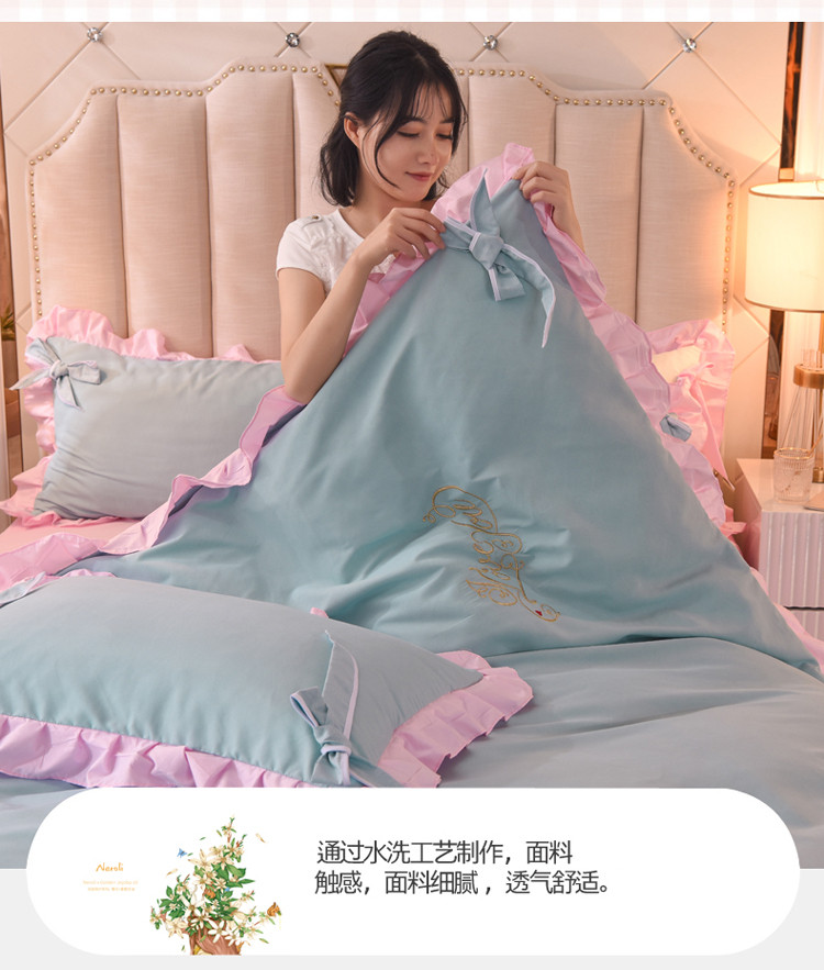当前位置: 91家纺网 > 商品网购 > 床品套件 > 四件套 > 水洗棉四件套 > 欧冠 2022新款潮系列爱巢款床裙款刺绣四件套 兰粉