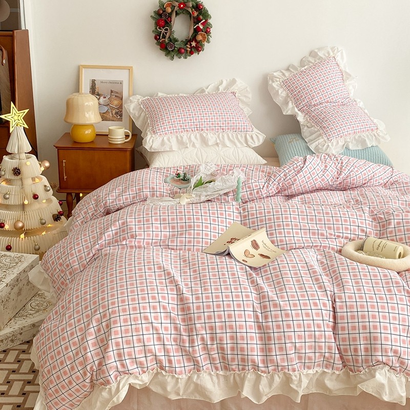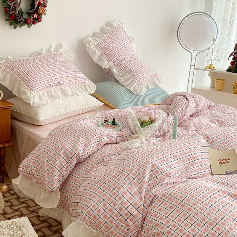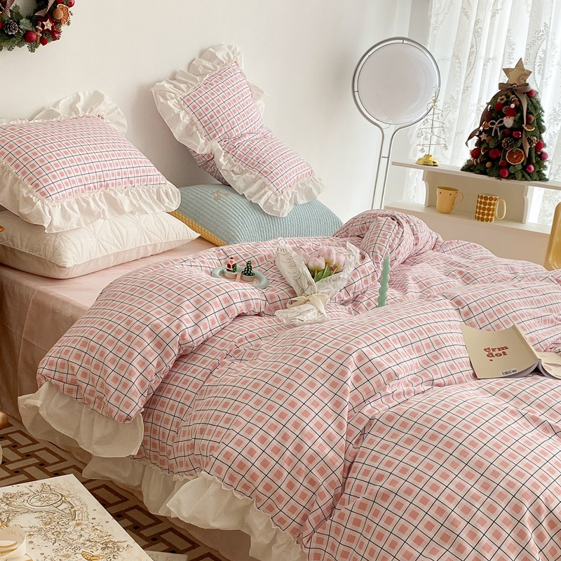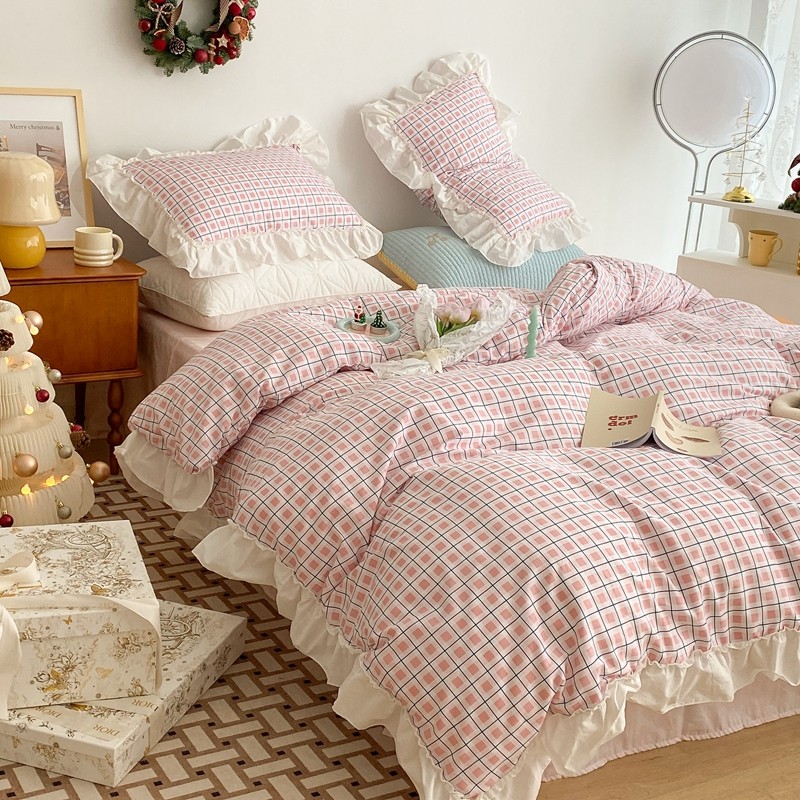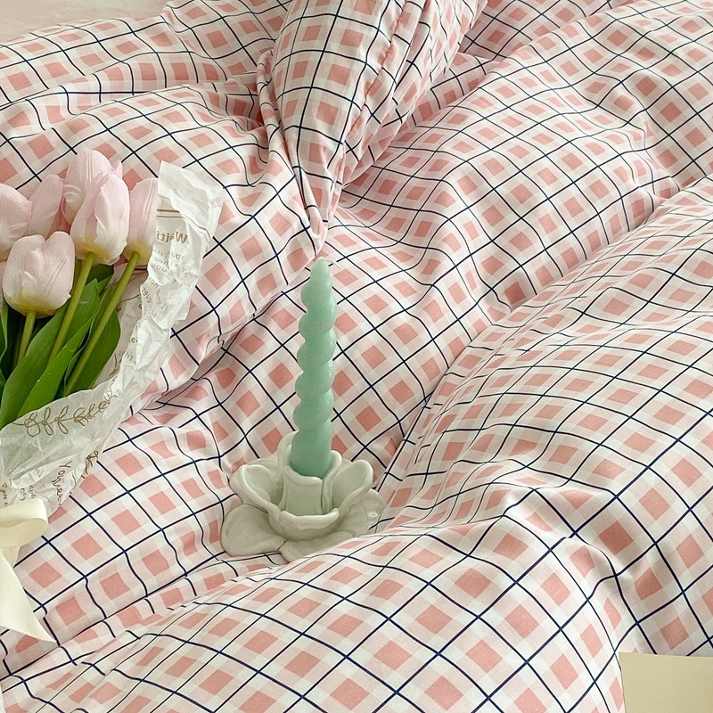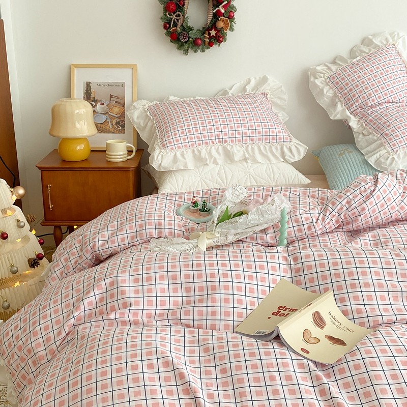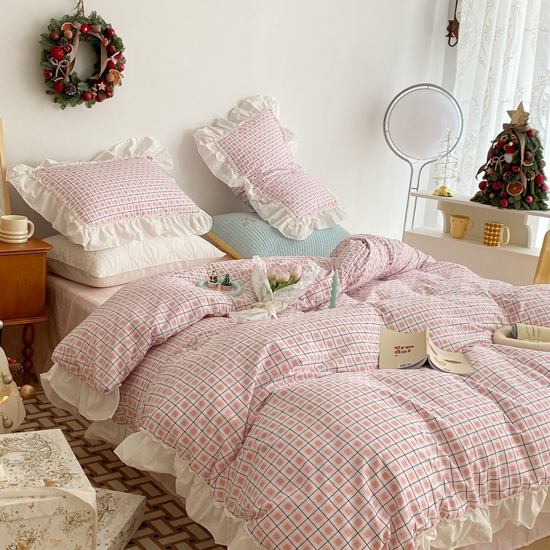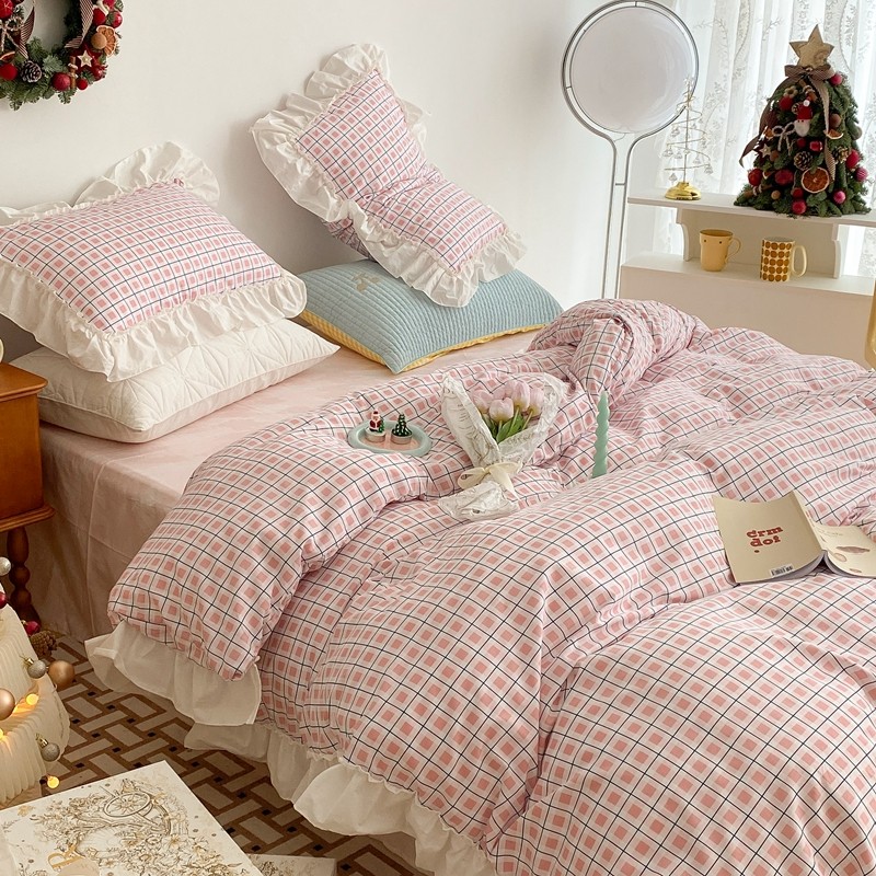 昔可2022新款花边格子系列四件套 士多啤梨粉