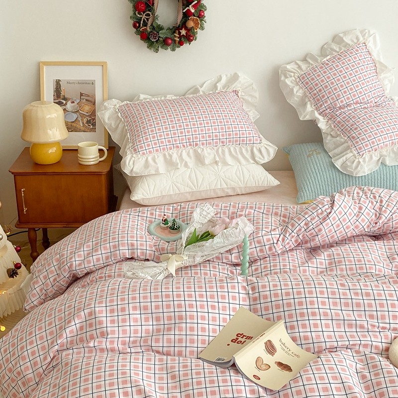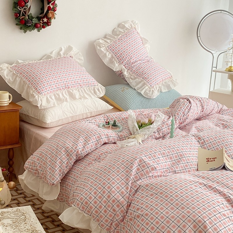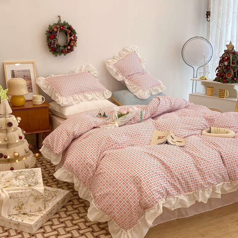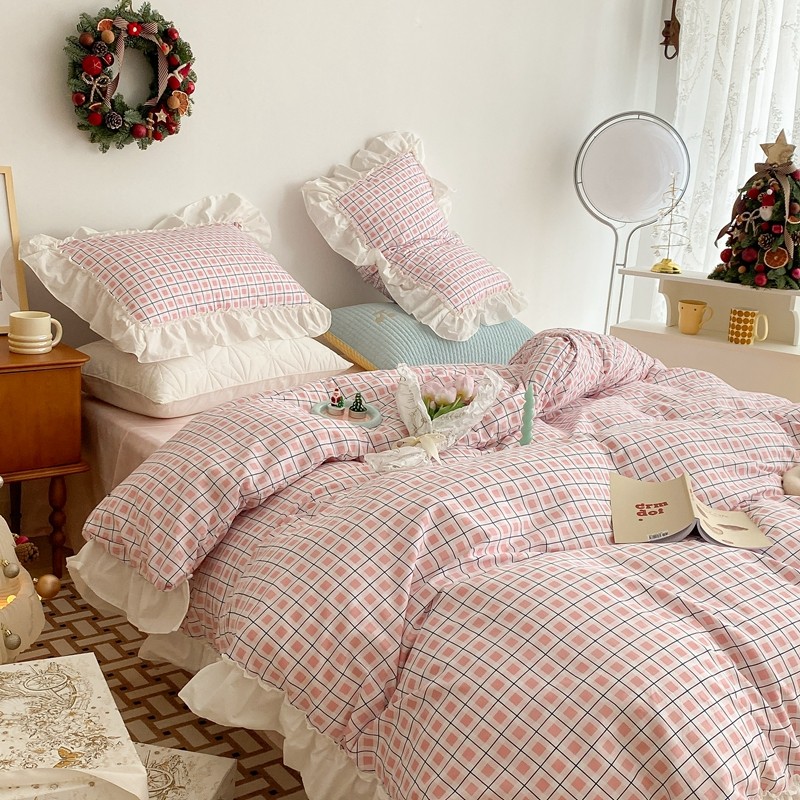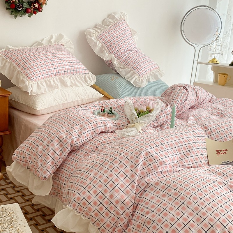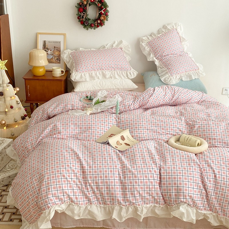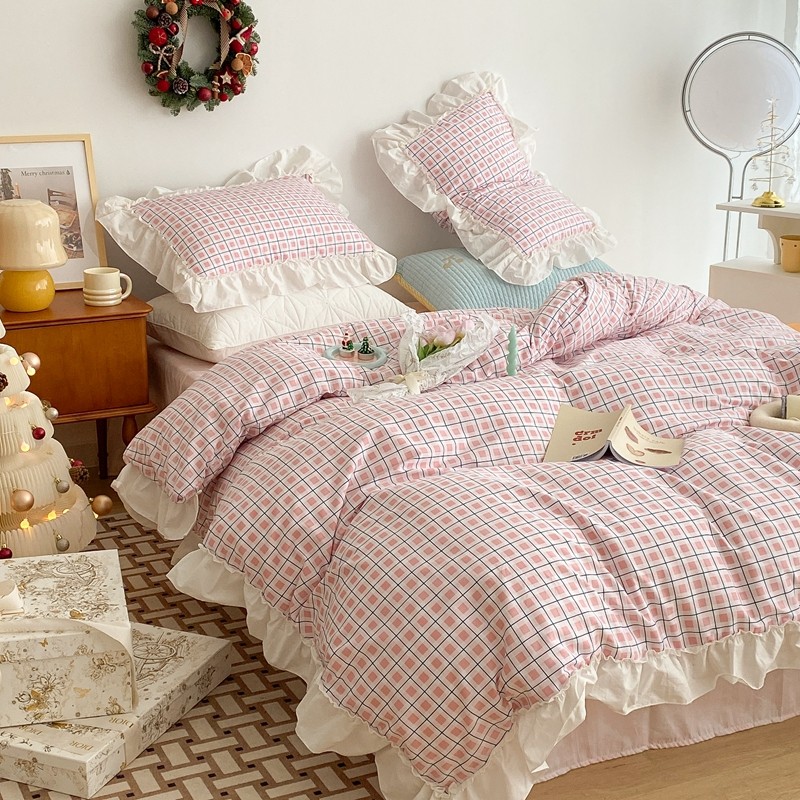 昔可2022新款花边格子系列四件套 士多啤梨粉