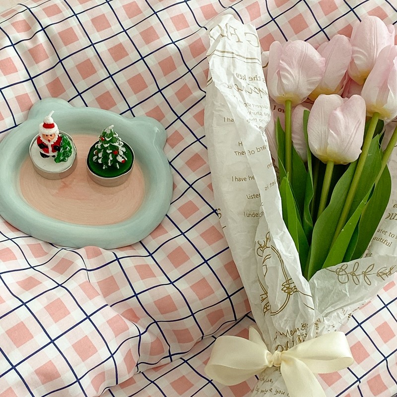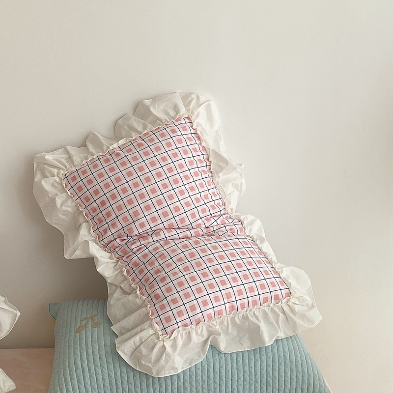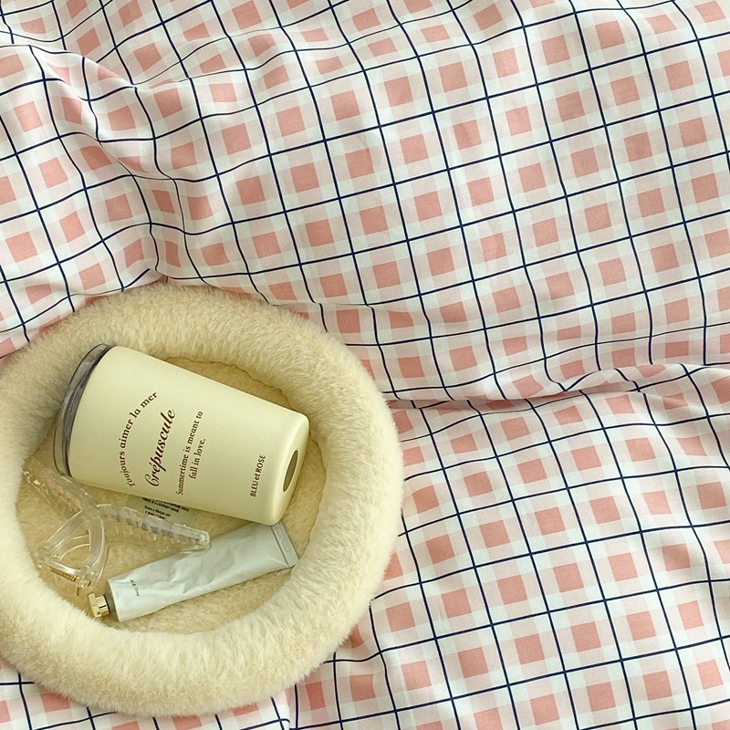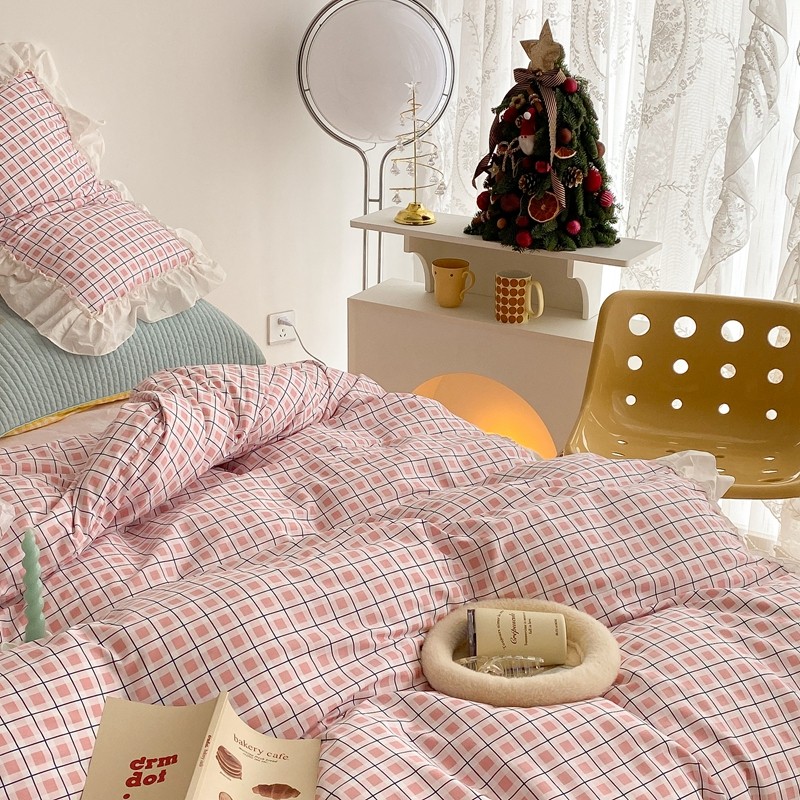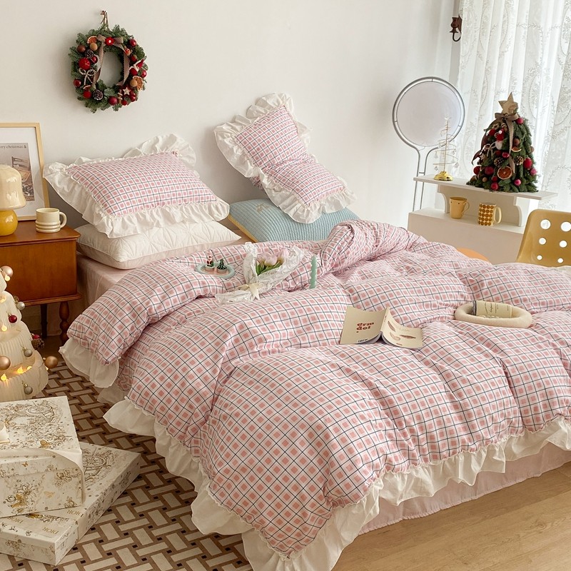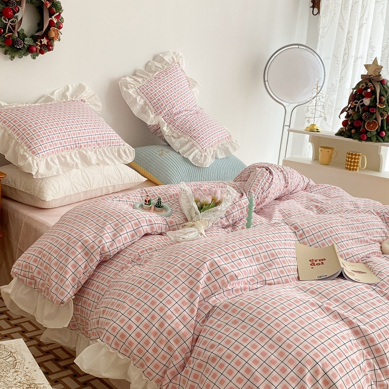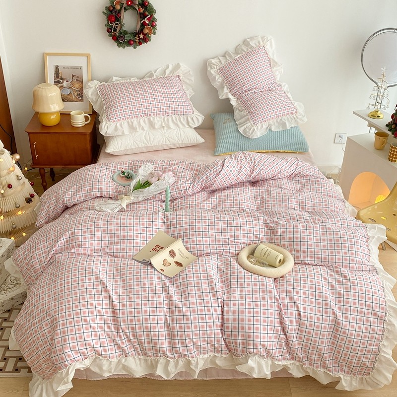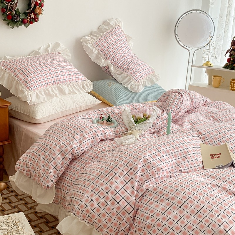 昔可2022新款花边格子系列四件套 士多啤梨粉