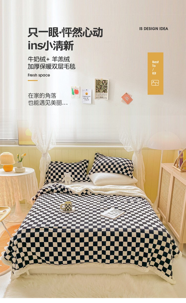 沐慕 2022新款牛奶绒拼羊羔绒毛毯 黑白格