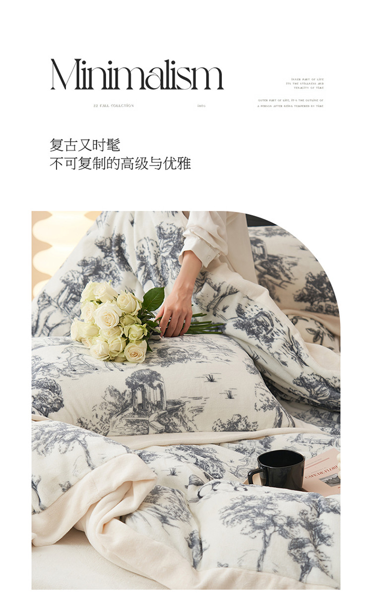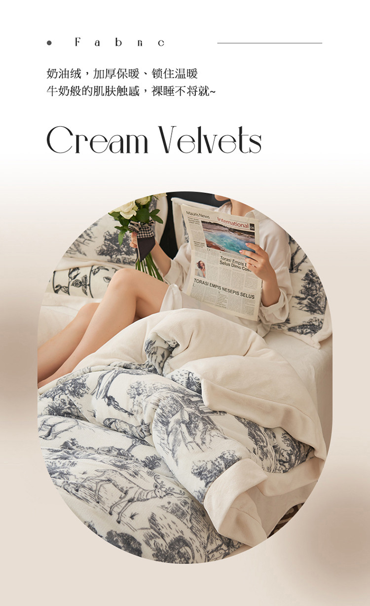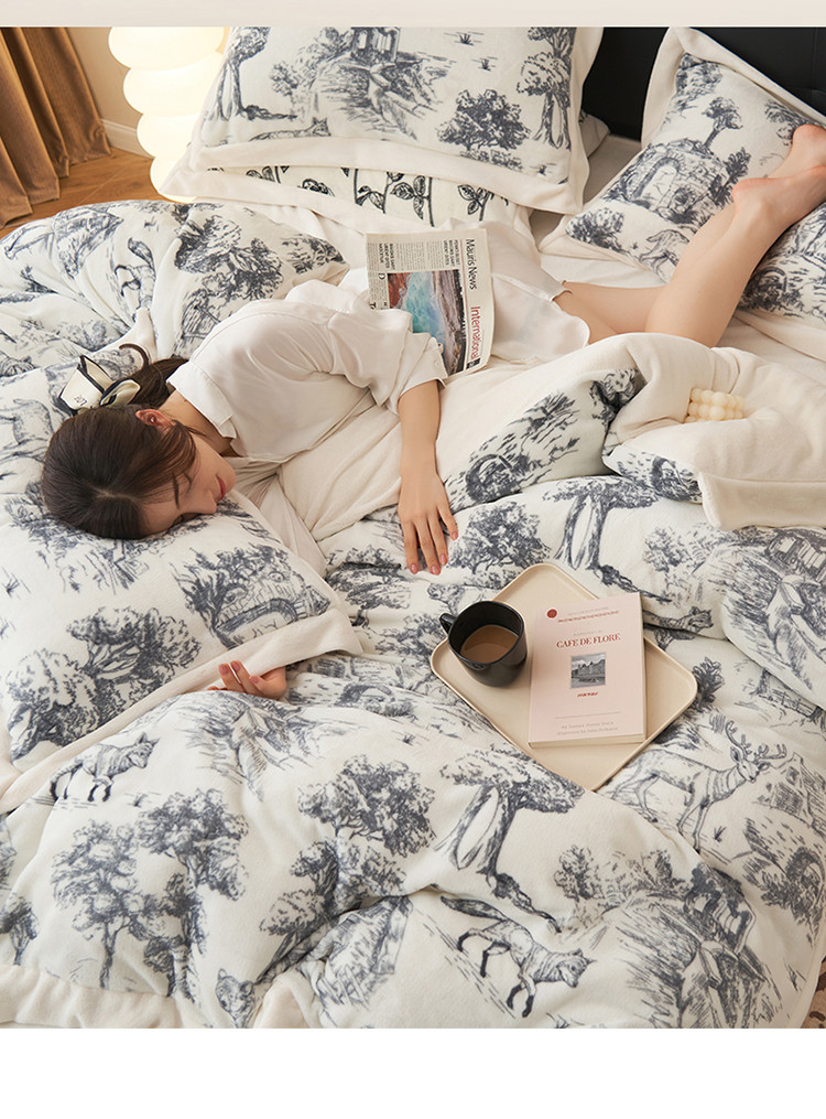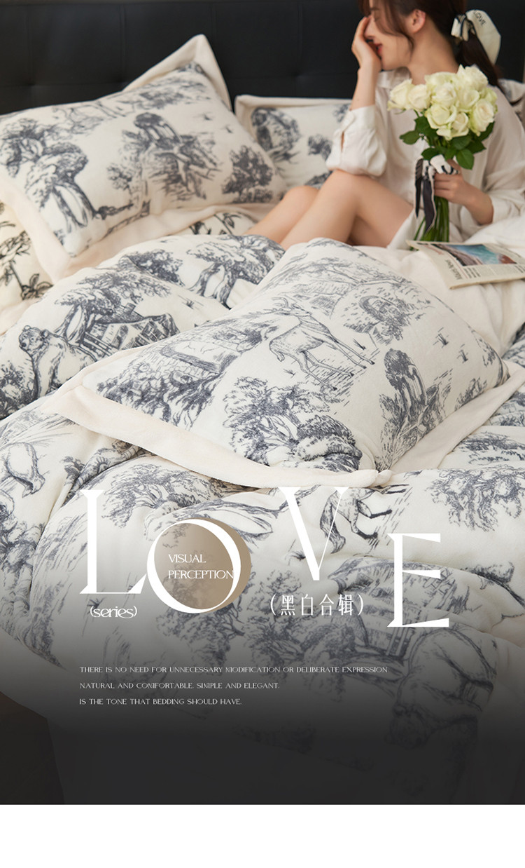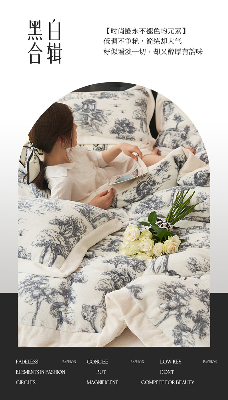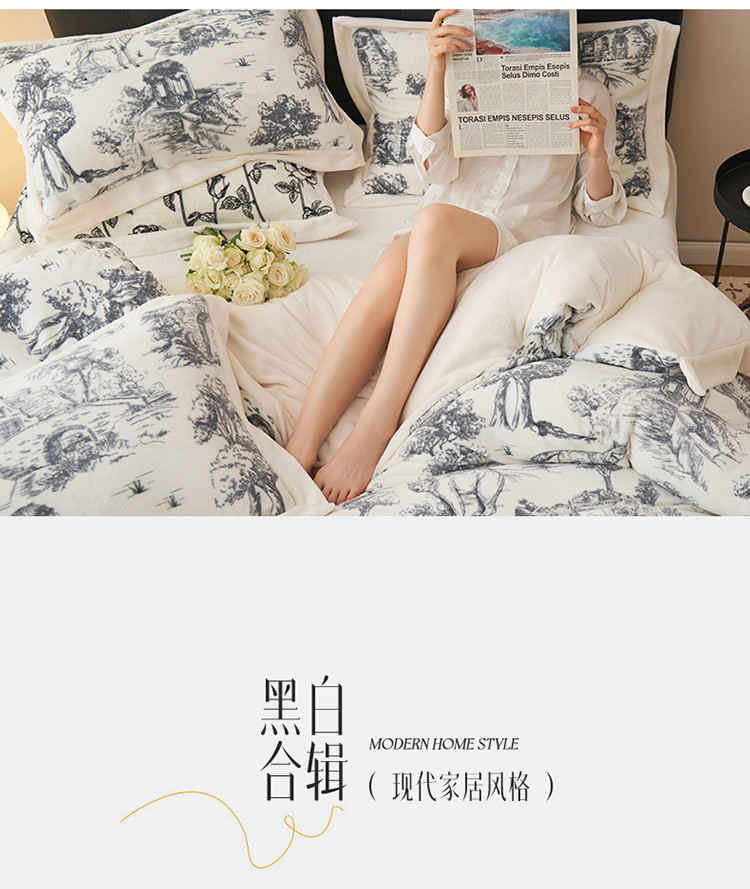 商品名称:晨曦慵懒风黑白合辑极简主义奶油绒牛奶绒四件套黑白调调森林城堡