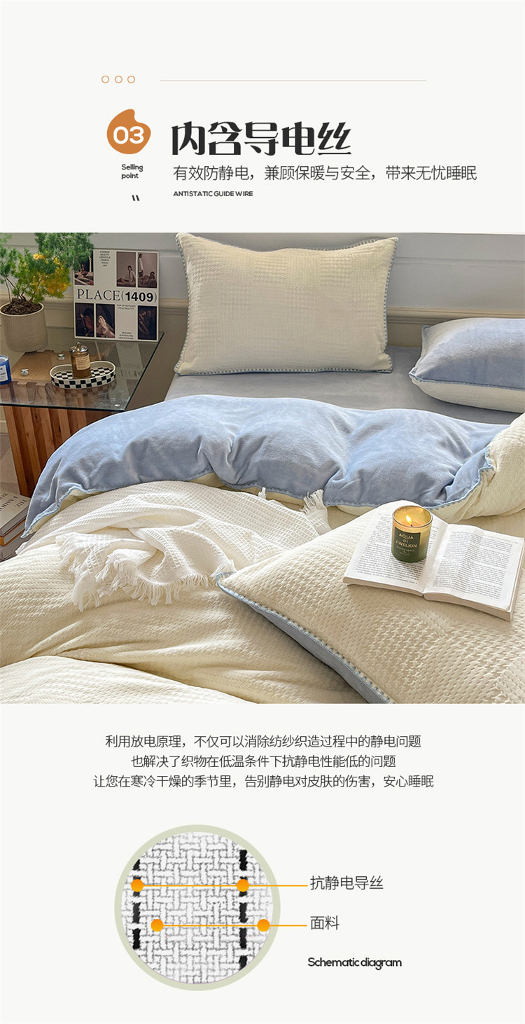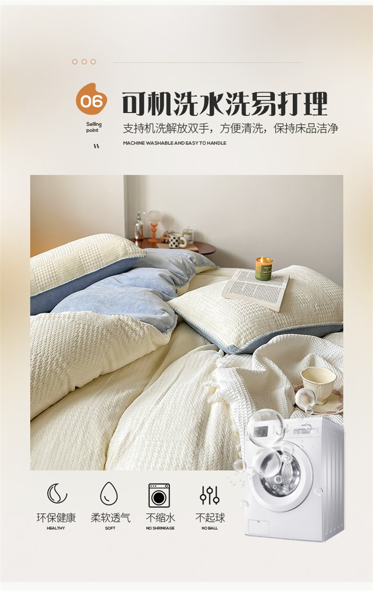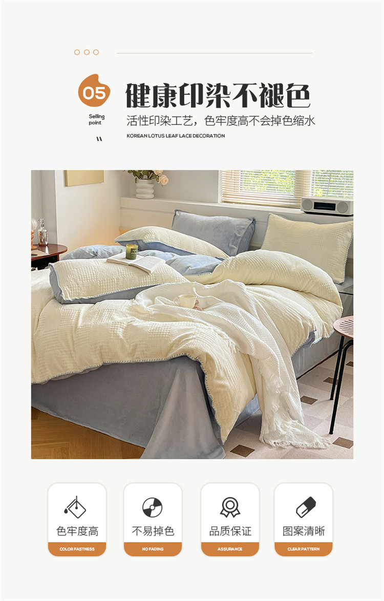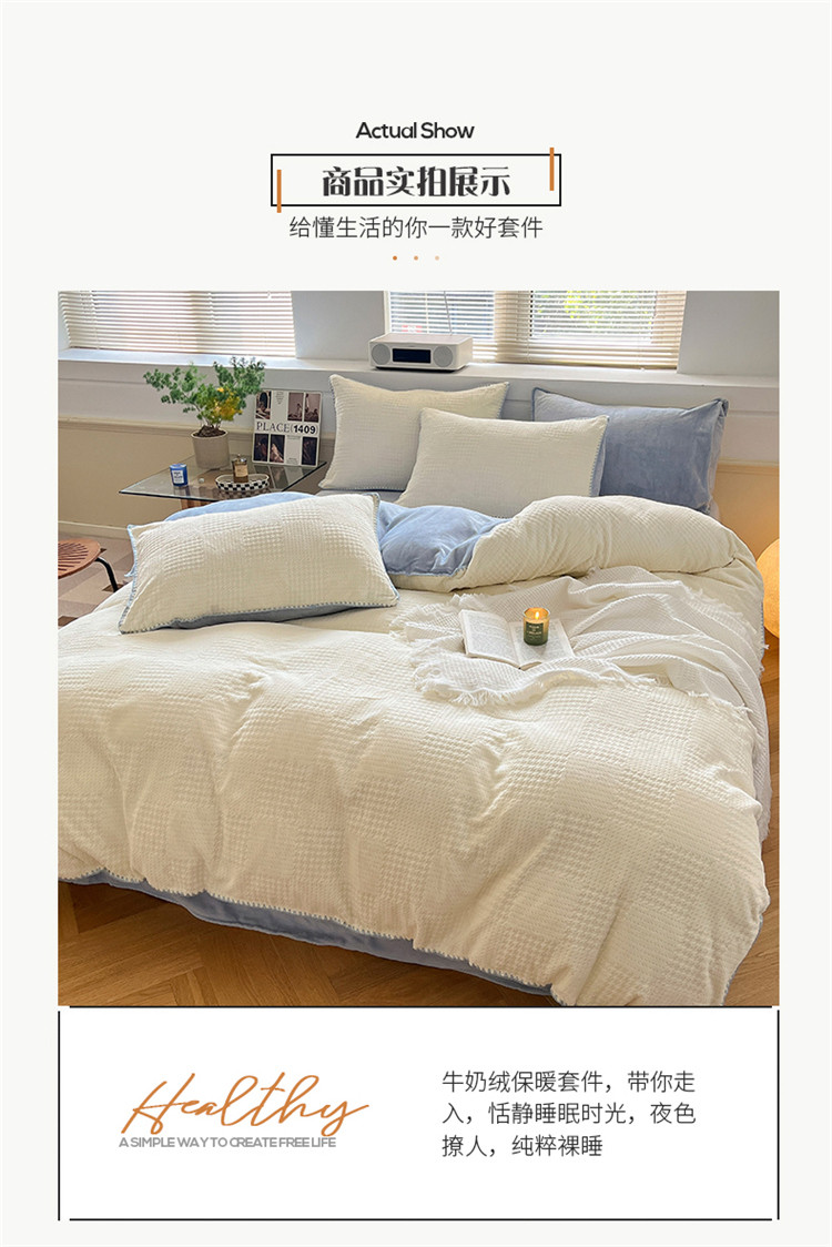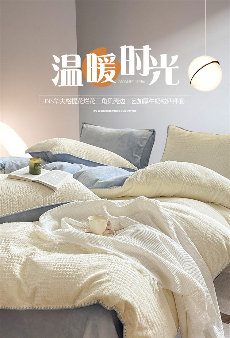 商品名称:桃子 新款A类华夫格千鸟格烂花加厚牛奶绒四件套 绒华夫格白兰