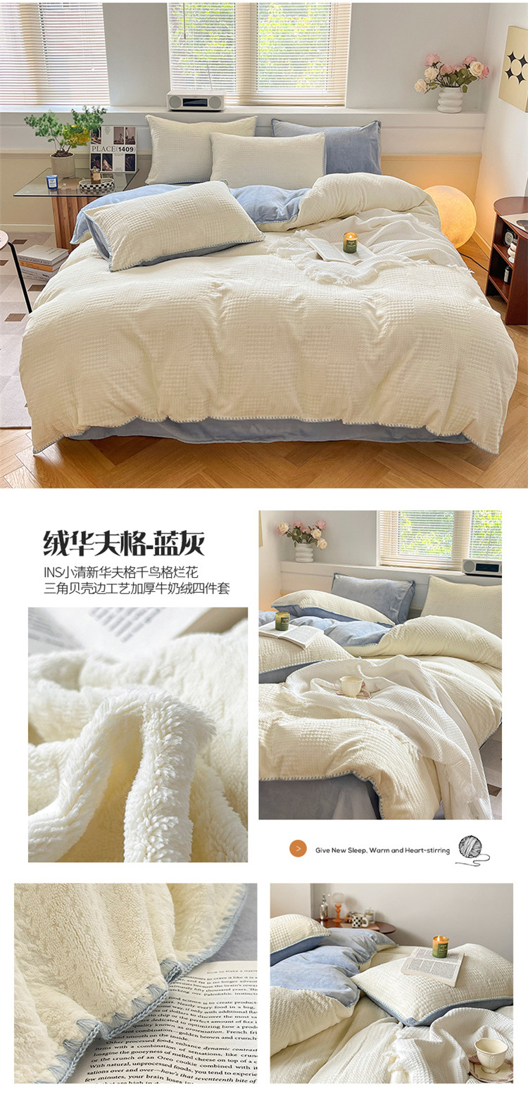 桃子 新款A类华夫格千鸟格烂花加厚牛奶绒四件套 绒华夫格白兰