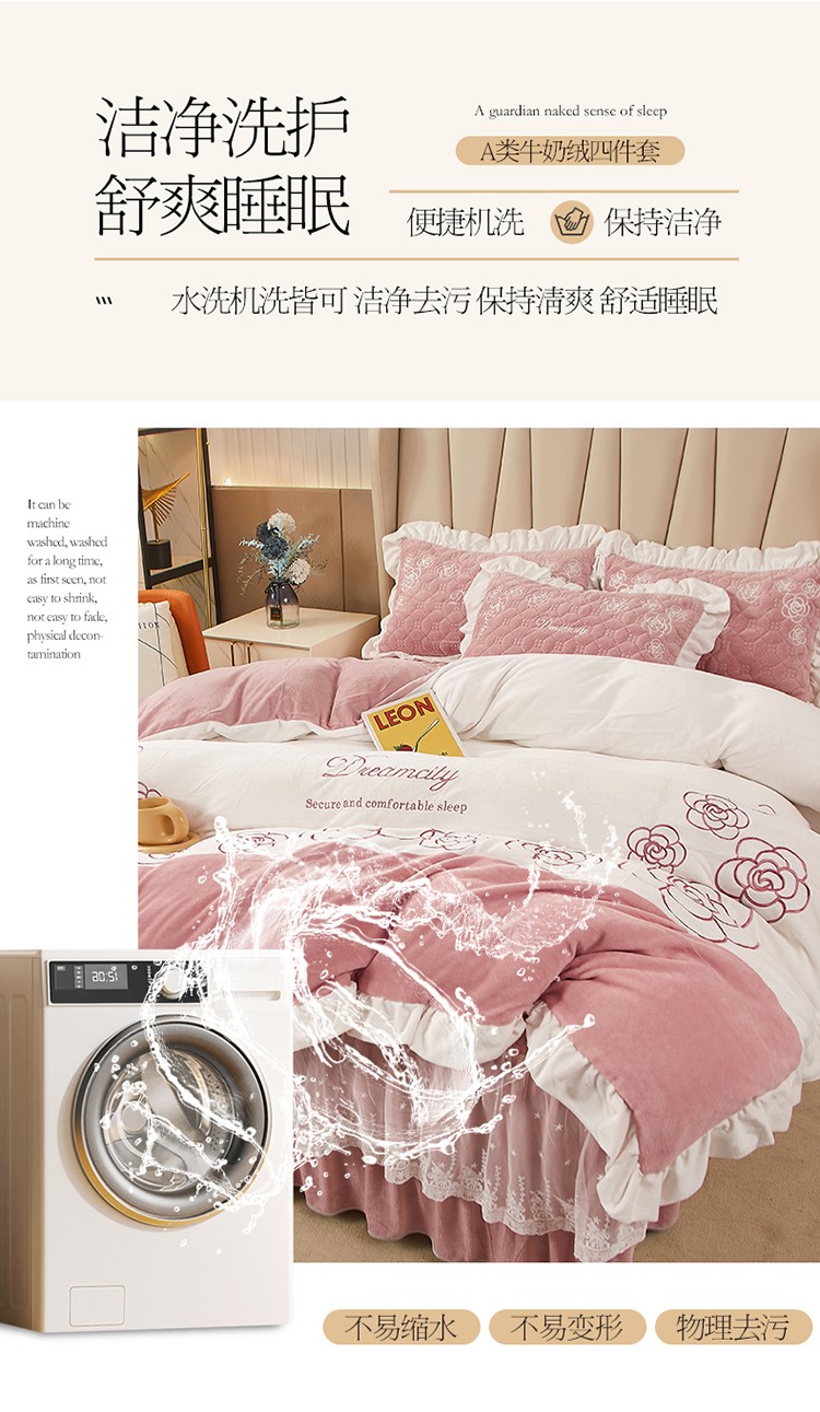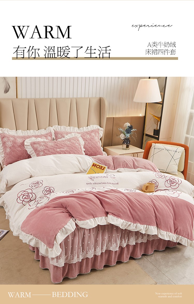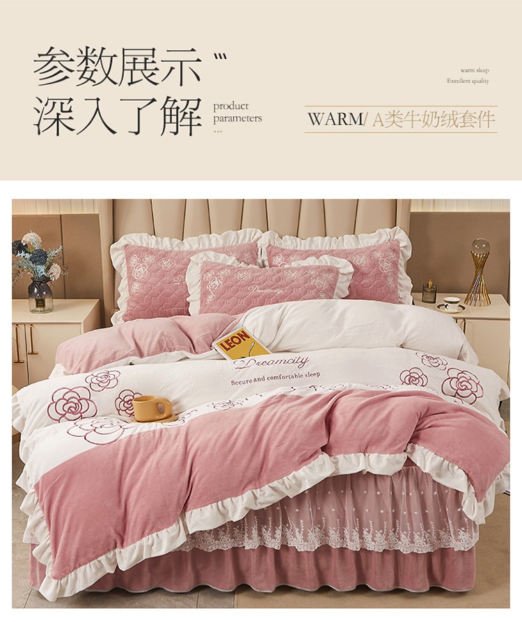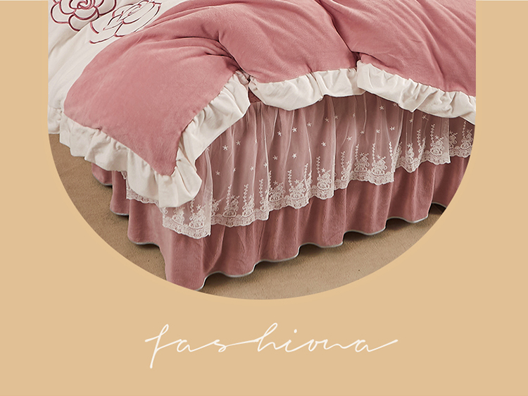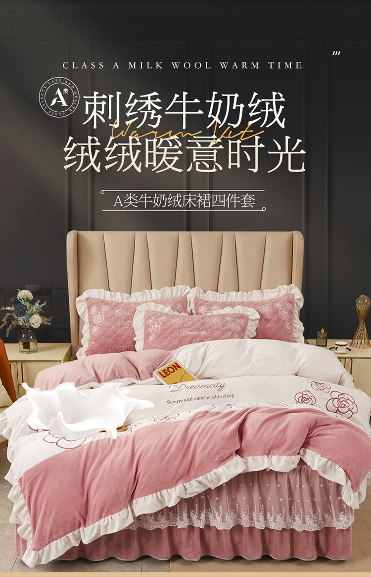• 91家纺网 家纺一手货源 找家纺 宜凡 2022新款A类牛奶绒绣花床裙三四件套 花间序语-豆沙