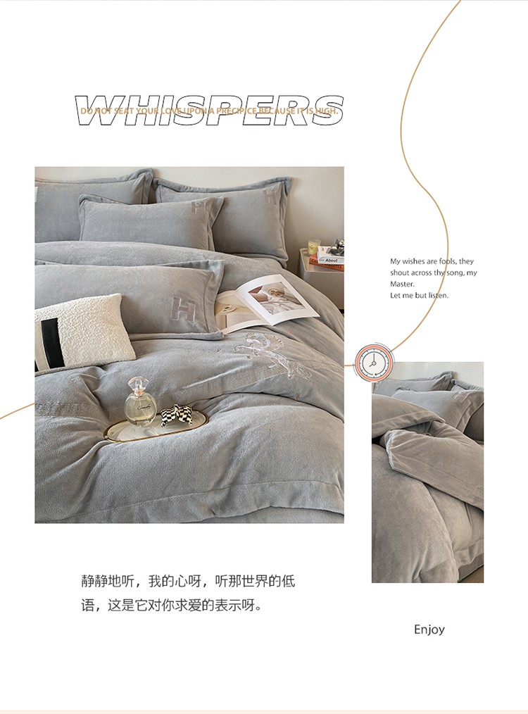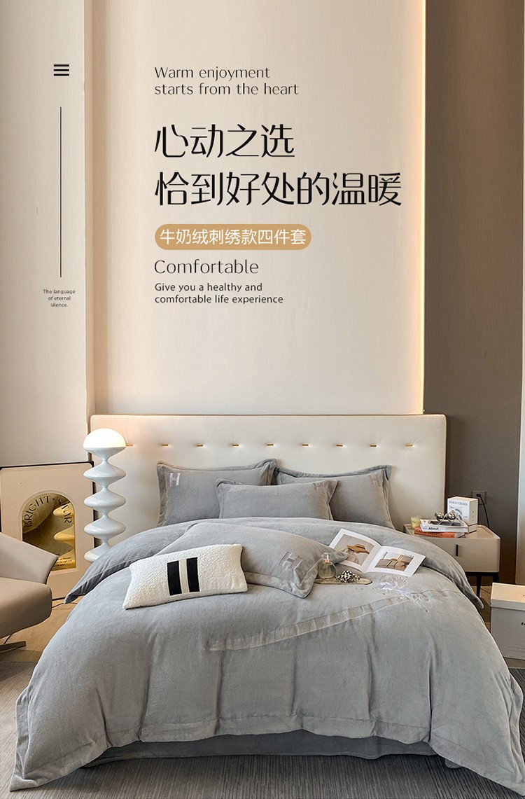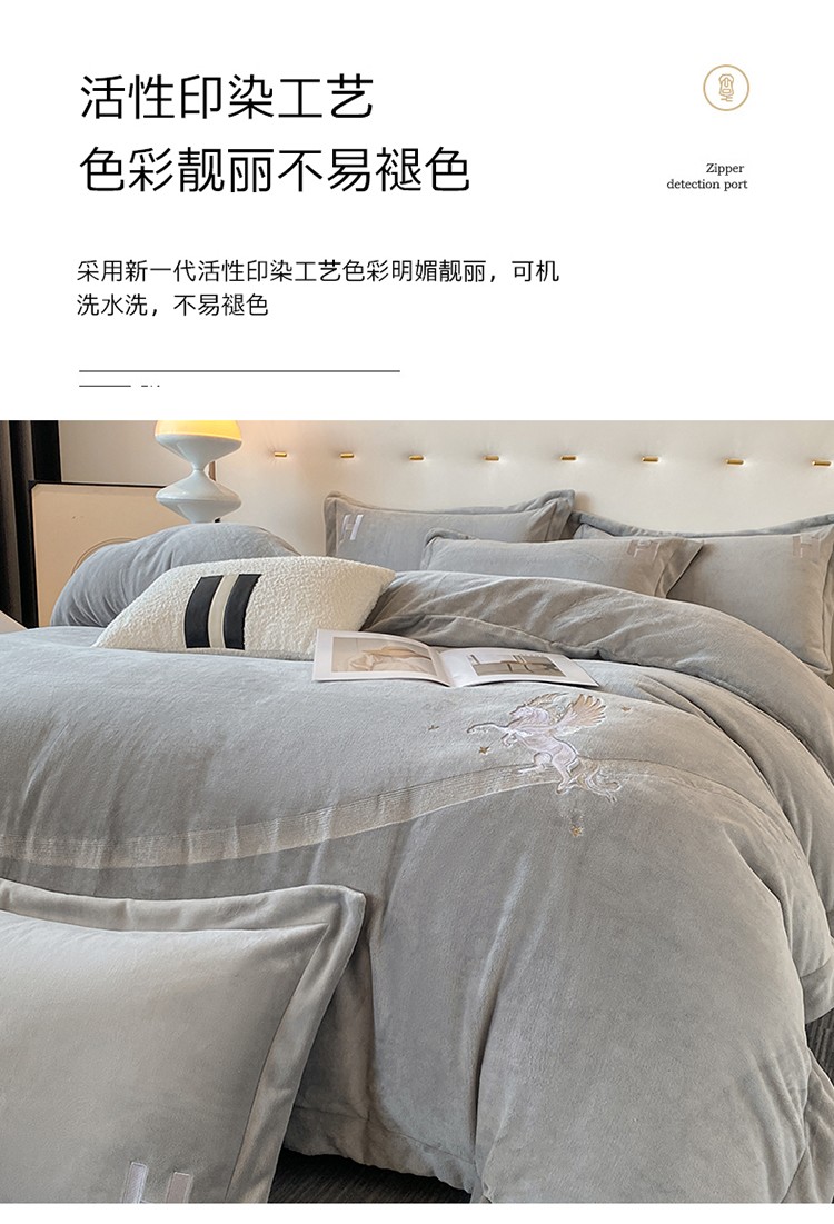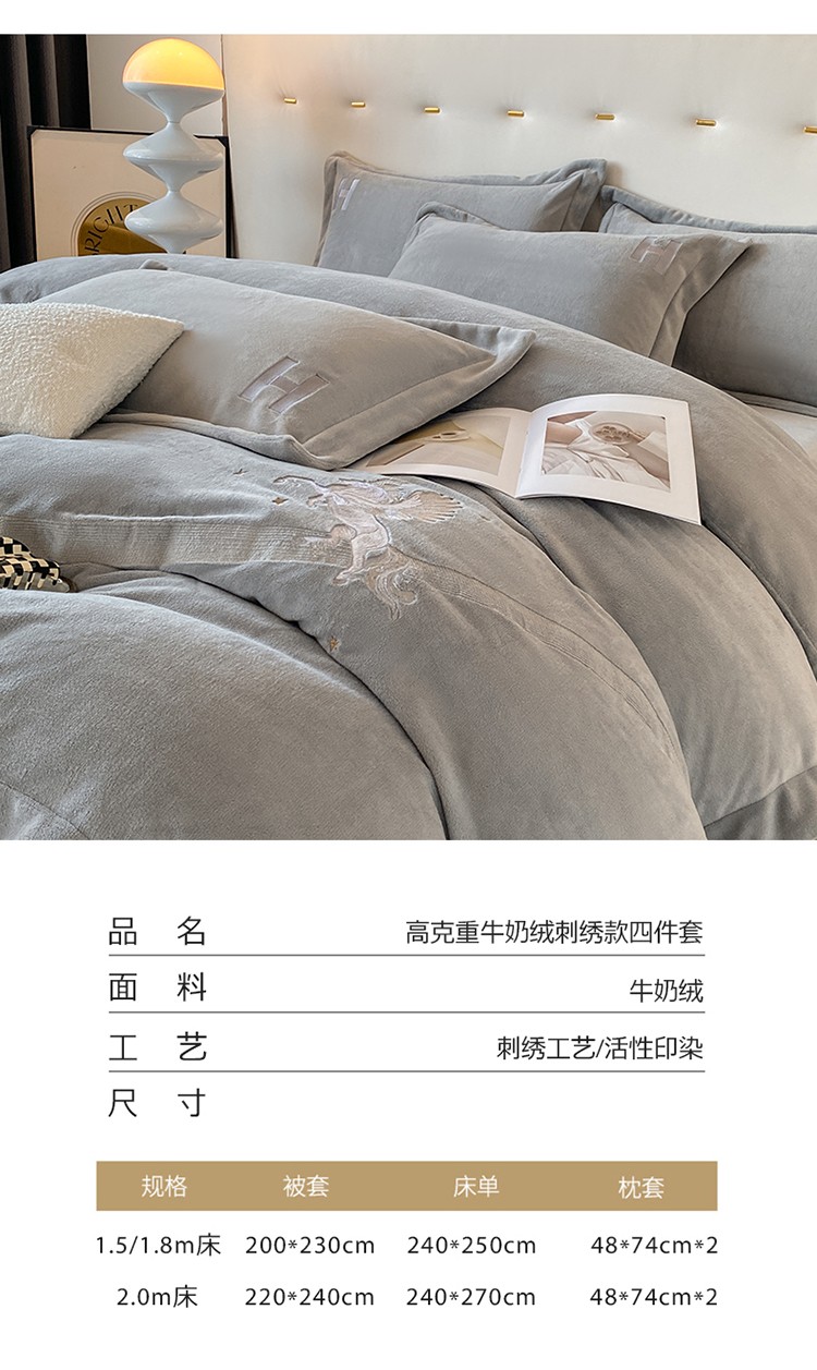 魅都新款高克重牛奶绒刺绣款四件套 浅灰