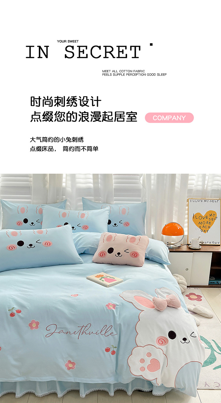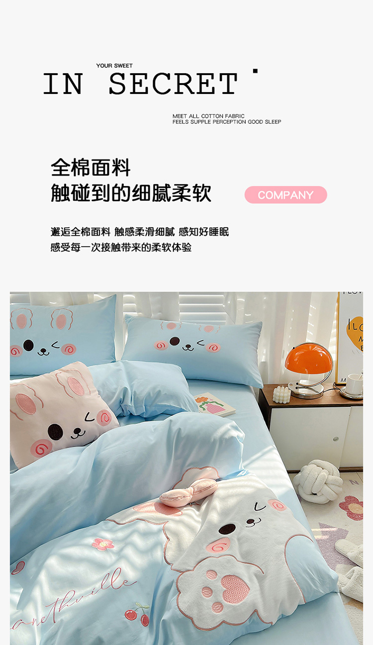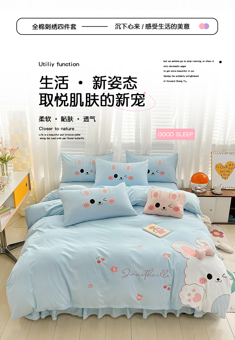 当前位置: 91家纺网 > 商品网购 > 床品套件 > 四件套 > 全棉普通四件套 > 亲亲公主 2025新款全棉可爱卡通贴布绣四件套-可爱兔-蓝(配蝴蝶结)