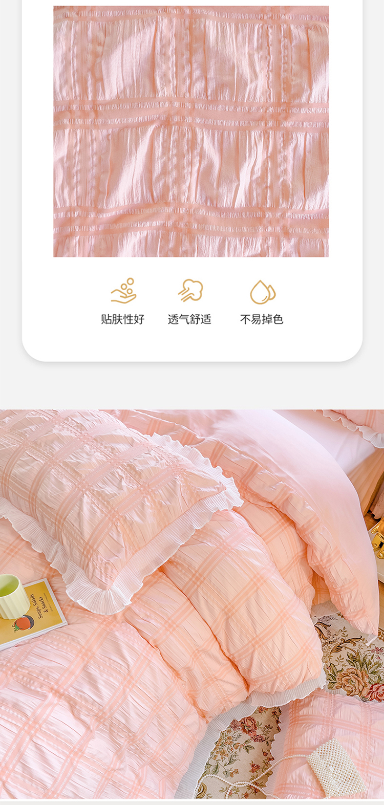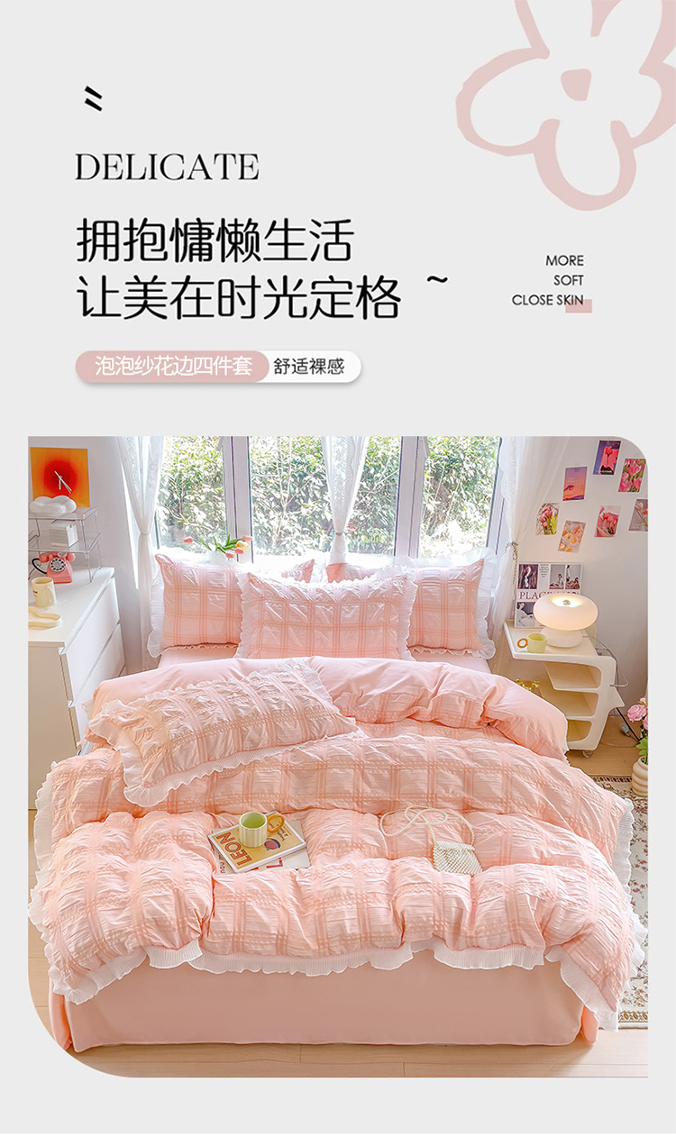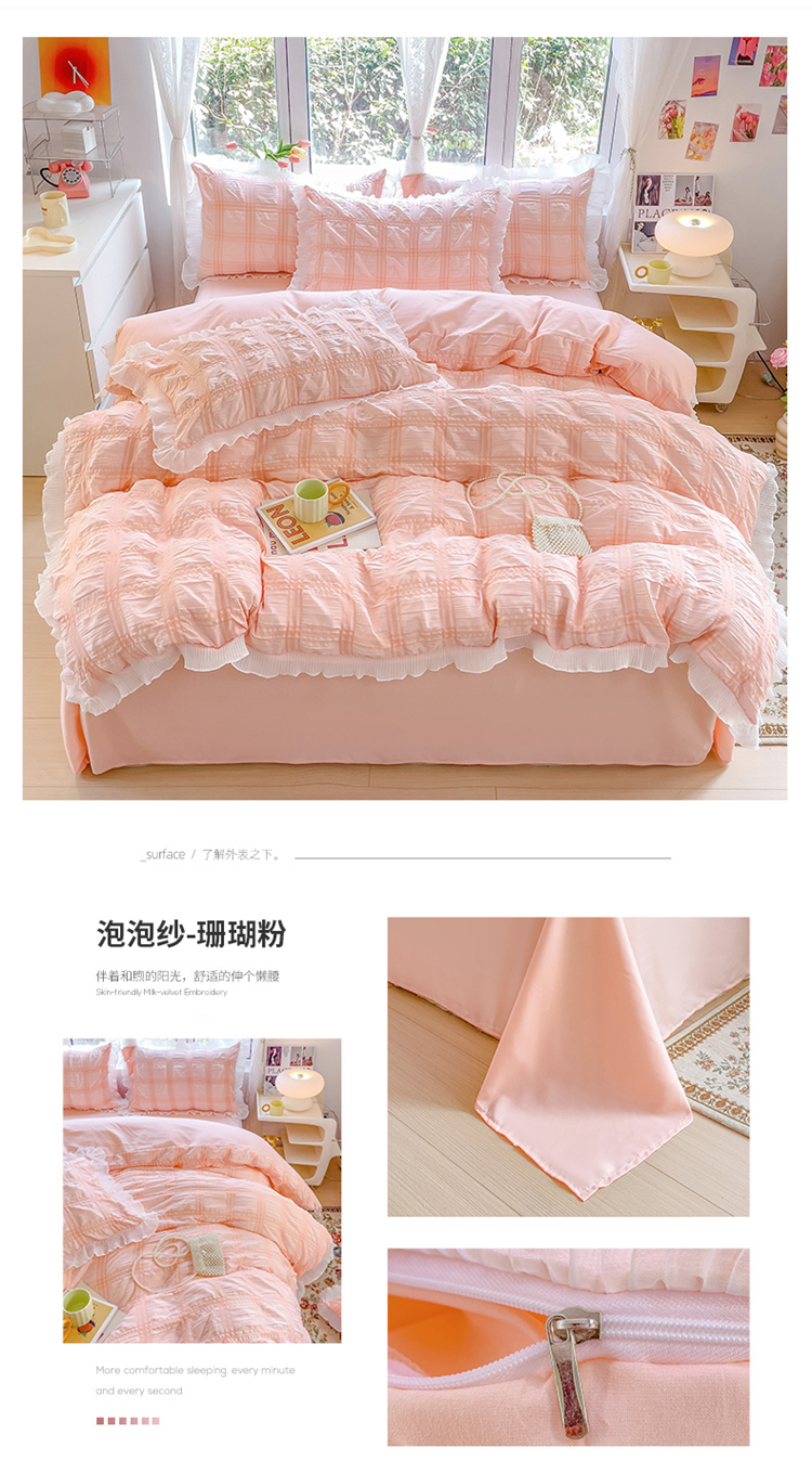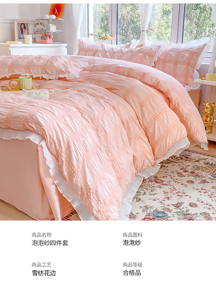 当前位置: 91家纺网 > 商品网购 > 床品套件 > 四件套 > 全棉普通四件套 > 大米2025新款家居韩版公主风泡泡纱雪纺花边四件套 泡泡纱-珊瑚粉